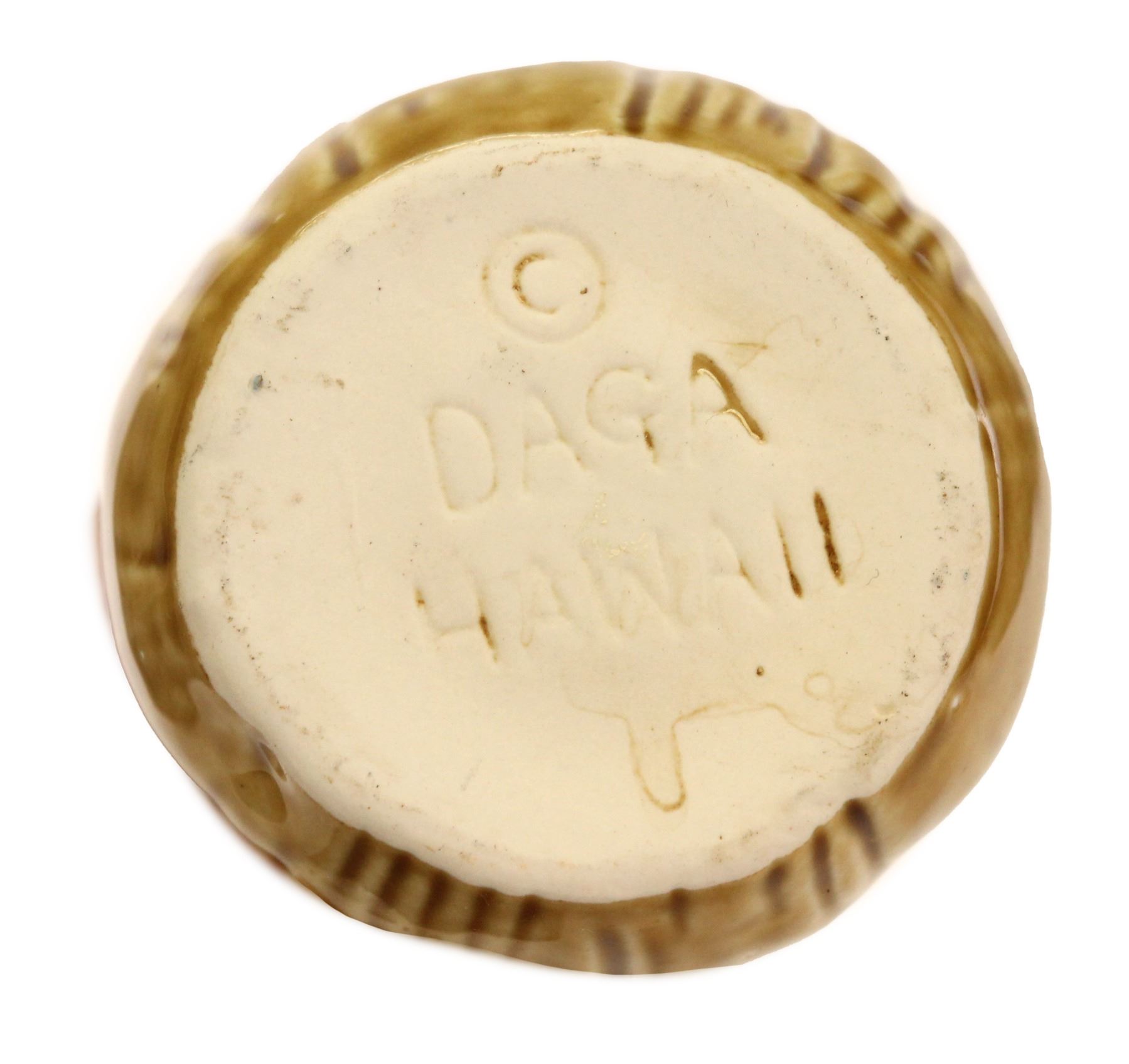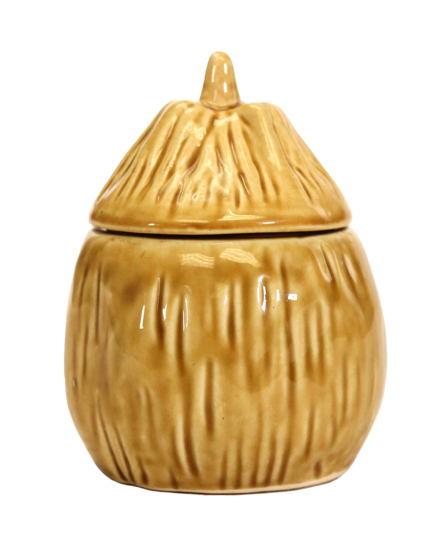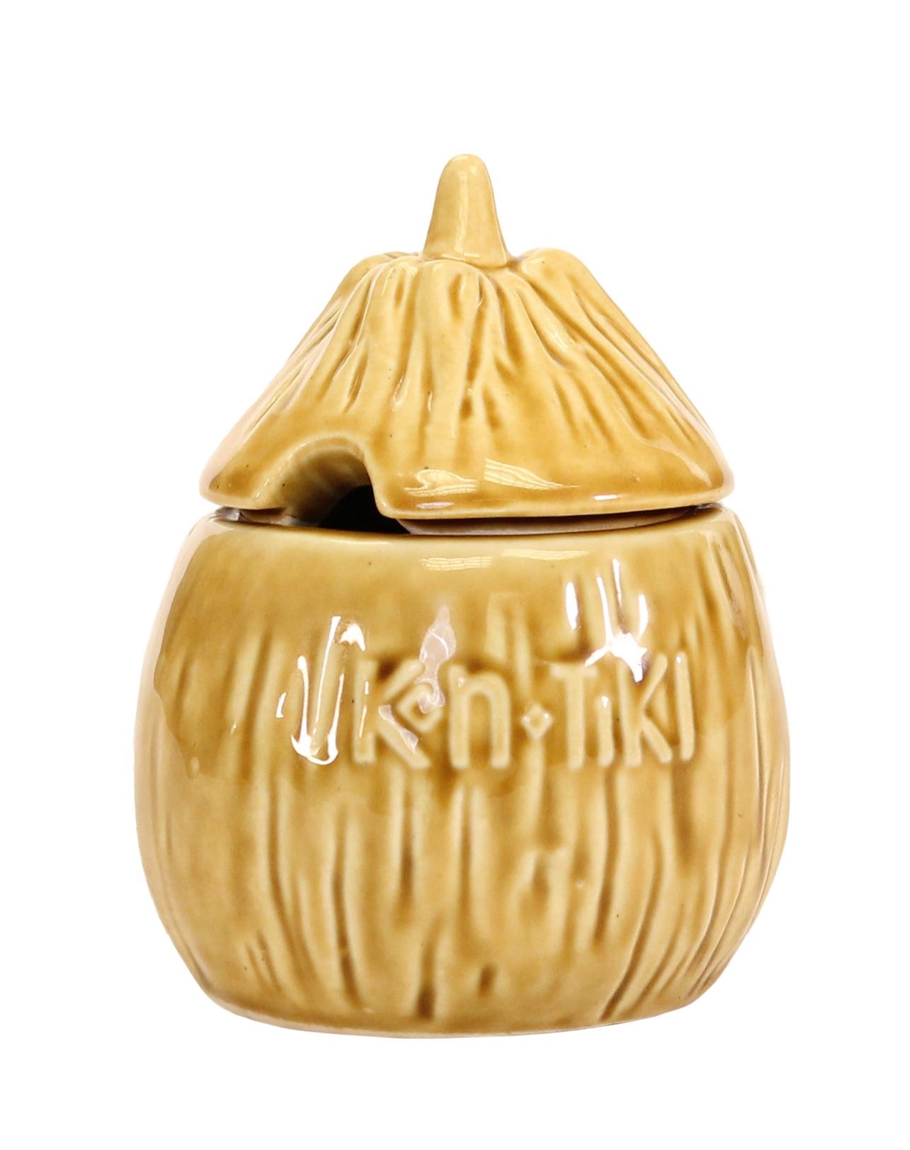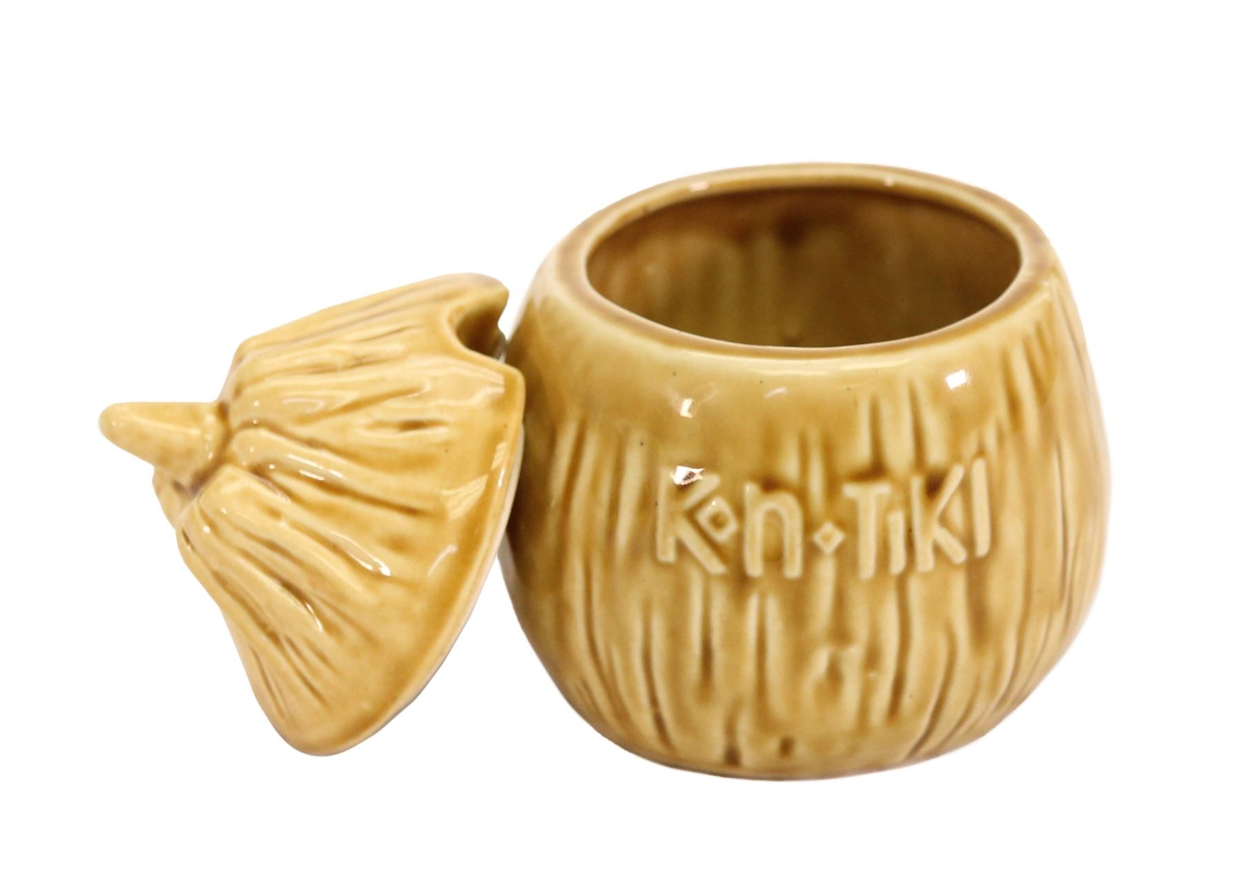 (1960s) An original ceramic sauce pot from the Oakland, CA famous Kon-Tiki bar and grill.Tan colored, high gloss, solid ceramic piece comes with removable lid. Imprinted with Kon-Tiki logo and spoon opening in lid. Pot 3"x4" w/ Lid 5"x4". VG+.