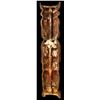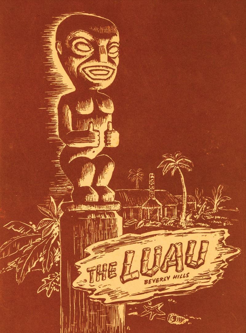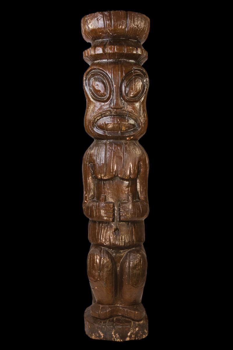 (1953) A most historic tiki, two of which flanked the entrance to Steve Crane's The LUAU in Beverly Hills, CA. This figure dates back to the venue opening in 1953. The LUAU can be considered one of the first restaurants of the TIKI ERA, the second wave of the 20th Century Polynesian Pop movement. The tikis and other misc decor during the early years of The LUAU were created by Jerry Janek, an accomplished set builder at MGM Studios during the golden era. Janek created much of the faciful set pieces for The Wizard of Oz (1939). The figure, one of only two made is composed of a mix of gypsum plaster, straw and burlap, a technique commonly used by Hollywood during the early years as it was very carvable and somewhat stable. Another historic artifact in the world of Tiki! Please be aware that this is rather fragile and will require very special crating for shipping at substantial cost.85"x19"x11".VG+ with typical wear.