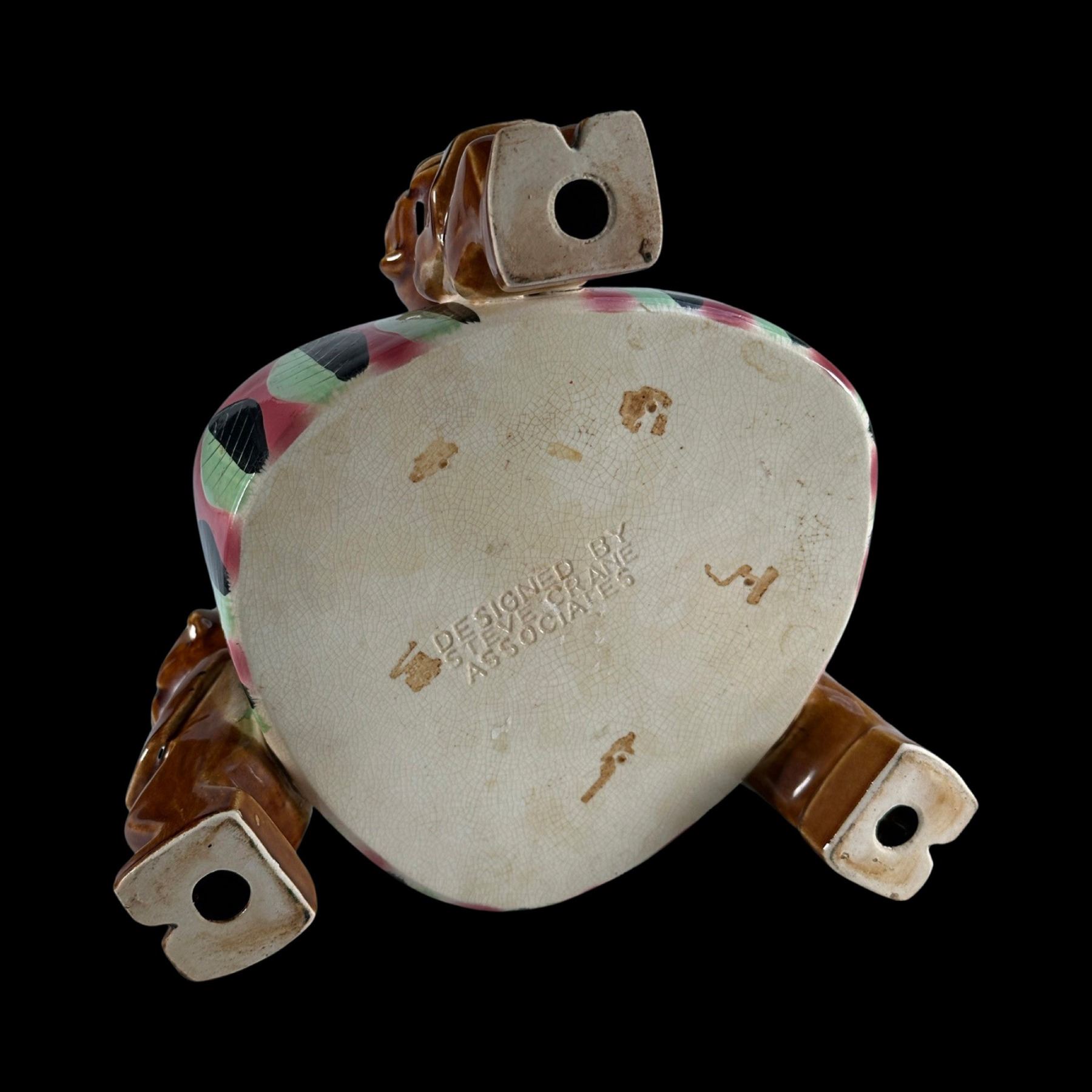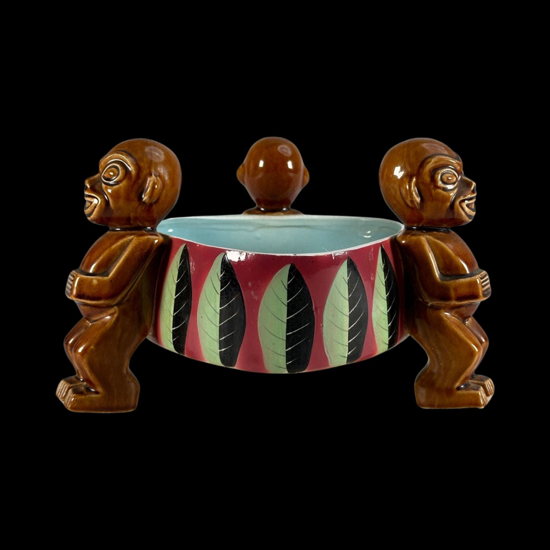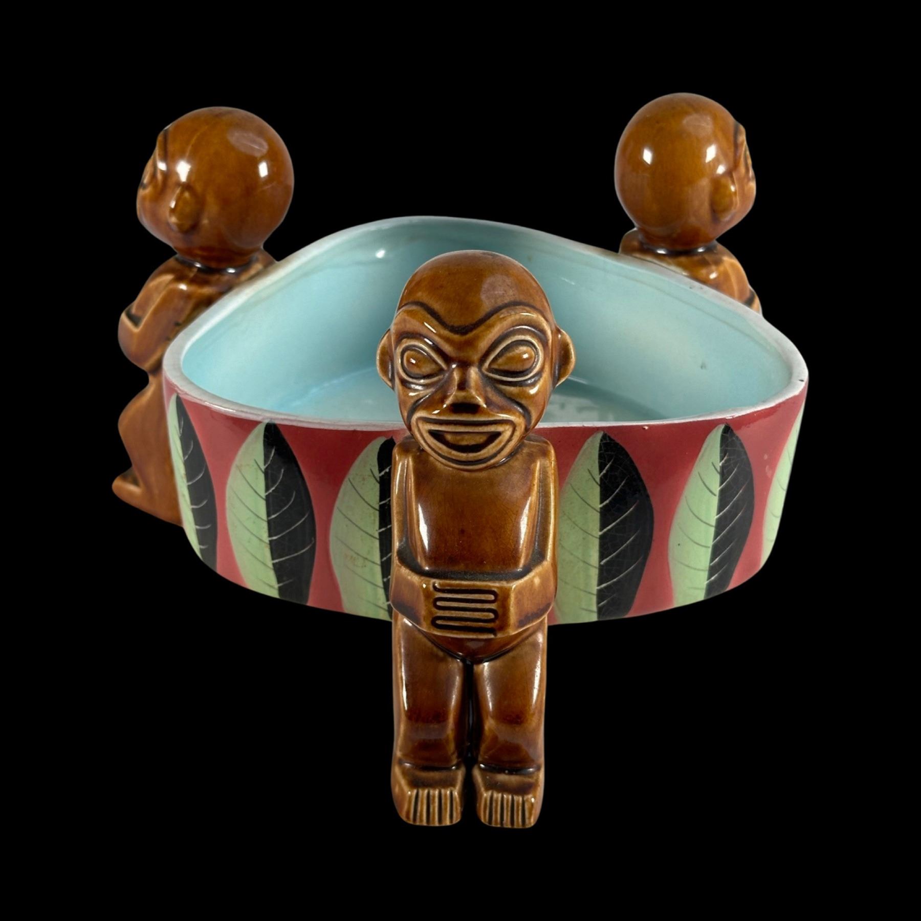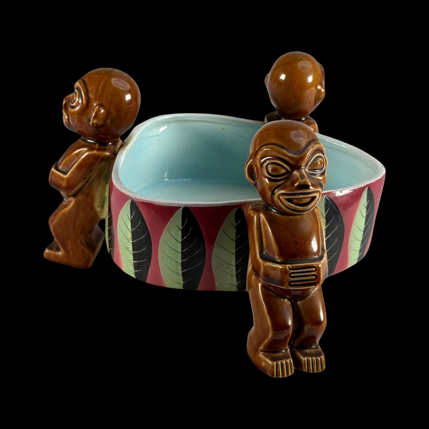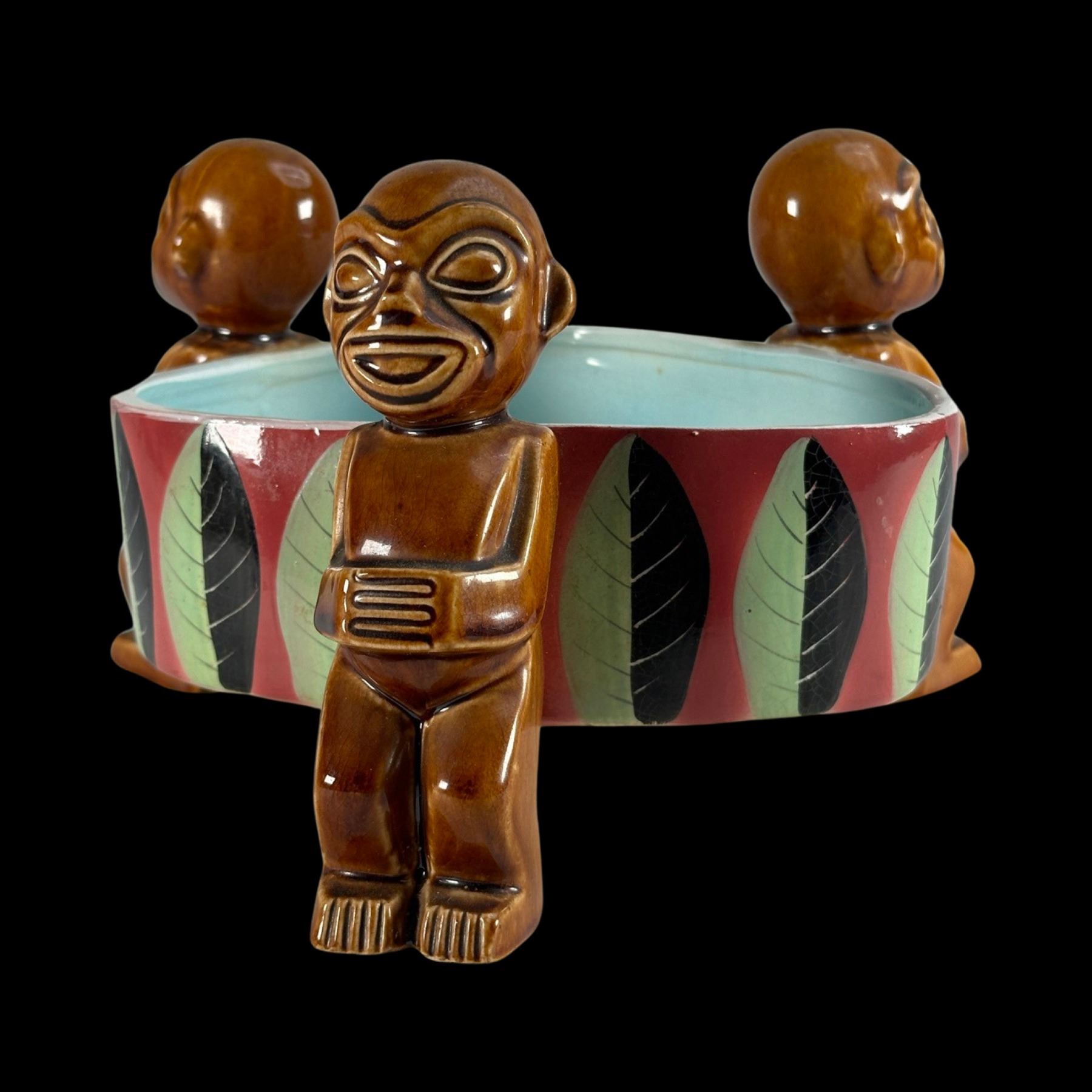 (1950s) Certainly one of the most iconic bowls to come out of the genre. Designed by Florian Gabriel and produced by HF Pottery. The hand paint work on these is the type that simply could not be replicated again in commercial production. Much larger than the Trader Vic's Tri-Marquesan bowls out of OMC. VG+ with typical wear. 8.5"dia x 5.5".