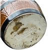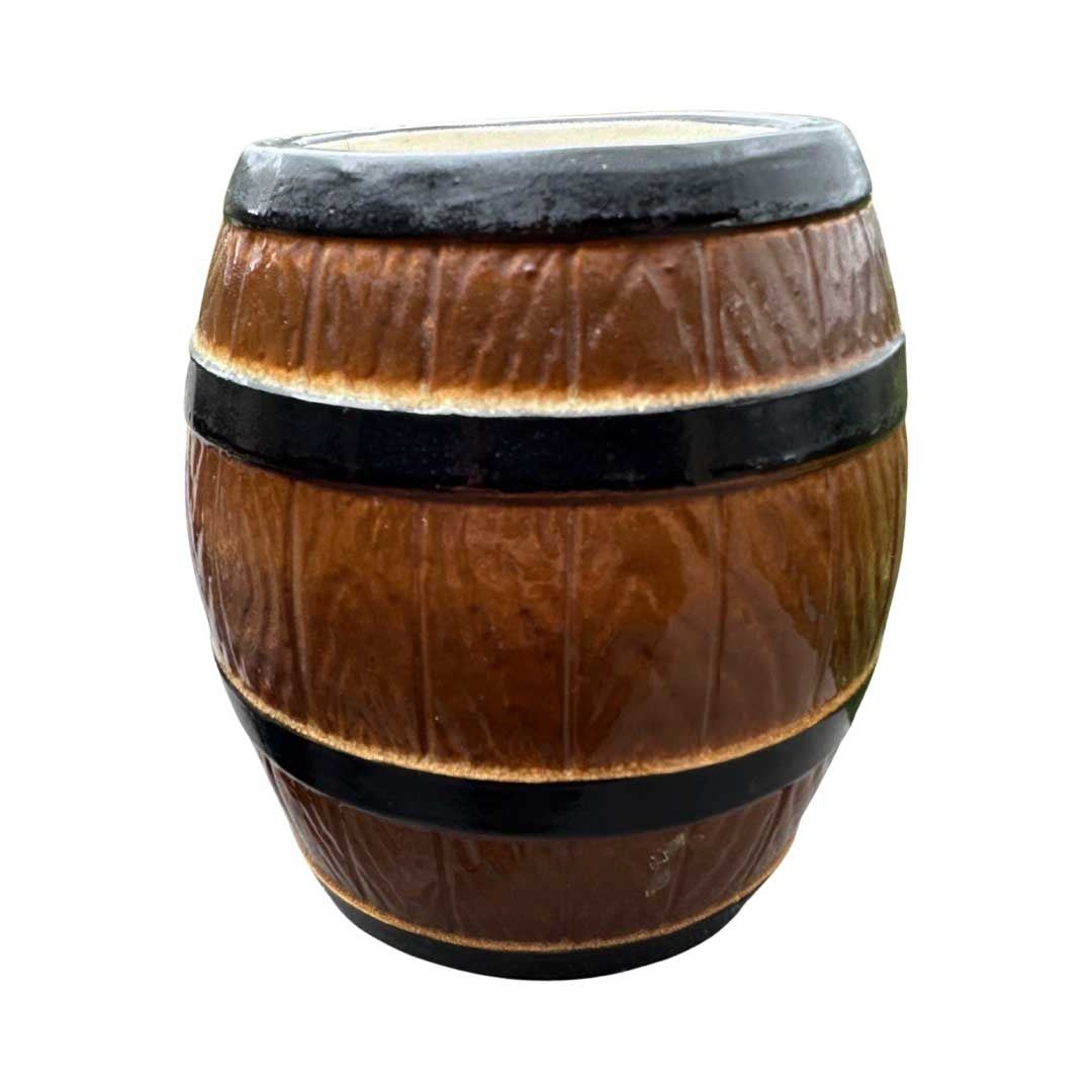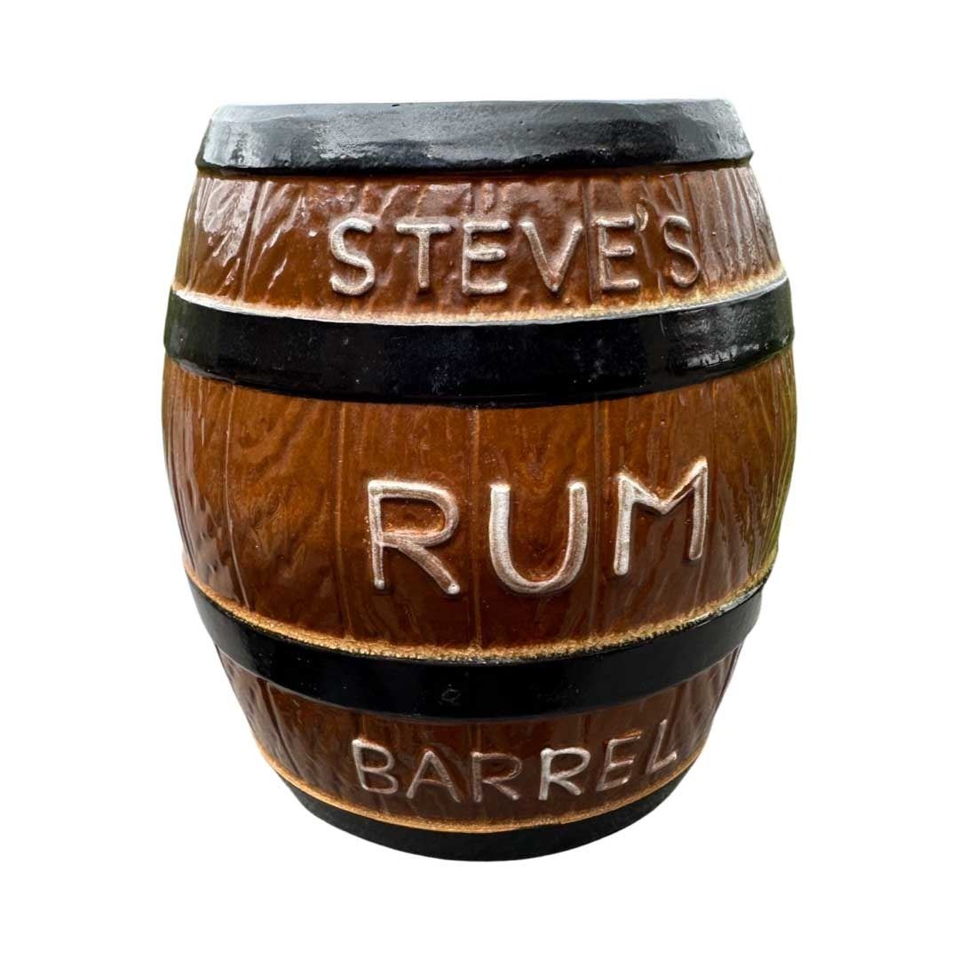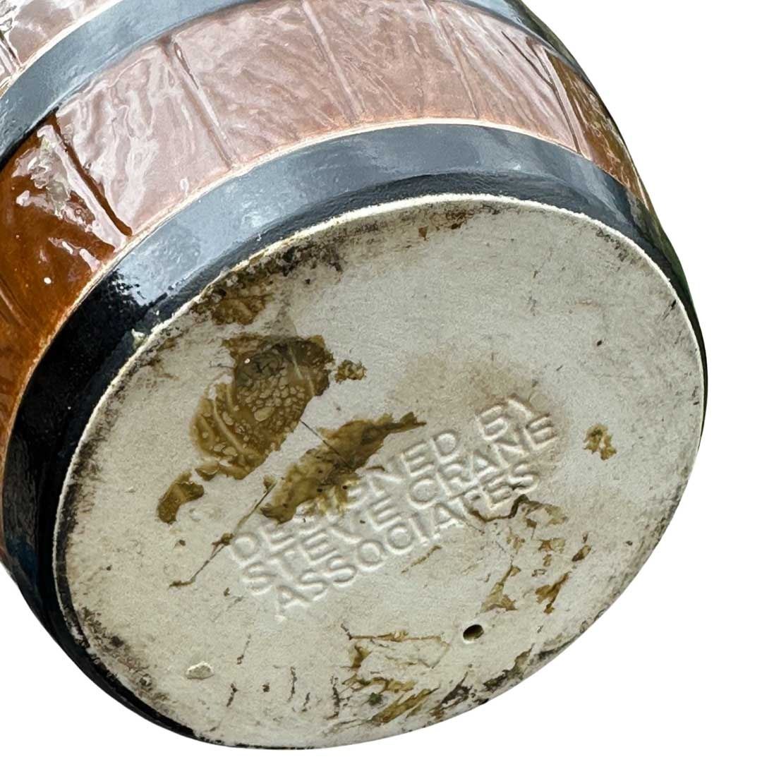 (1950s) A substantial mug produced by HF Pottery for Steve Crane & Associates for the famous "Steve's Rum Barrel" cocktail at The Luau and various Crane venues such as Kon Tiki and Kon Tiki Ports. It's double walled so was used in the serving of hot beverages such as Hot Buttered Rum and Coffee Grogs. This mug is rather scarce and not easily found. 5"x4.5". VG+ with light stress crack in the top rim that does not run through.