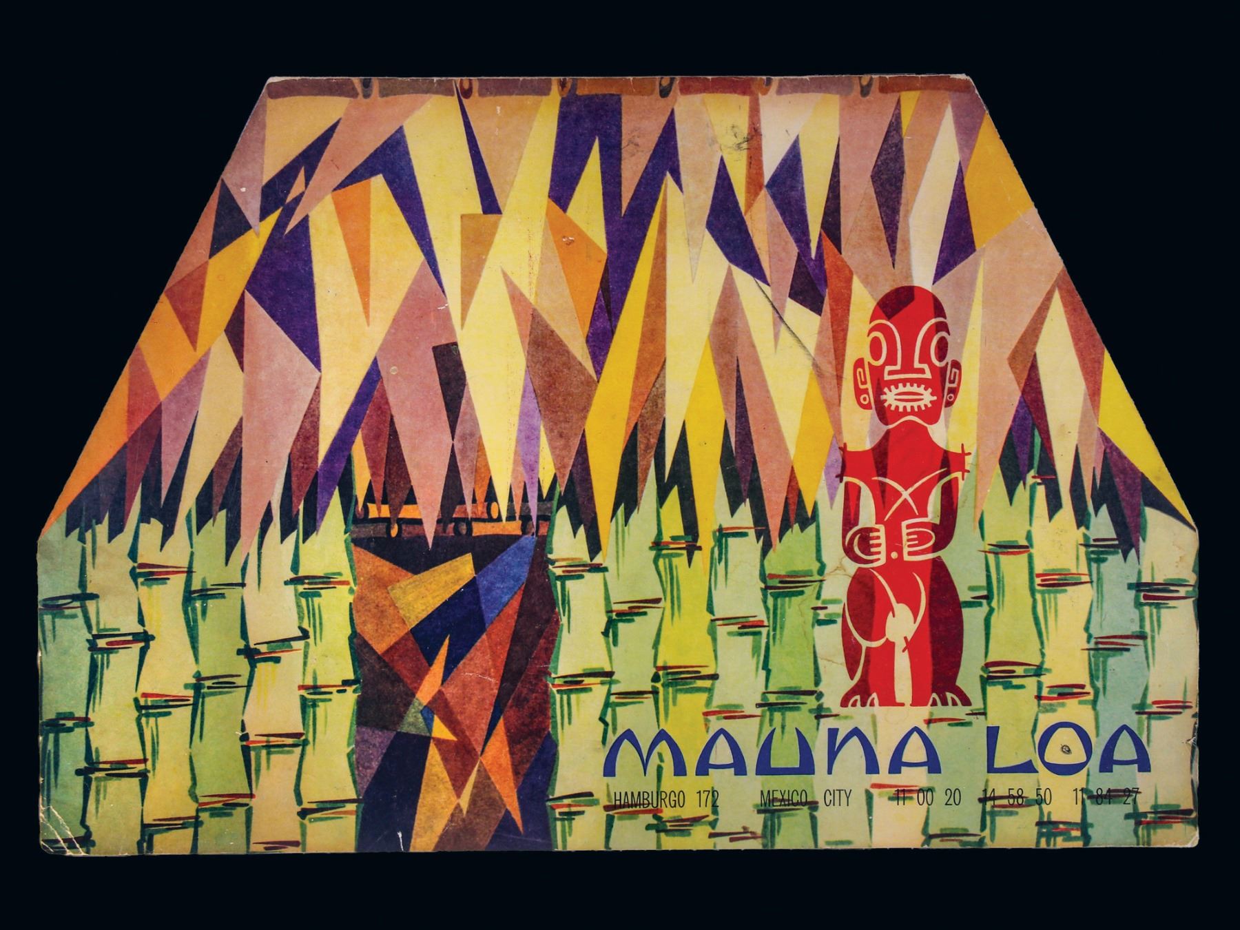 (1950s) One of the most fabled Tiki restaurants to have existed. The Mauna Loa in Mexico City was a venue in which very little was spared in the way of immersive and innovative decor. Its elaborate nature is eluded to in this fabulous menu, filled with stunning color illustrations of exotic food and drink. One of the more scarce menus. VG+ with minor wear to corners. 18.5"x12.25" closed.