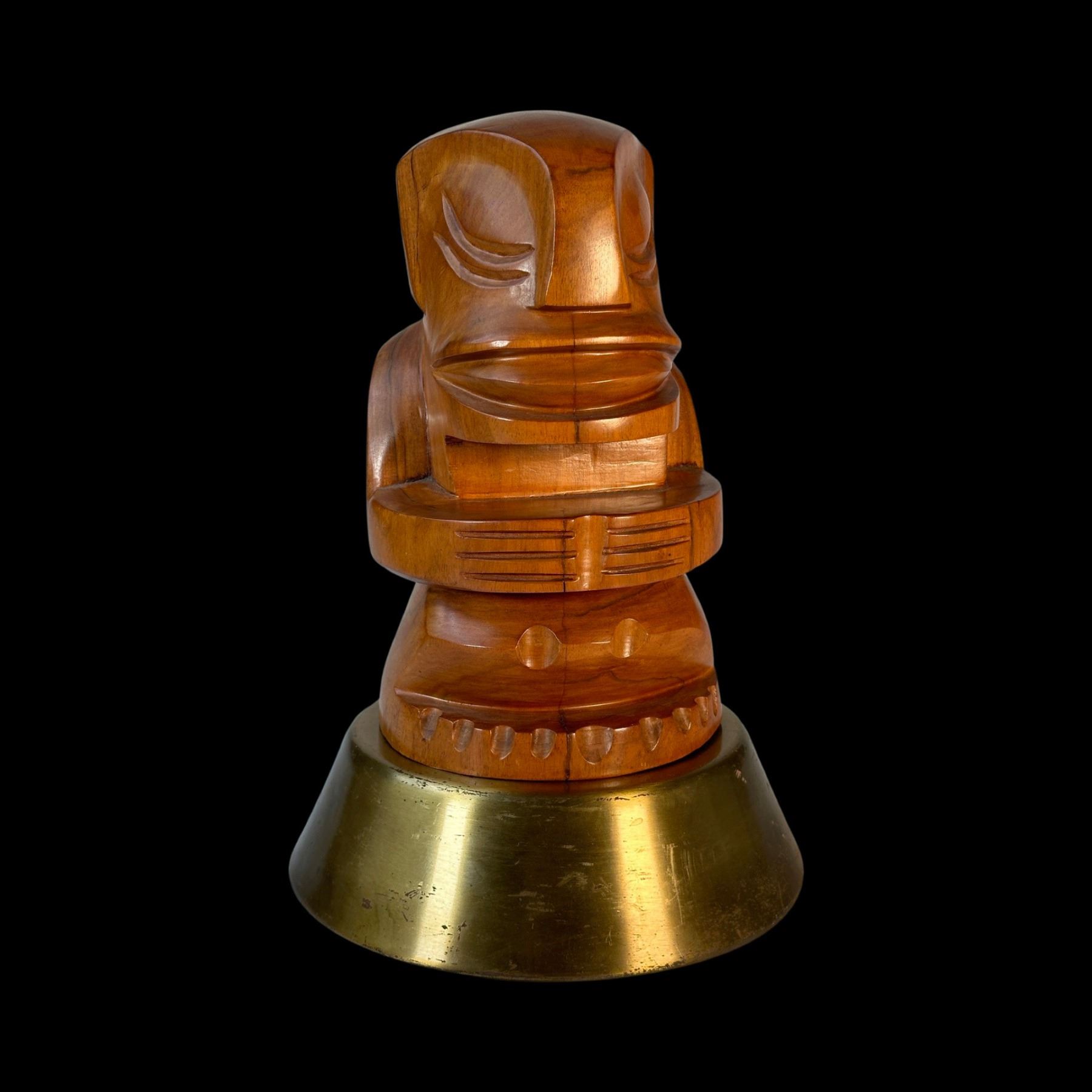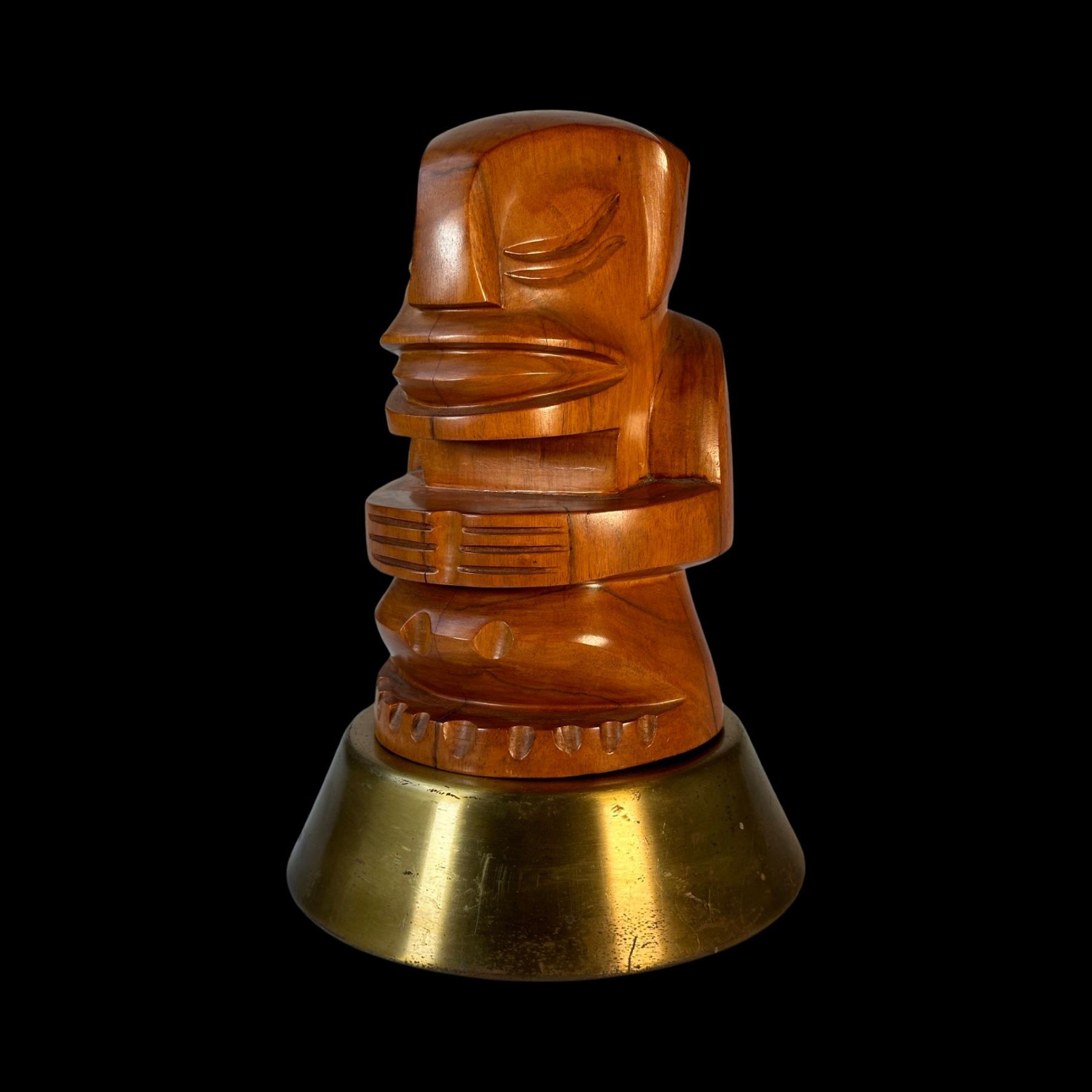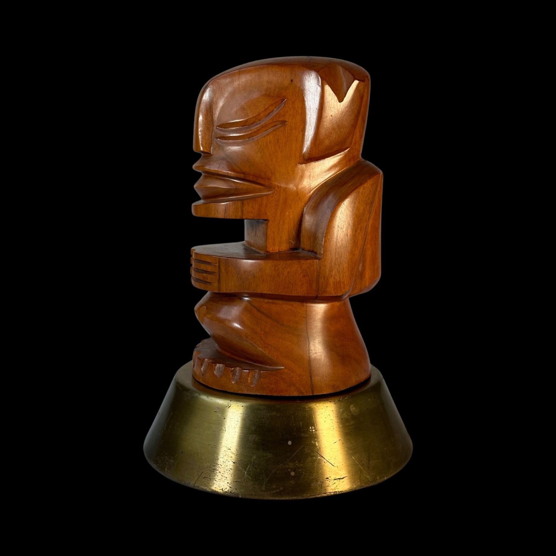 (1950s) A simply striking Tahitian cannibal type figure. Carved in a polished hardwood, the unique design is mounted on a spun brass base. A trophy worthy of the finest Tiki bar! Overall VG+ with minor wear to the carving and the base. 6.5"dia x 10.5".