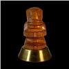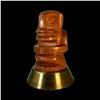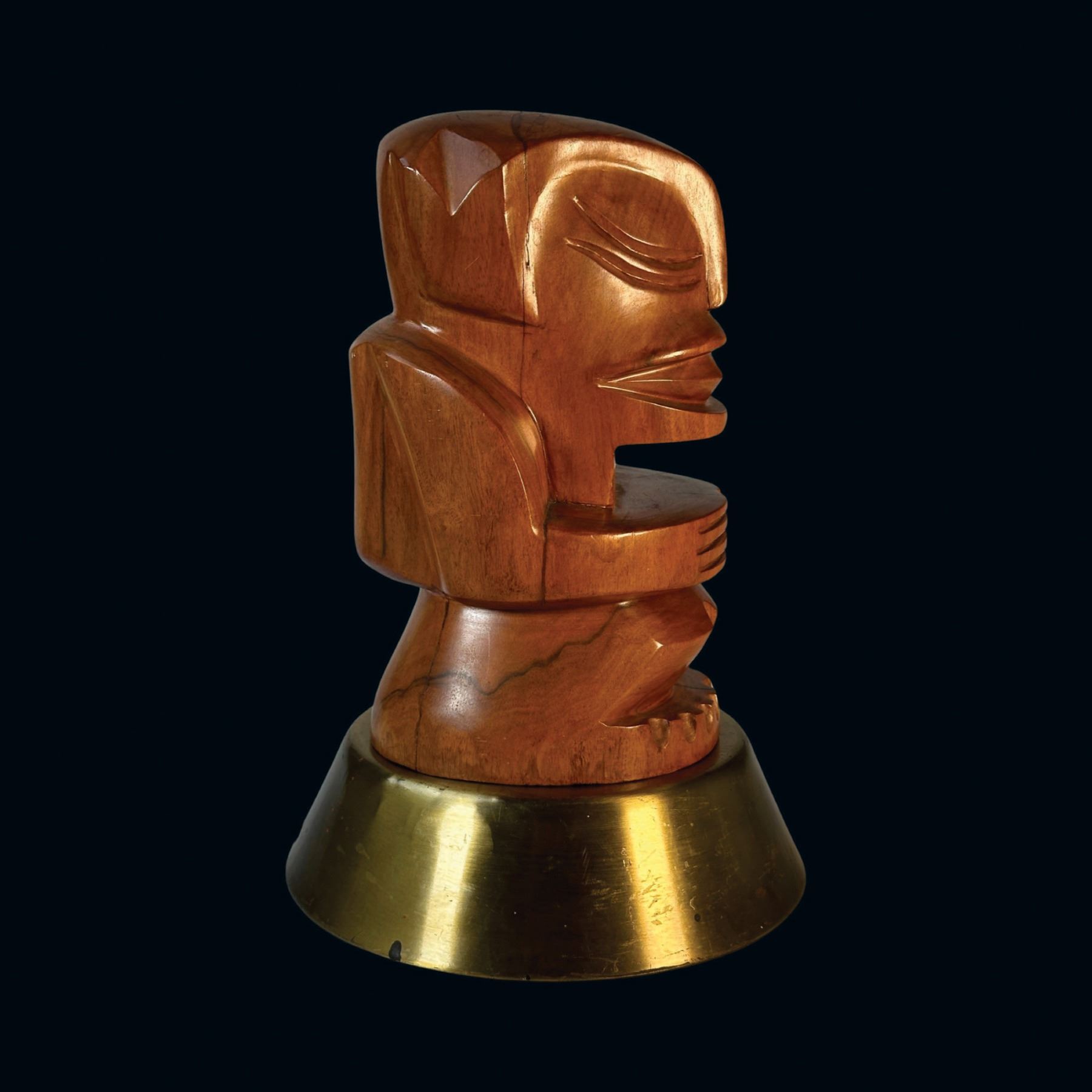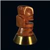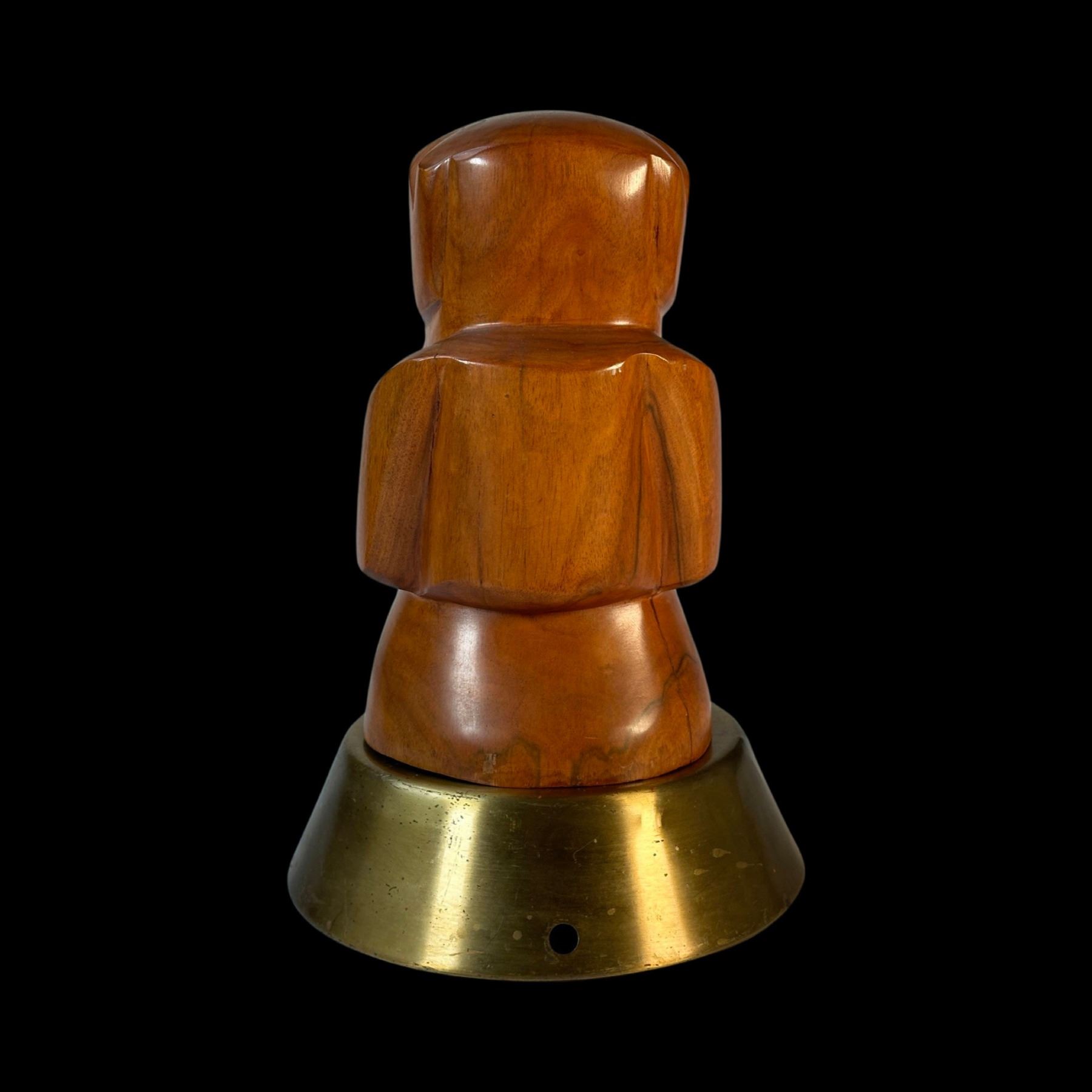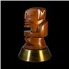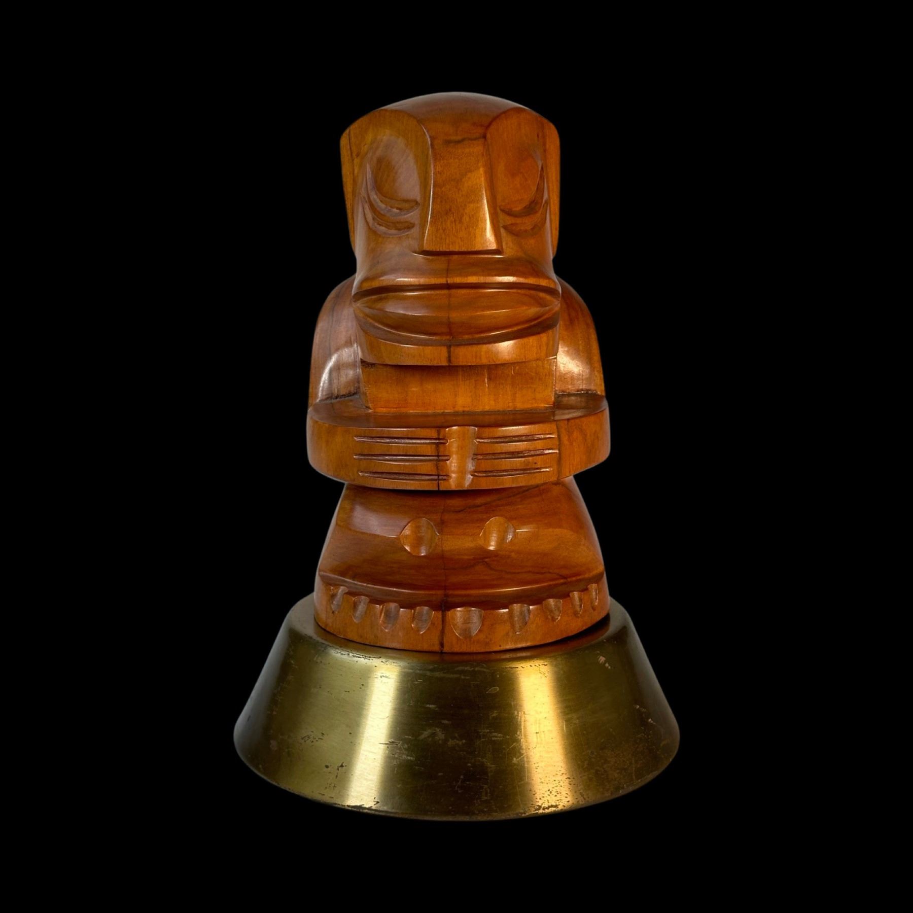 (1950s) A simply striking Tahitian cannibal type figure. Carved in a polished hardwood, the unique design is mounted on a spun brass base. A trophy worthy of the finest Tiki bar! Overall VG+ with minor wear to the carving and the base. 6.5"dia x 10.5".
