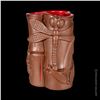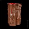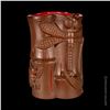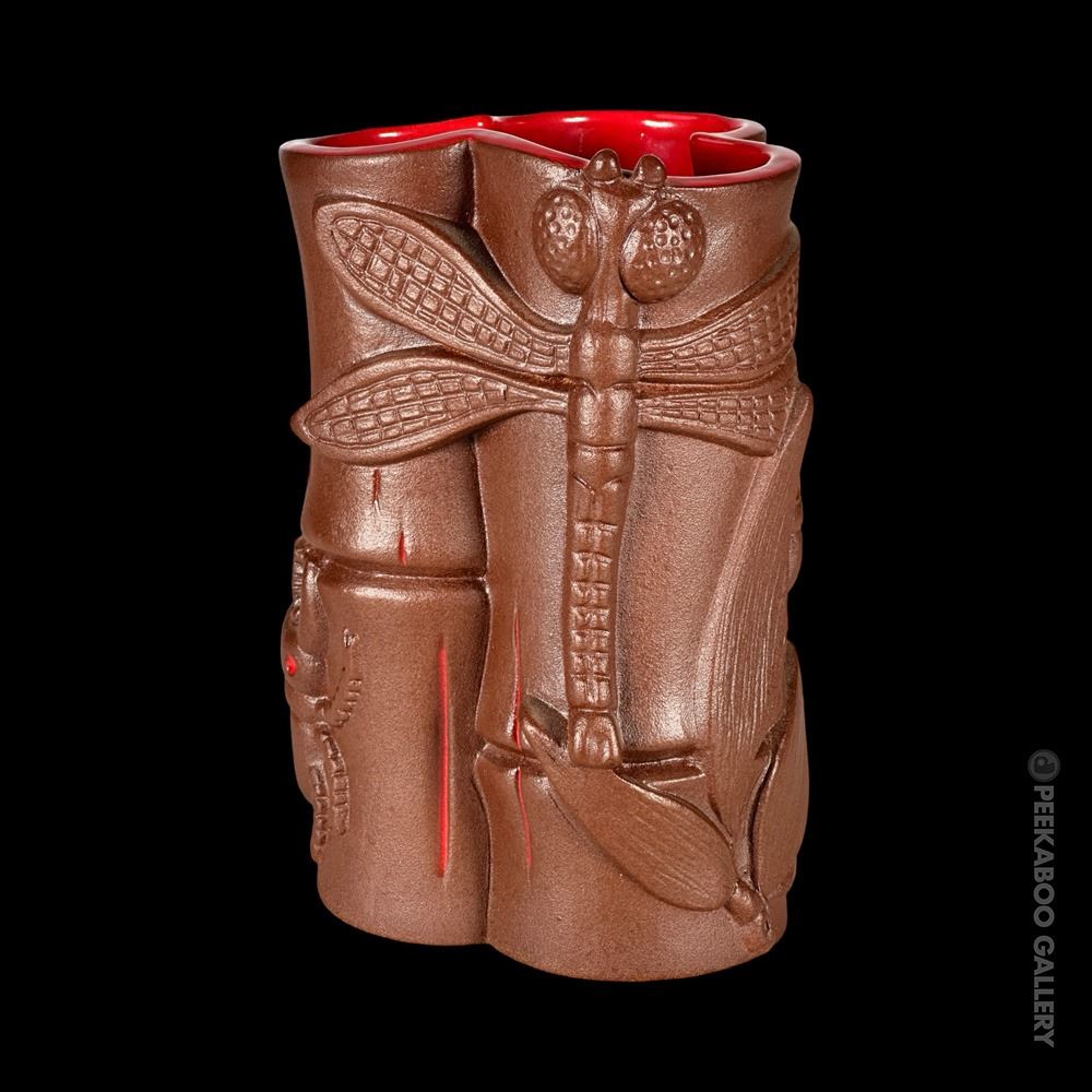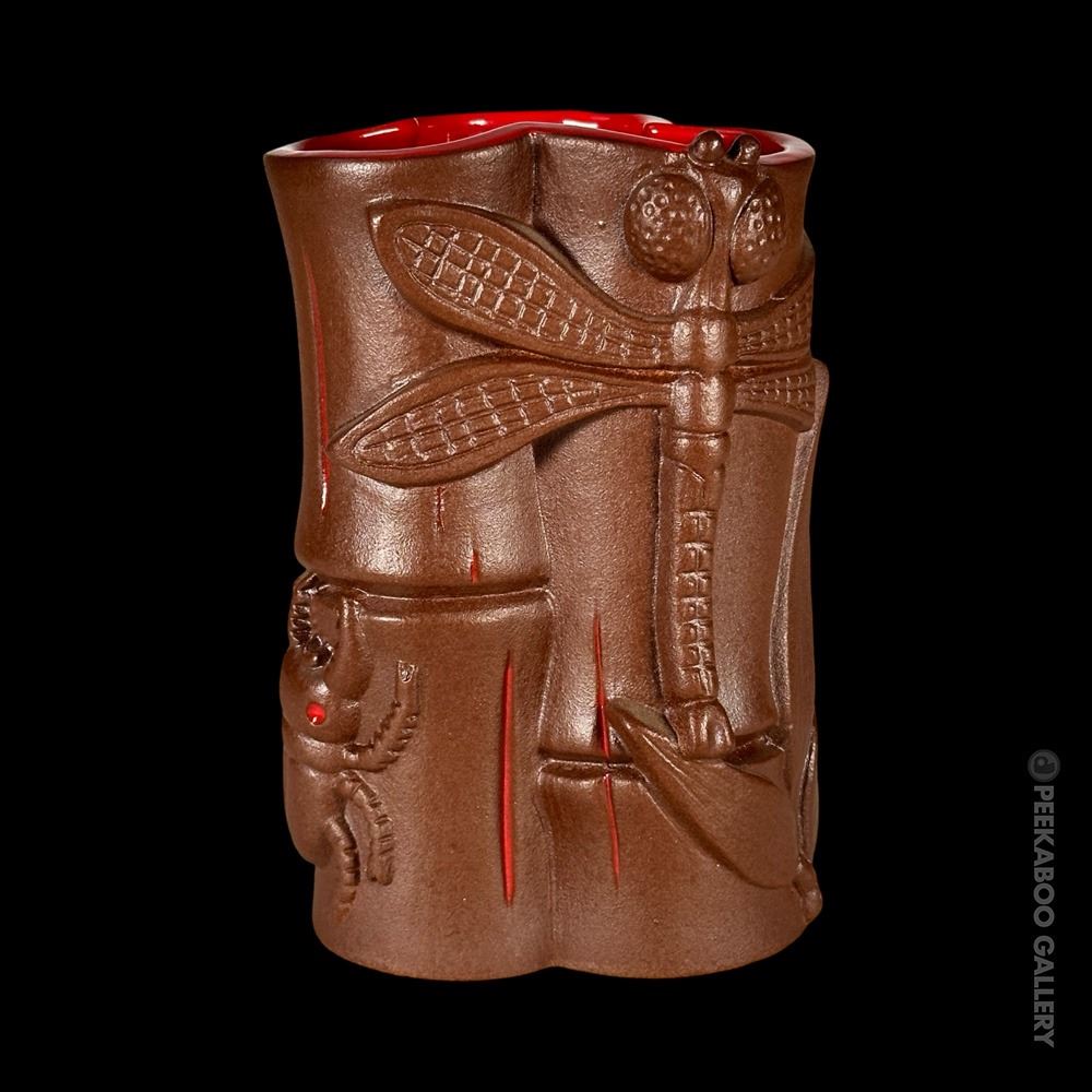 (2016) Designed by Bwana Spoons and produced by Munktiki. Numbered 1 of only 25 in this glaze. This is a mug shaped like bamboo with leaves, beetles, and a dragonfly clinging to the sides. VG+. 7.5"x5"dia.