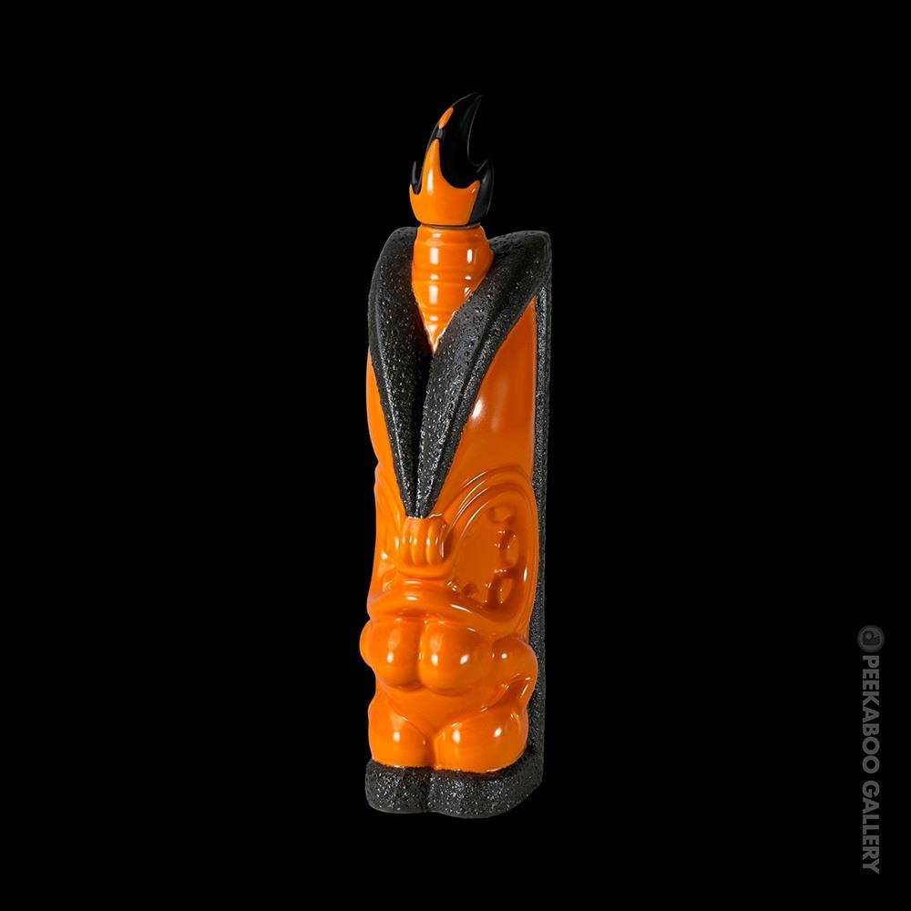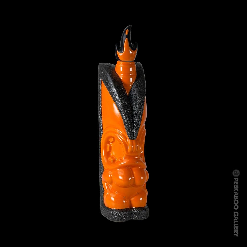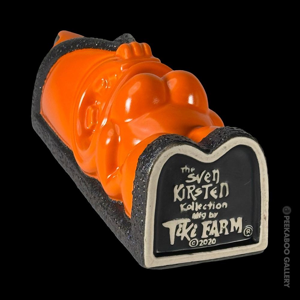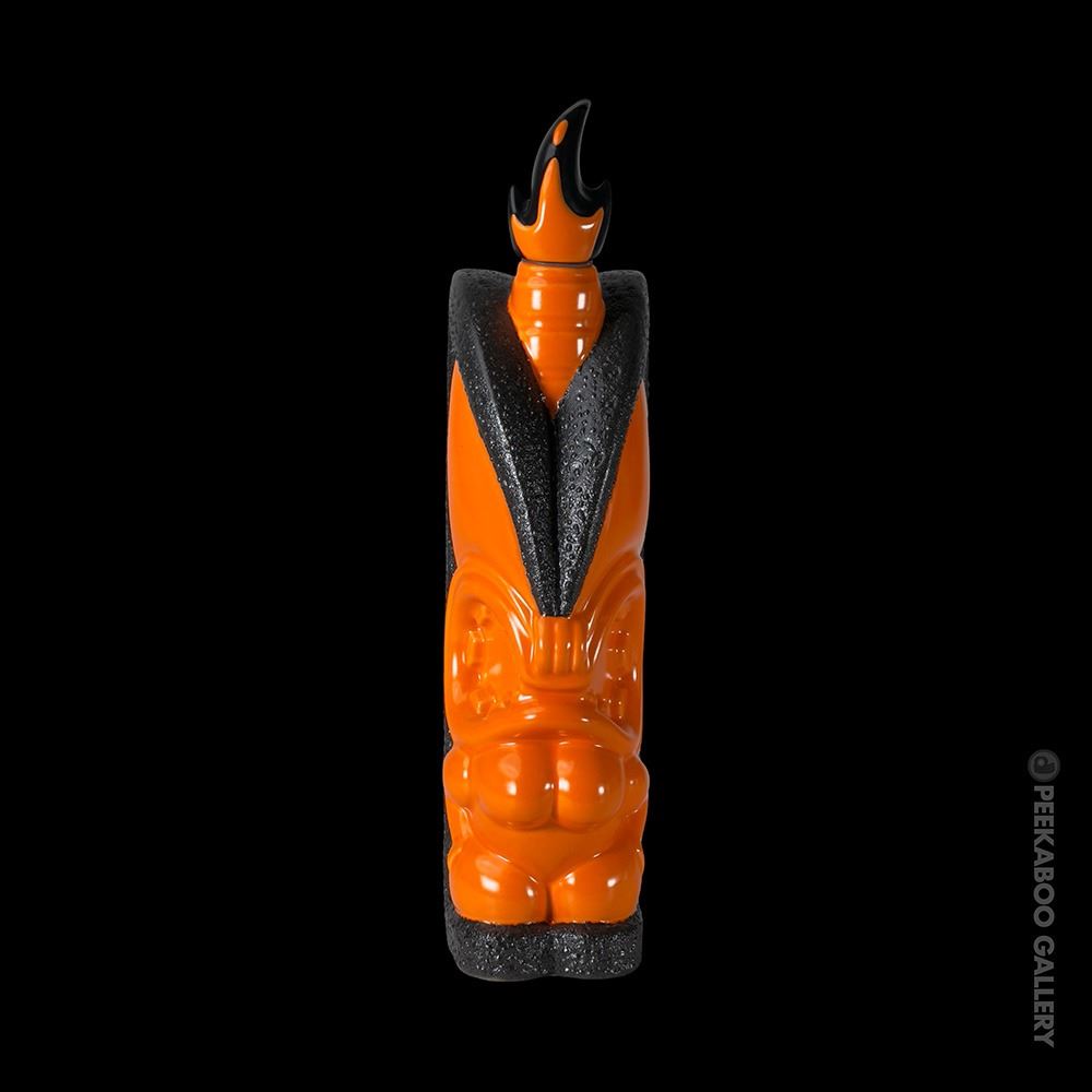 (2021) The Orange edition of this handsome decanter produced by Tiki Farm for The SVEN KIRSTEN KOLLECTION series. This piece was made in homage to an artifact in Sven's kollection which he acquired during the famous 1994 "urban archeology" expedition to THE TIKIS II abandoned theme park in Lake Elsinore, CA. There, Sven acquired several pieces of THE TIKIS directly from creator, Danny Balsz. Sven can be seen chatting with Balzs holding the Pele carving in the Book of TIKI. Sven sold this piece in his SVEN KIRSTEN KOLLECTION auction with Peekaboo Gallery in 2024. There were three colorways of this decanter: black, purple and orange. VG+ in original box. 14"x3.5"dia.