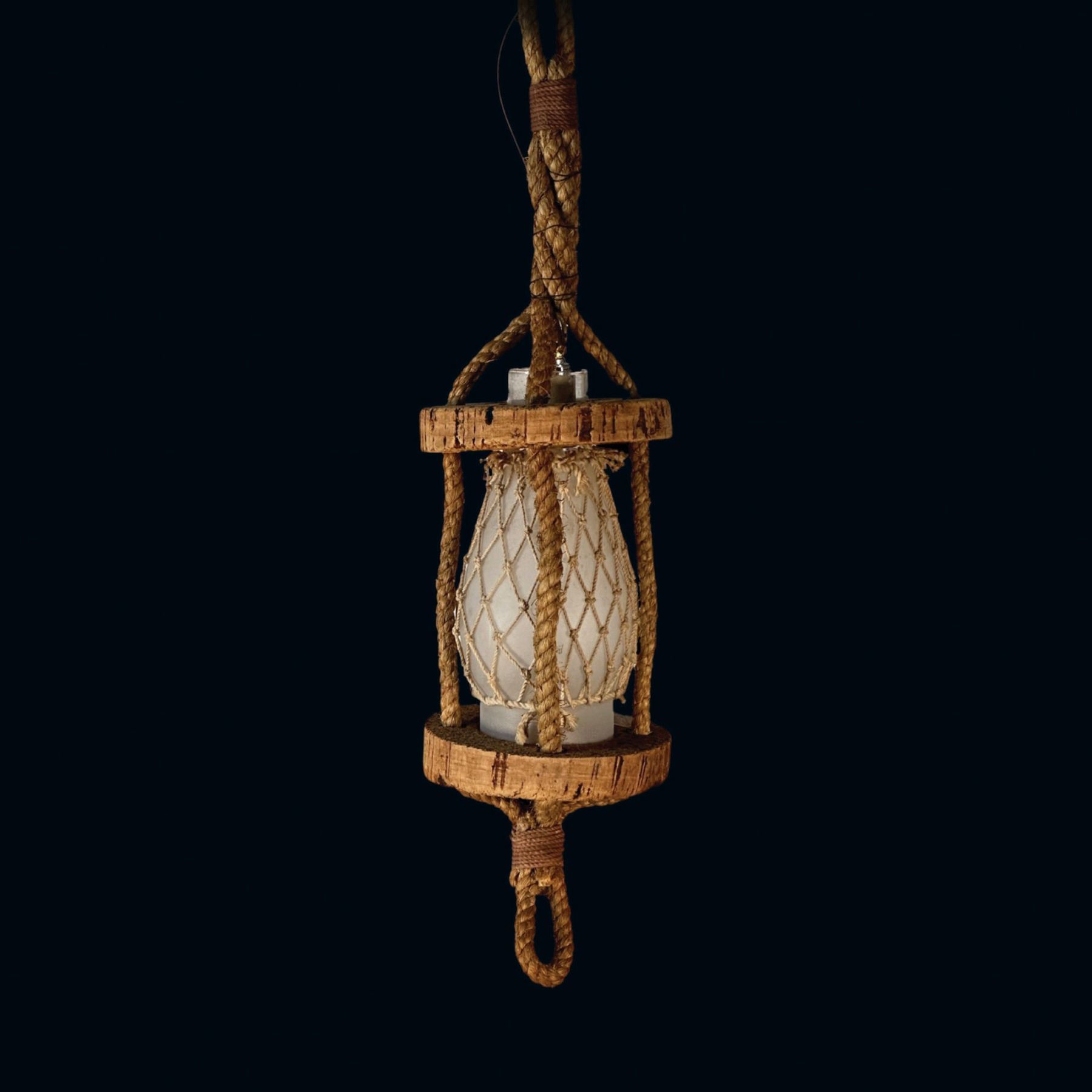 (1990s)* Lamp from on Sven's Tiki Rum Lanai. Also used as decor for the rain hut at the Catalina Museum exhibit. Glass unfortunately damaged but can be replaced. VG with crack in hurricane glass. 4.75"dia x 20".