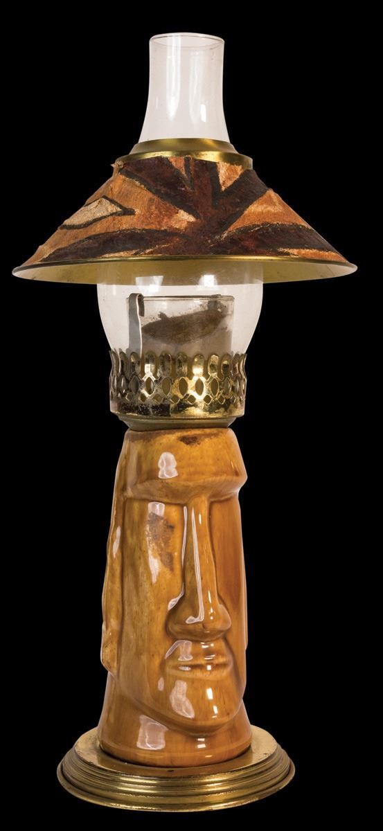 (1960s) OA experimented with repurposing different commercially available products for a lower price-point option for their clients. Here we see a Beauce Pottery Maoi mug retrofitted for use as a lamp base.15"x7"VG+