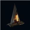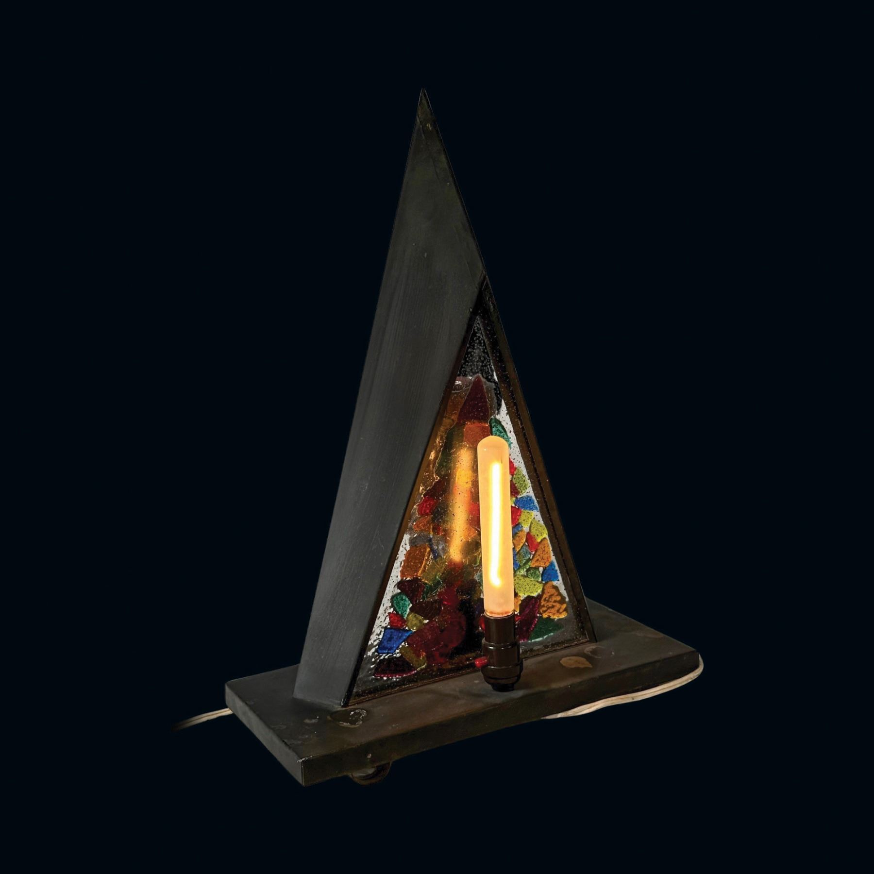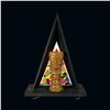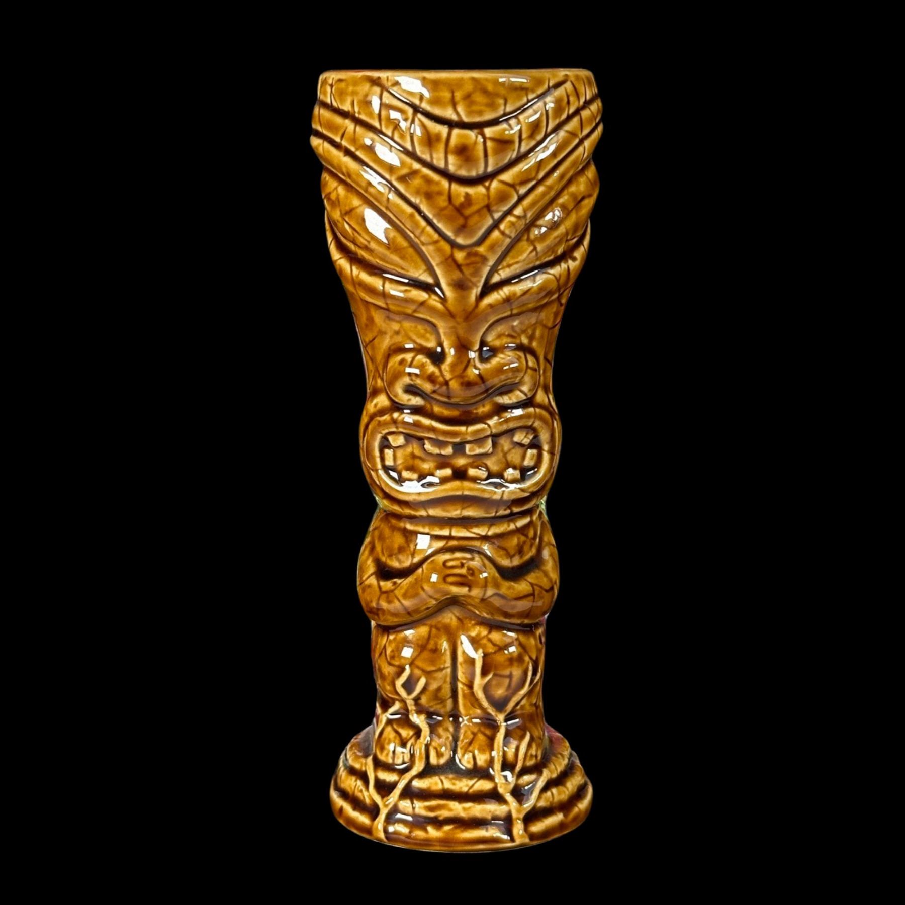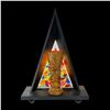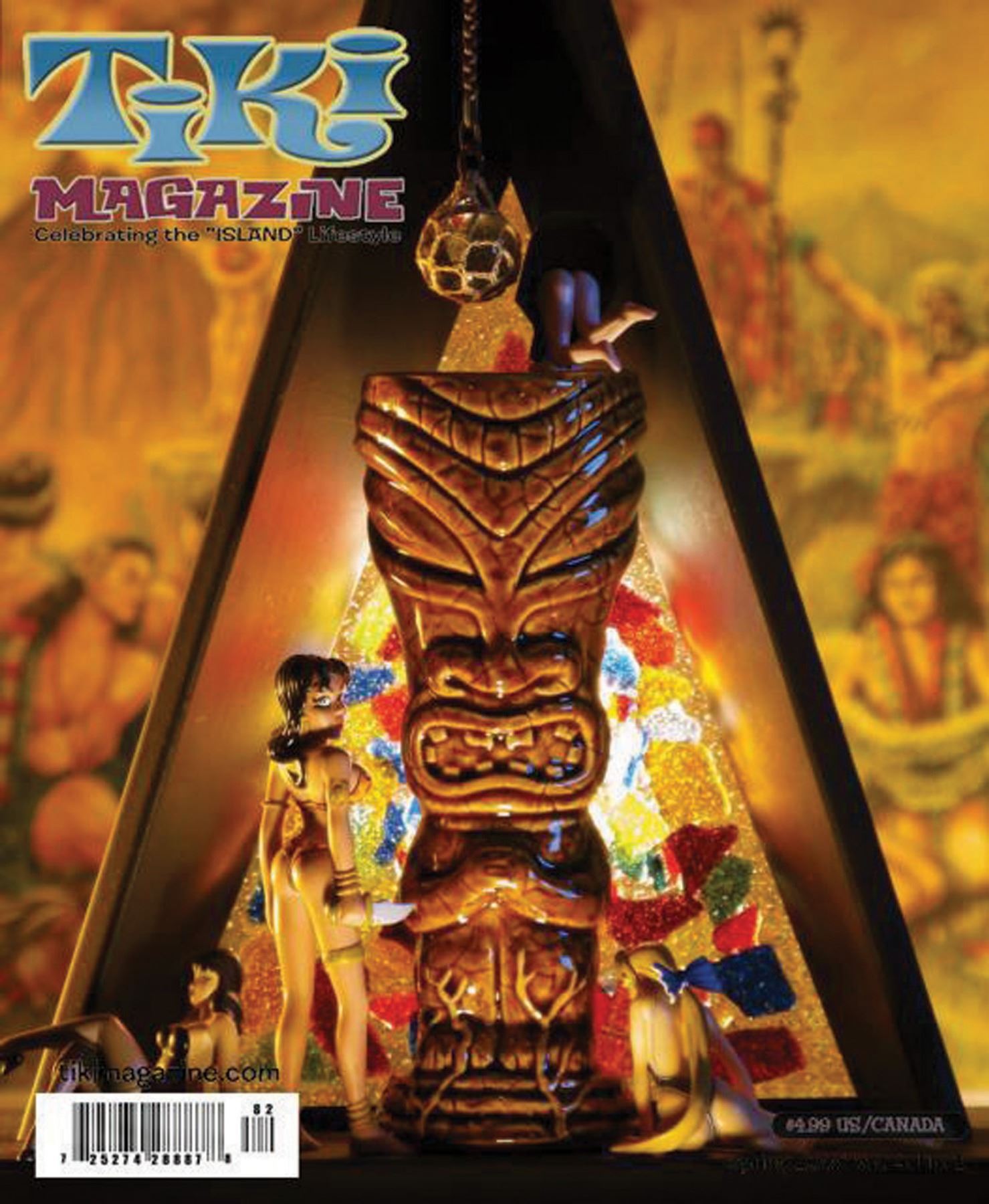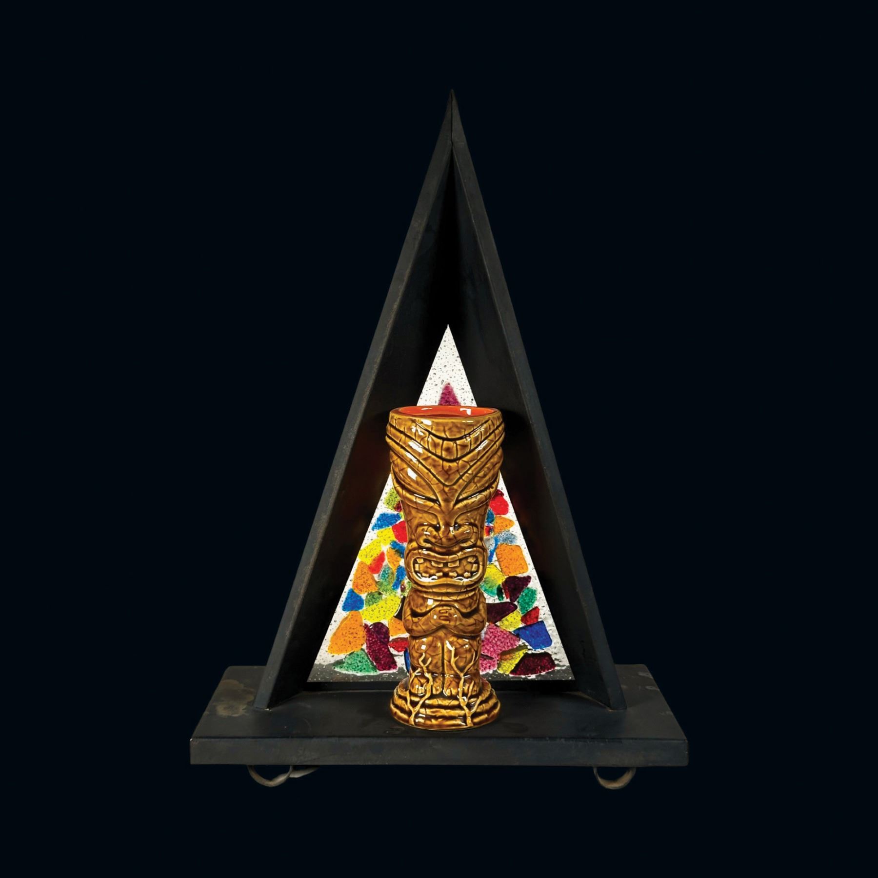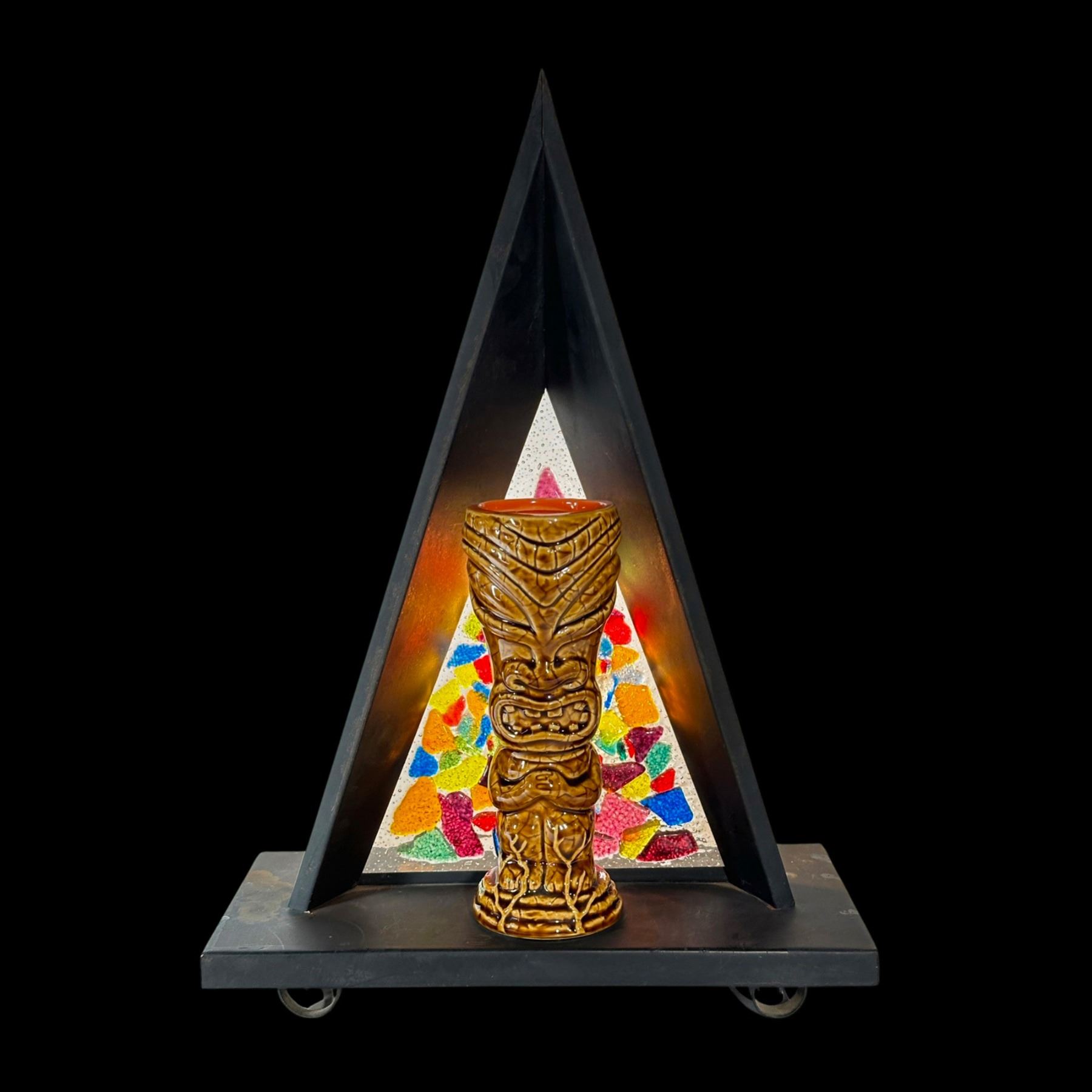 (2010)* A true "altar of Tiki"! The Book of Tiki 10 Year Anniversary mug in an A-frame altar with backlit resin mosaic. This imaginative display was created for a proposed cover of TIKI MAGAZINE upon the 10th anniversary of BOT. The metal, church-like altar with its stained glass lights up. The mug itself is long sold out. This graced the mantle at Sven's study in his home. VG+. 12"x17"x5.75".