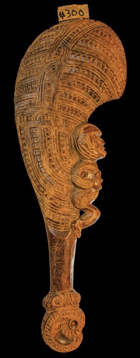 (1960s) This is an incredible piece! The intricacy of the carving in this master is simply beautiful. Carved on both sides in nicely grained hardwood, perhaps mahogany. The spindle mount is carved out of the original wood. There is a chip missing from the bottom spindle chock, seperate from the hilt itself. This design, based on an original encountered in Tahiti, is one of the gems of the original OA catalog...This original master is even more so.32"x11"VG with wear