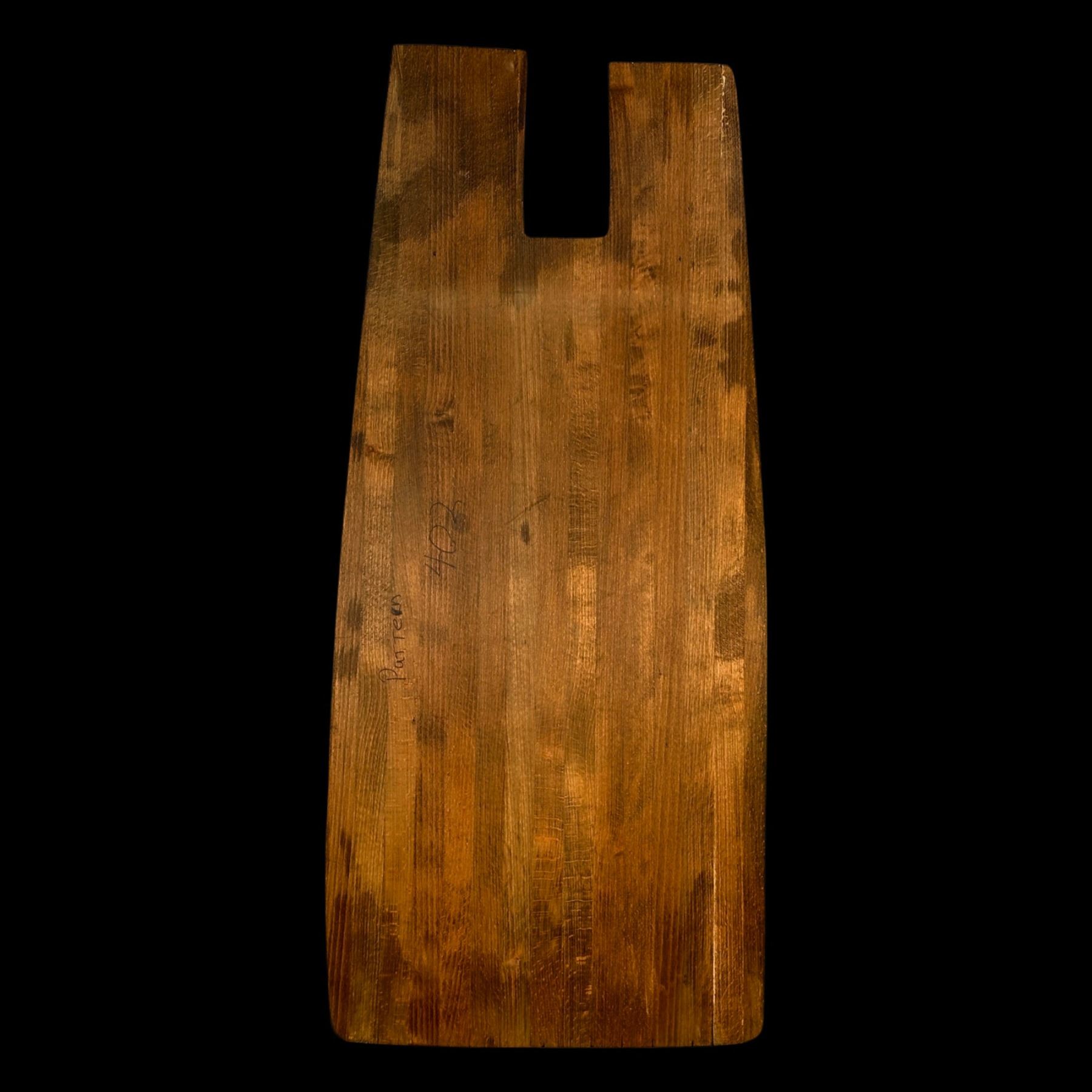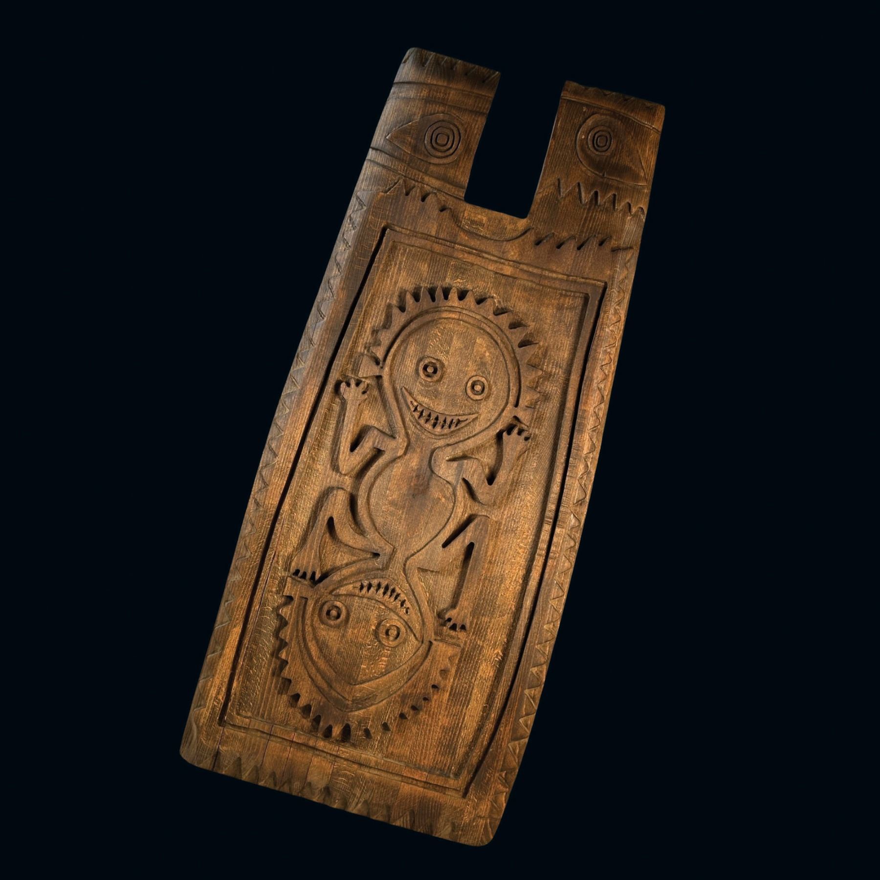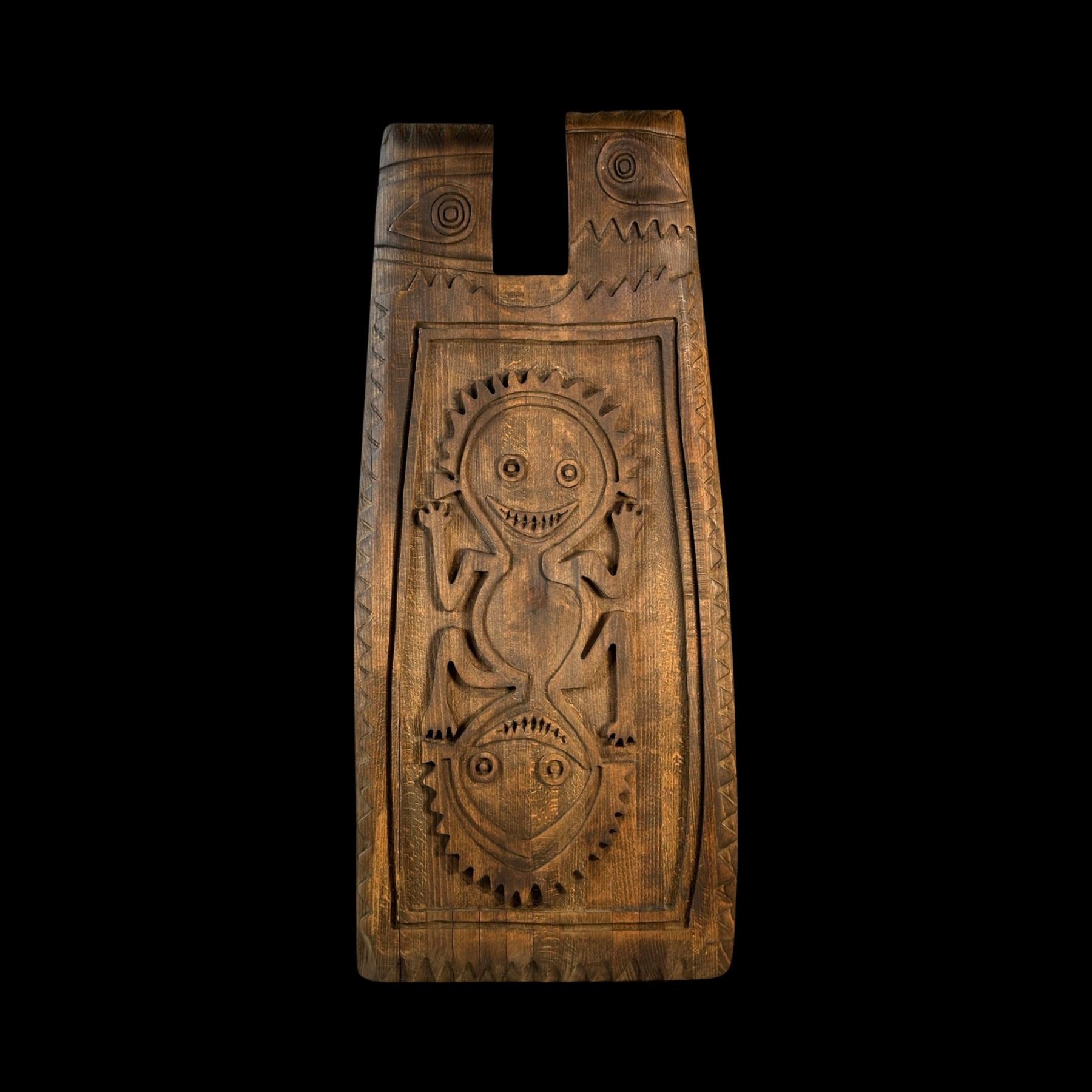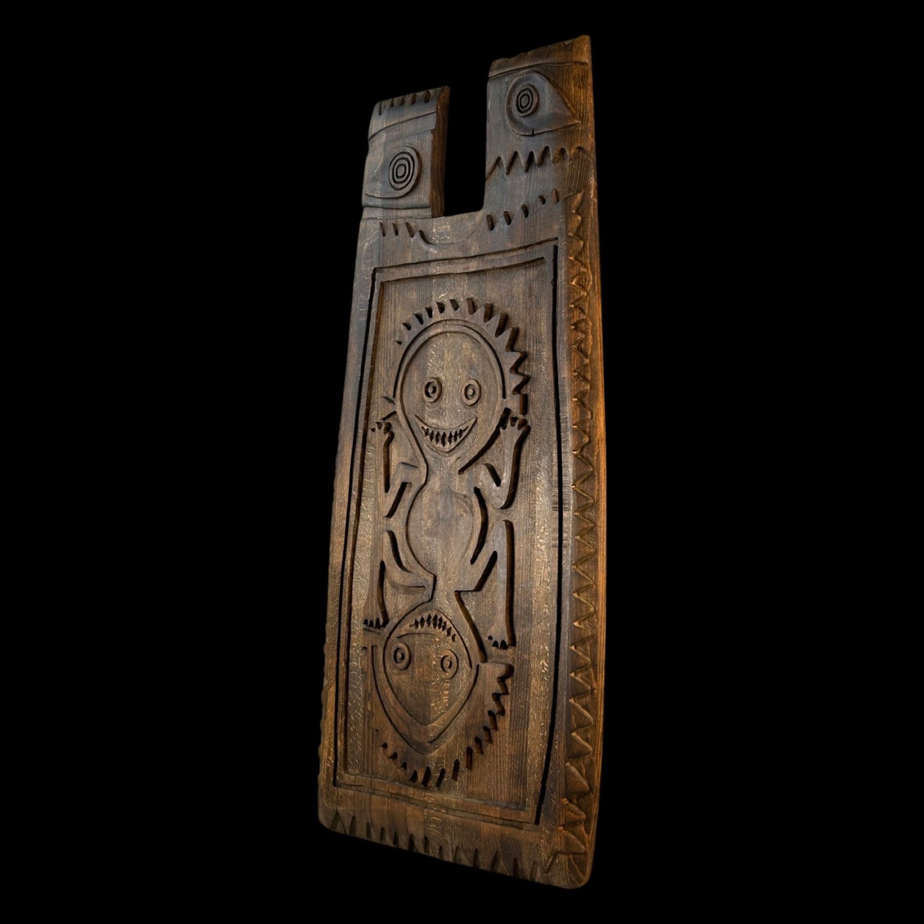 (1950s) Perhaps the most famous of the OA carving designs of all time. This New Guinea shield was created by LeRoy Schmaltz based on a museum specimen and adapted for commercial use. This original carving was commissioned in the late 1950s by Cargoes by Carter and saw use at Disneyland in Anaheim, California and The Mai-Kai in Fort Lauderdale, Florida. Disney again put this design to heavy use at The Polynesian Village Resort in Walt Disney World. In fact, Disney based its MAUI LOGO for the Polynesian Village Resort off this artifact. An important piece of Poly-Pop history. Marked on the verso in marker, "Pattern 402". VG+. 17"x39.75".