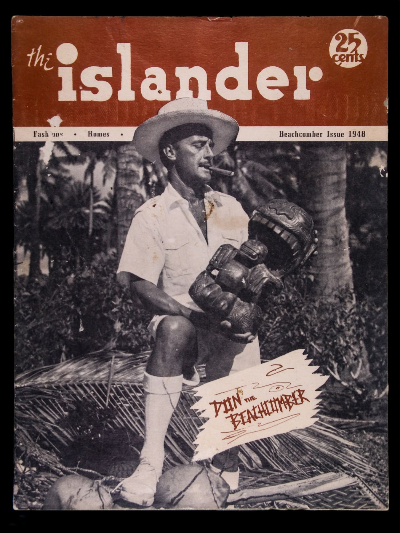(1948)* Featured on the cover of this 1948 Islander magazine is the king, Ernest Gantt, aka Don the Beachcomber. The romantic pose echoes his myth of the brave adventurer in the field. In his hands are one of the keystone images to the TIKI ERA, his prized cannibal Tikis. VG+ with some edge wear and light staining. 9"x11.75" closed.