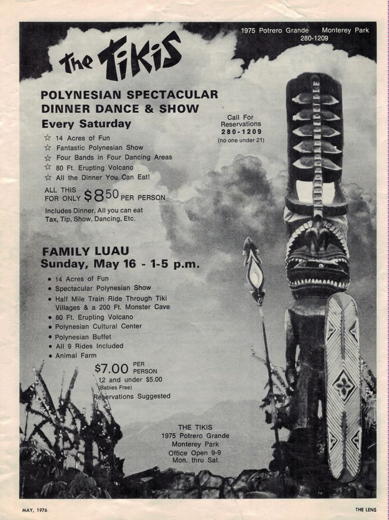(1976) A 26-page local Inland Empire dining and entertainment industry magazine. It features and article on THE TIKIS and a full page advertisement on the back cover.11"x8.5"VG+ with minor wear