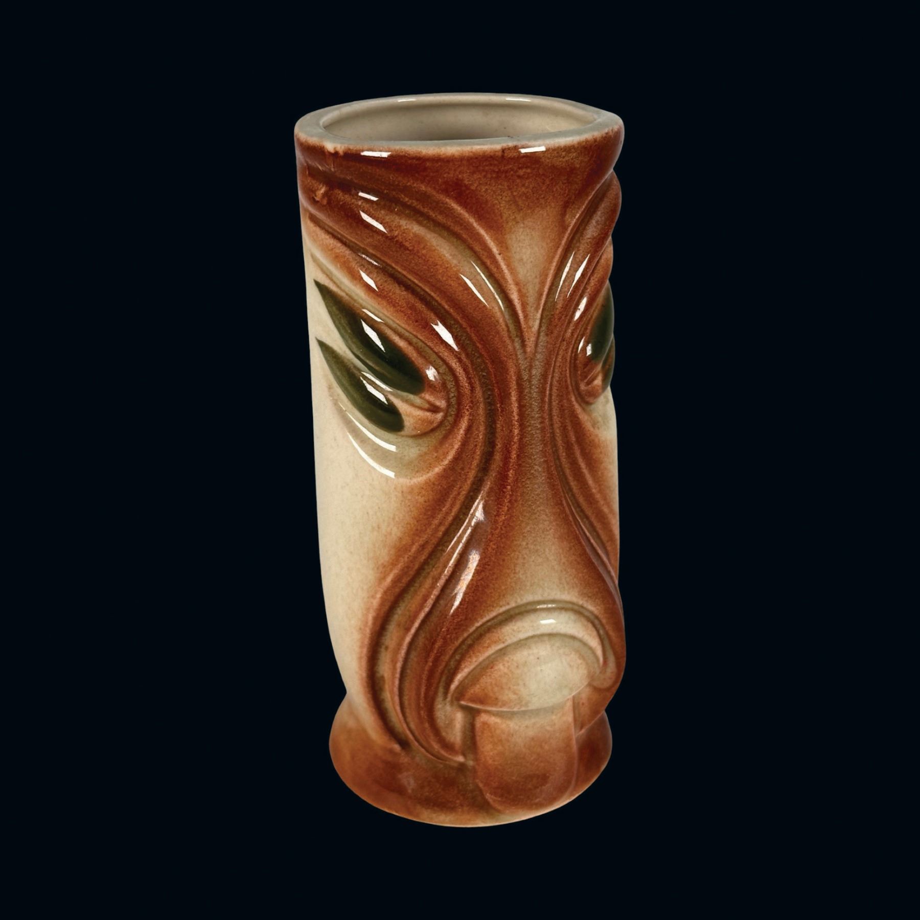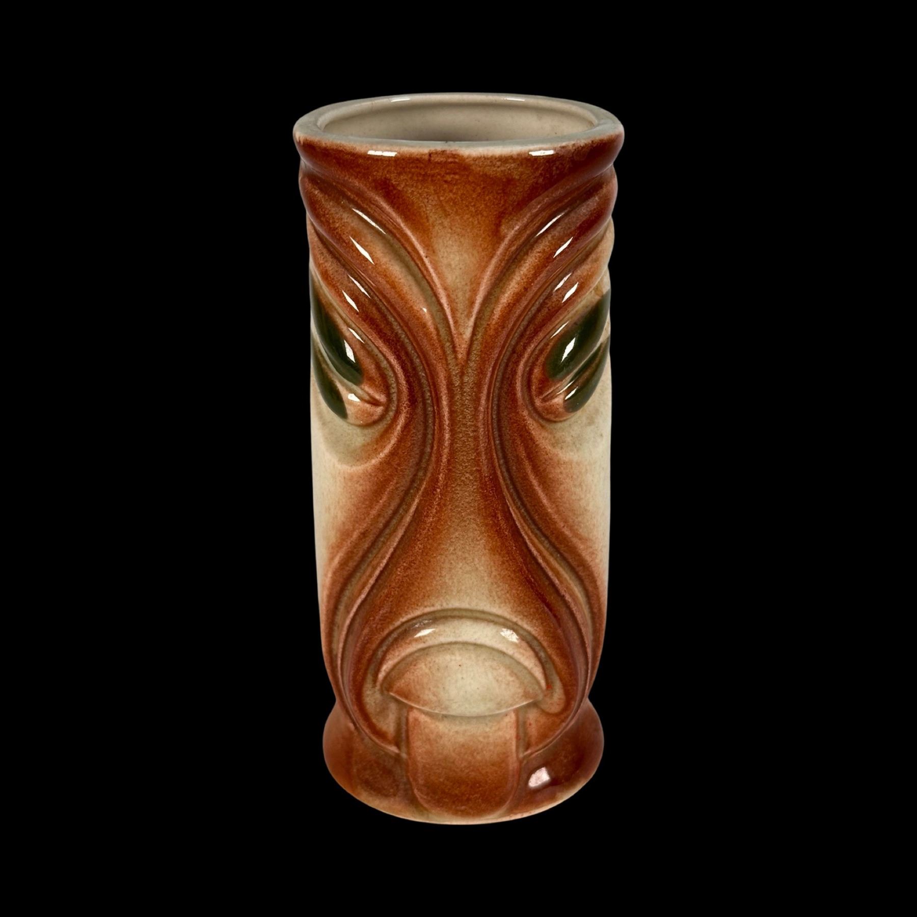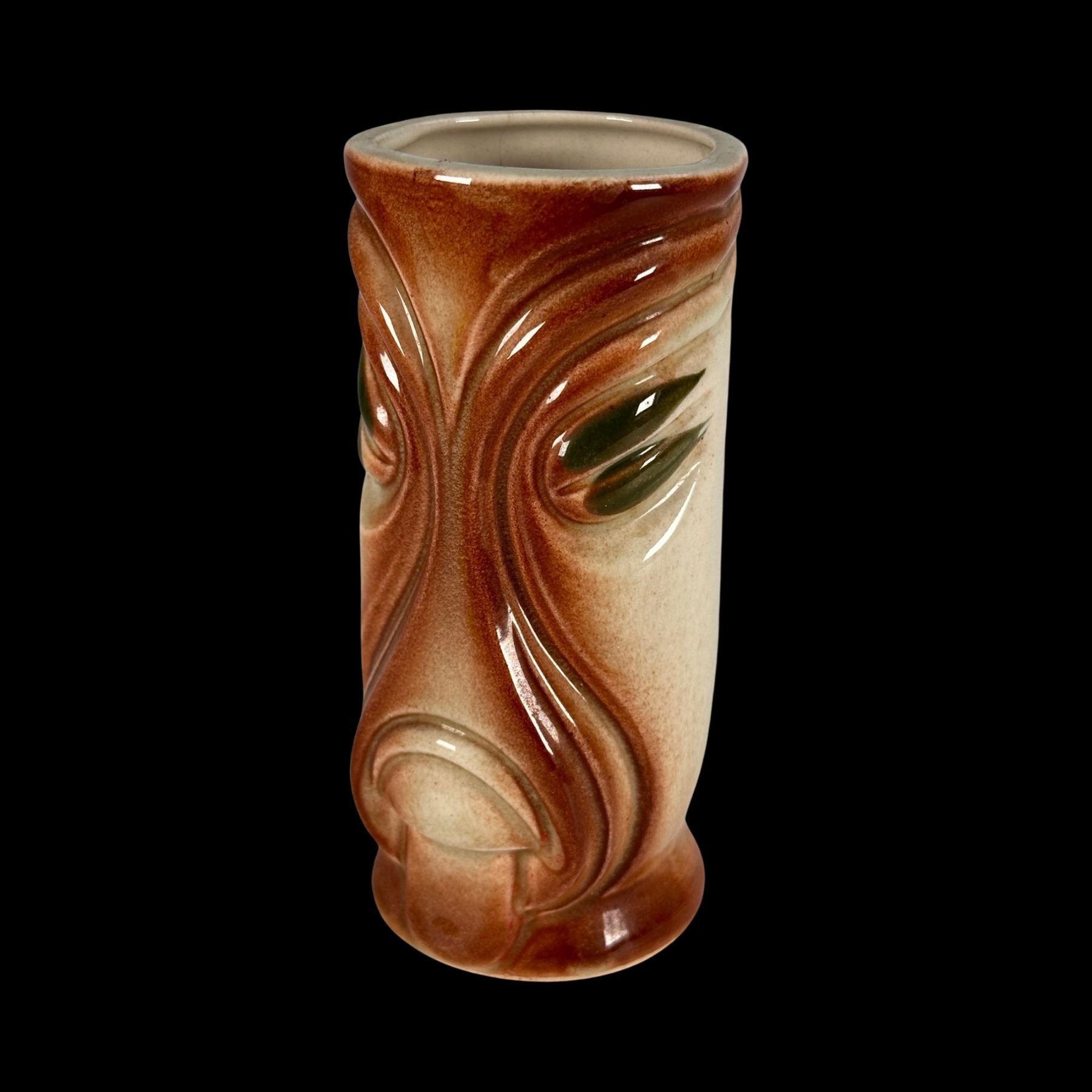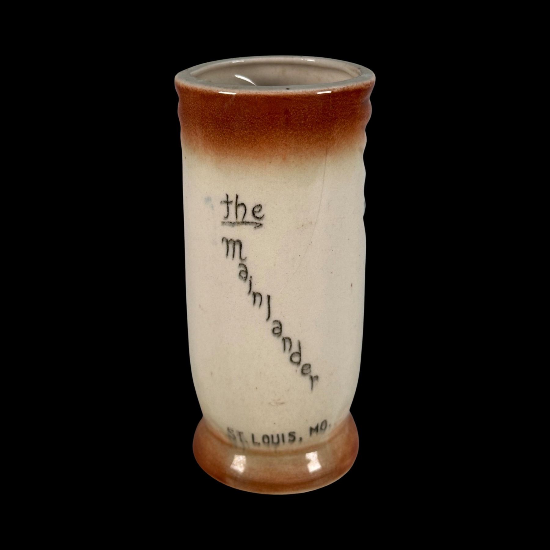 (1960s)* The larger version of the Mainlander signature mug. It appears this is the version with no cold paint on the tongue. They did relaese later versions without the top paint. Overall VG+ with some atmosphereic crazing in the top glaze. 2.5"dia x 5.5".