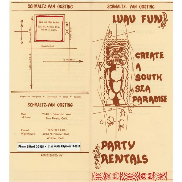 VERY EARLY SCHMALTZ & VAN OOSTING PARTY RENTALS FOLD OUT BROCHURE.28 - VERY EARLY SCHMALTZ & VAN OOSTING PARTY RENTALS FOLD OUT BROCHURE.