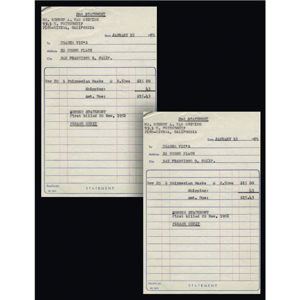 (1958-1959) A pair of early invoices to Trader Vic's famous Cosmo Place, San Francisco location. Note the payee is Robert Van Oosting at Bob'...