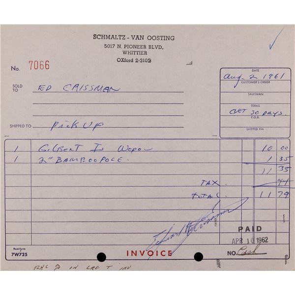 (1961) Early invoice to famed OA tiki carver, ED CRISSMAN, dated August 1961. Signed in blue ink. 7"x8.5". VG+.