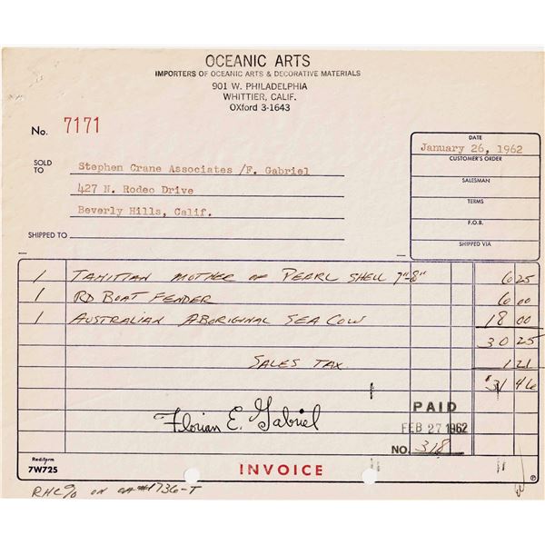 OCEANIC ARTS STEPHEN CRANE/FLORIAN GABRIEL SIGNED INVOICE.32 - OCEANIC ARTS STEPHEN CRANE/FLORIAN GABRIEL SIGNED INVOICE.