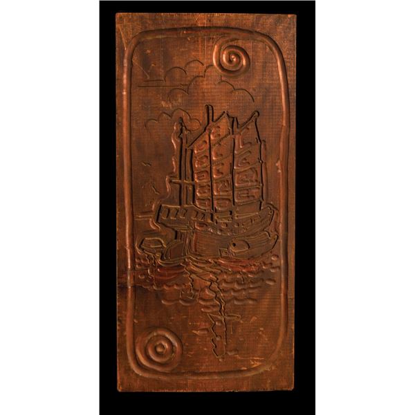 (1950s) An early Schmaltz and Van Oosting decorative wall panel carving of a Chinese Junk. 25"x12" -2 Sided. VG+ with typical wear.