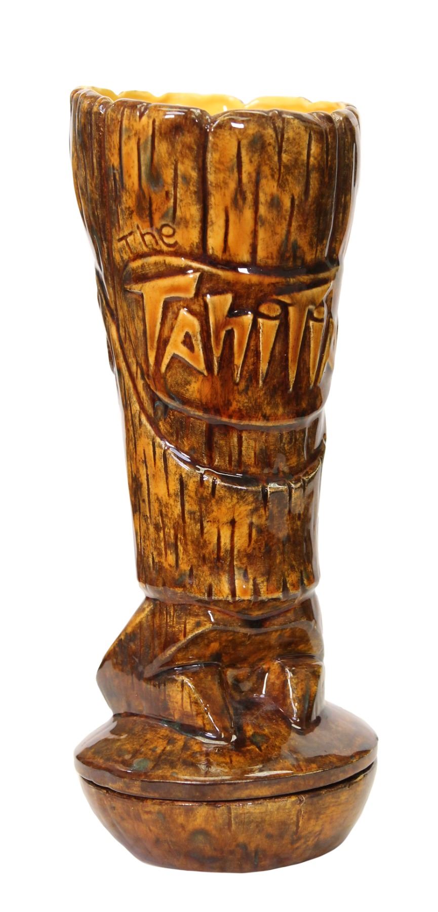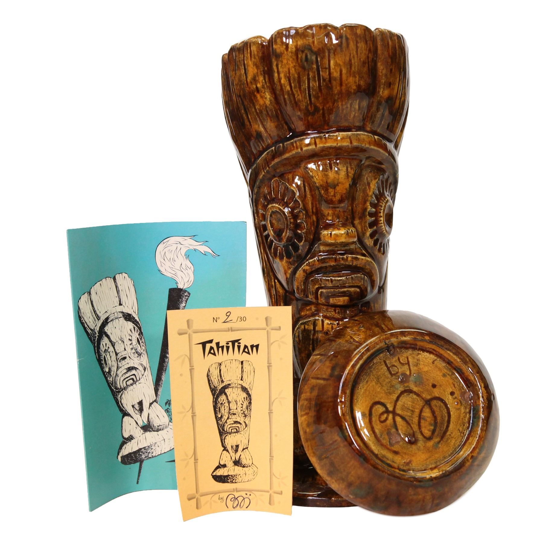 (2010) Rare Limited Edition THE TAHITIAN mug by BAI. Inspired by the menu cover for The Tahitian restaurant, which depicts a Tiki carved by Andres Bumatay. It also provided the cover for “The Art of Tiki†book. Comes with a condiment bowl that makes the base of the mug. Comes with removable lid and numbered insert. FROM THE SVEN KIRSTEN KOLLECTION. Ceramic.Mug-10.5"x5" Base-4.5"x1.5". VG+