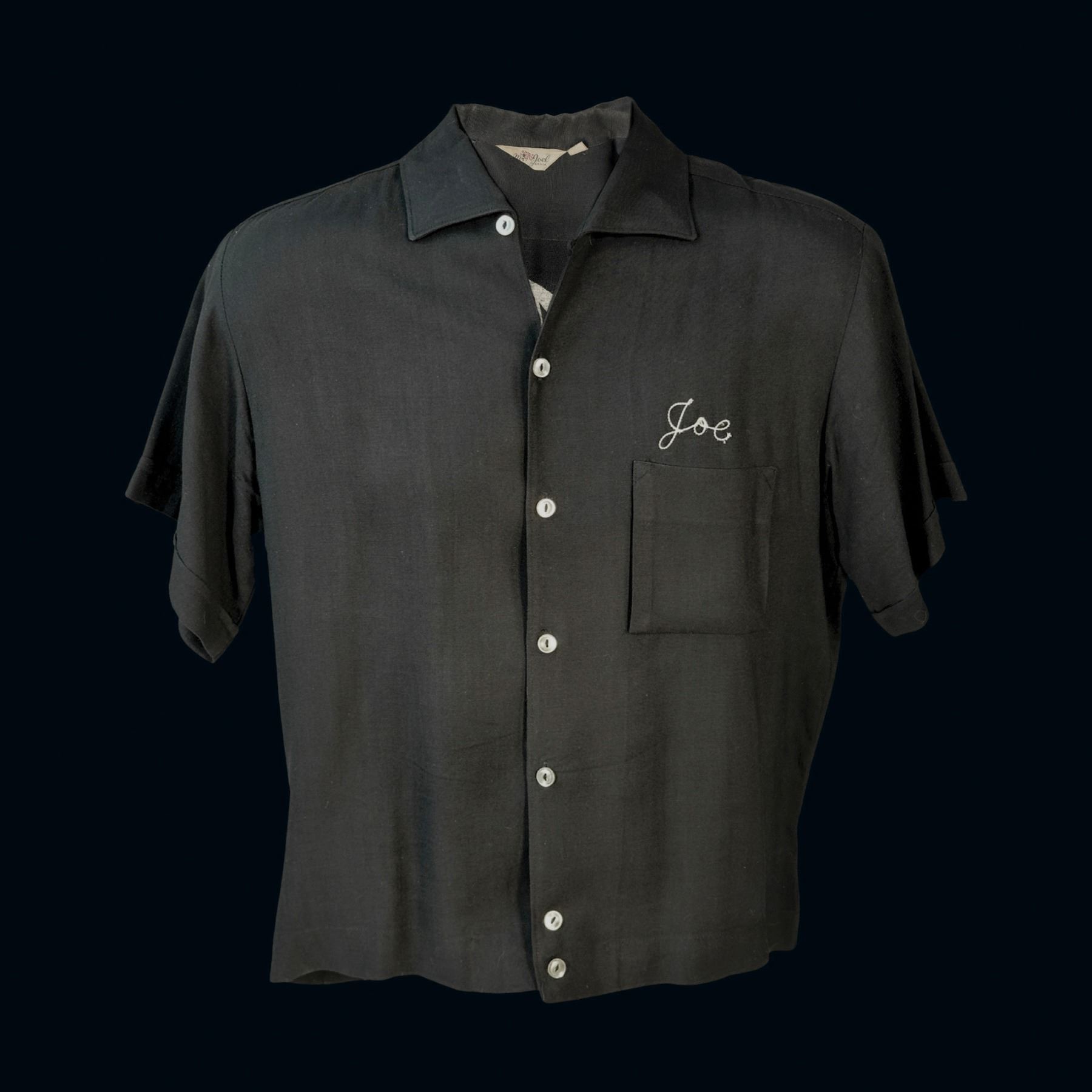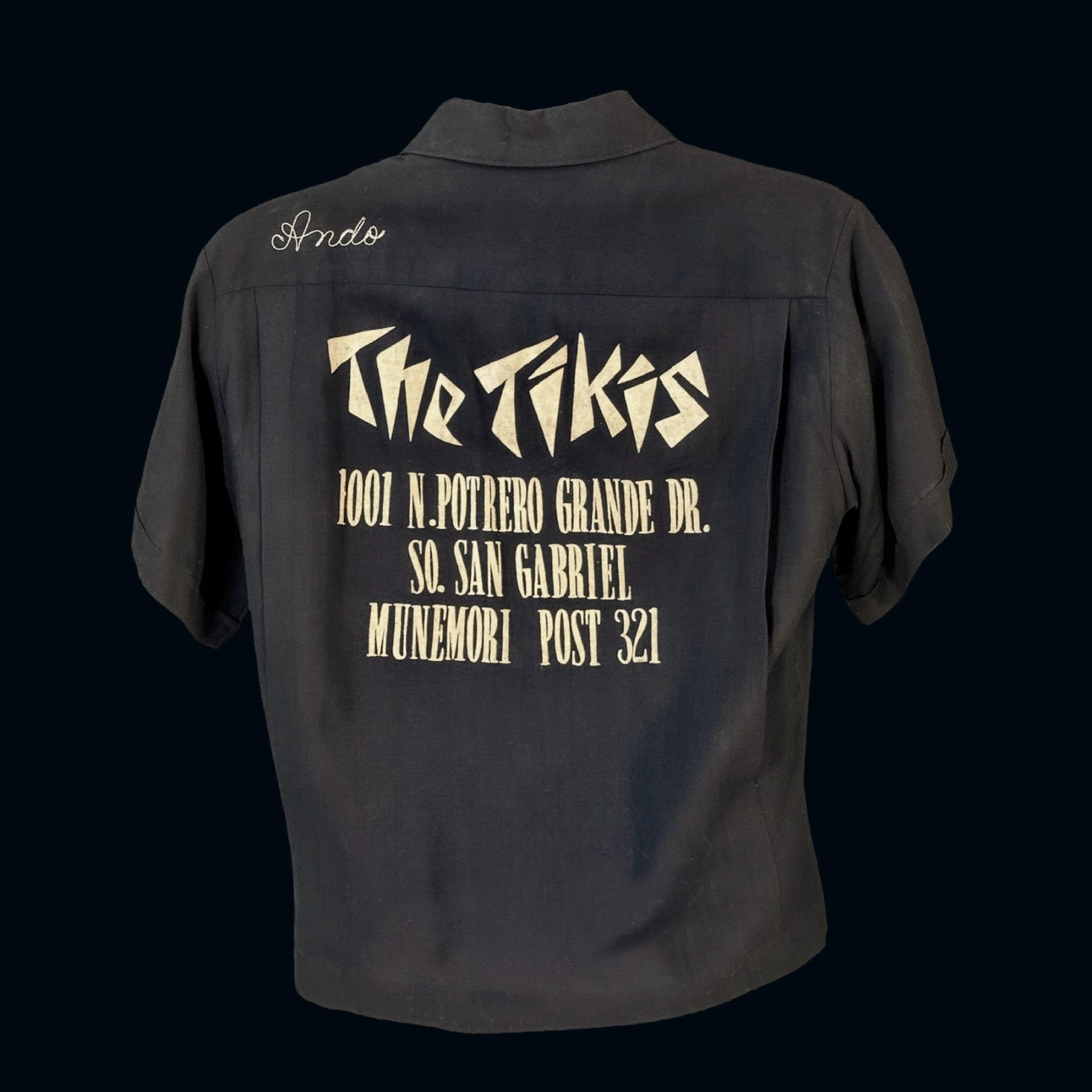 (1960s) Embroidered with "Joe" on front and "Ando" on the back along with The Tikis address. VG+ with typical wear and yellowing to the flocked lettering on the back. CHEST-19" LENGTH-24".