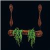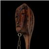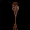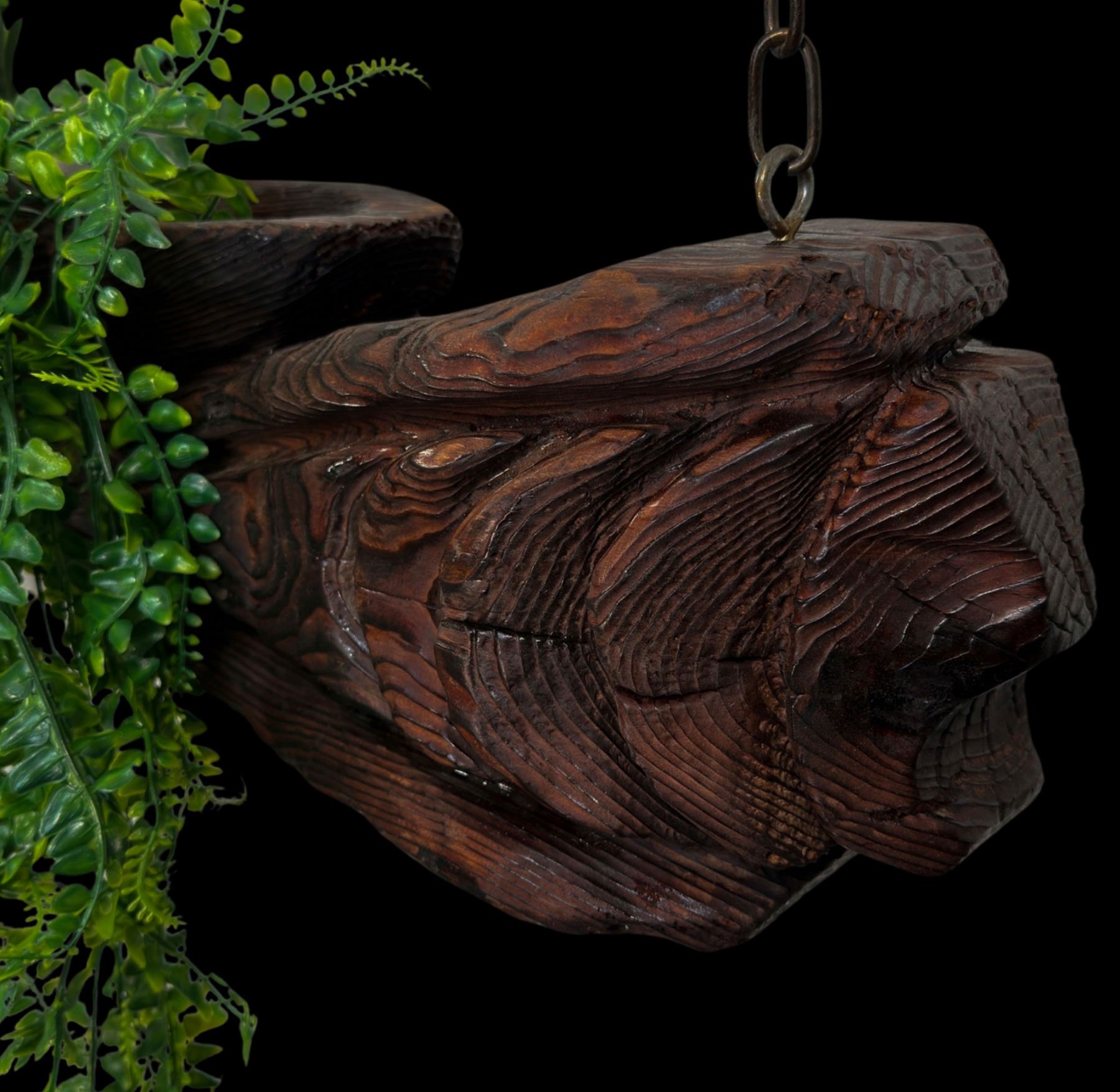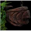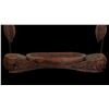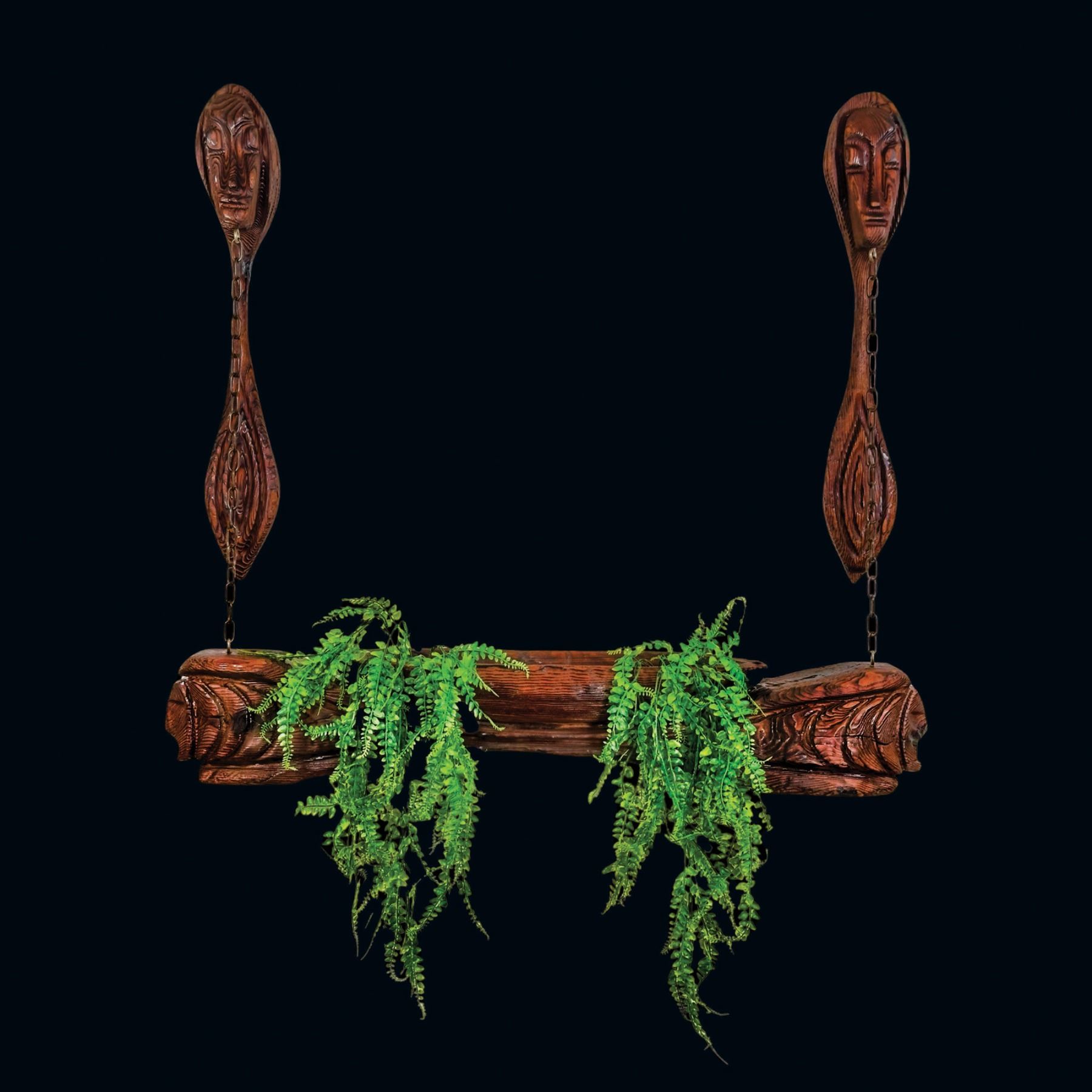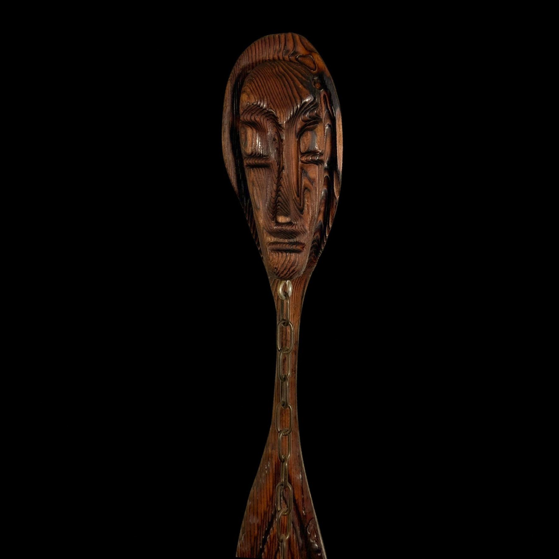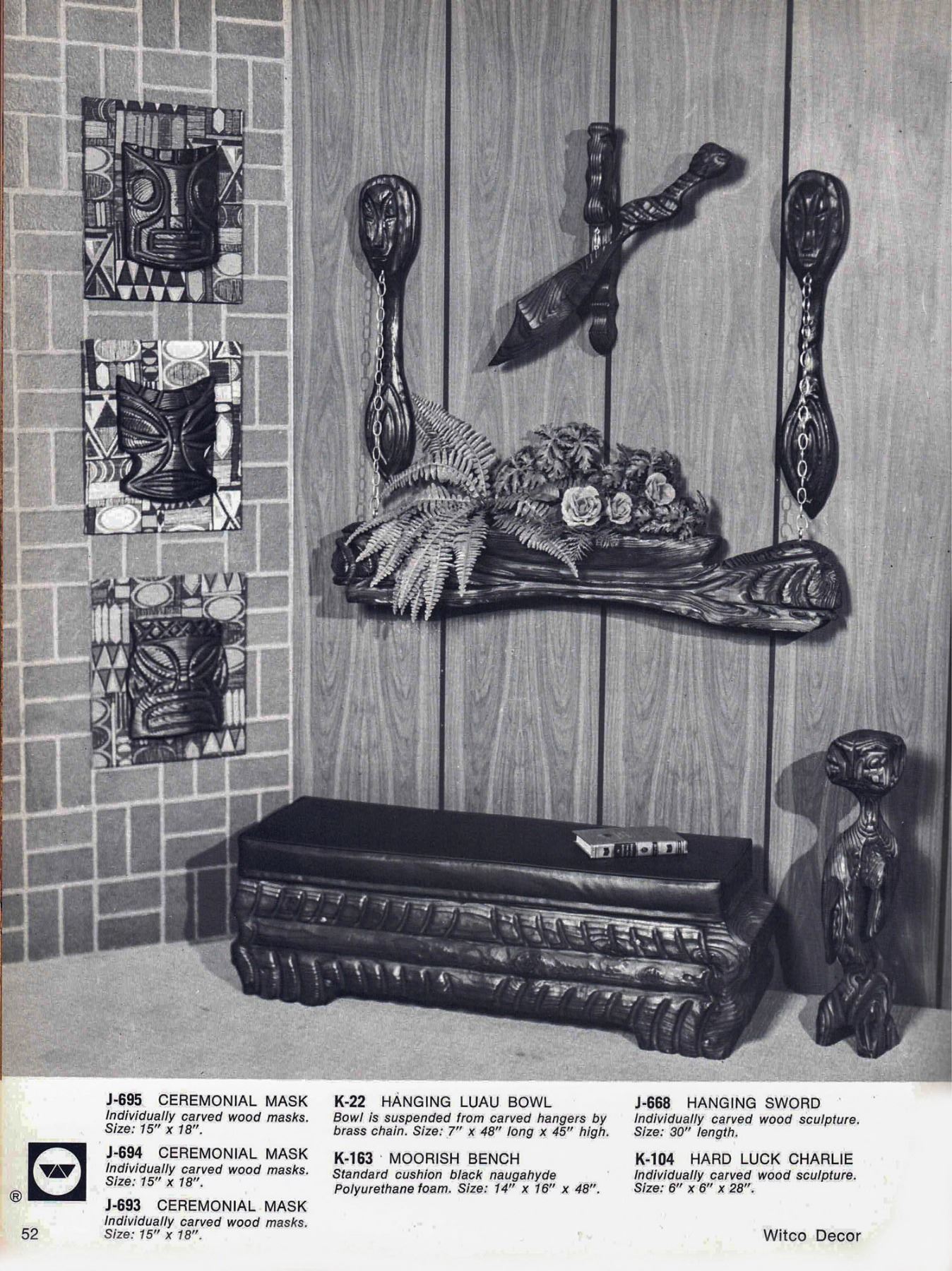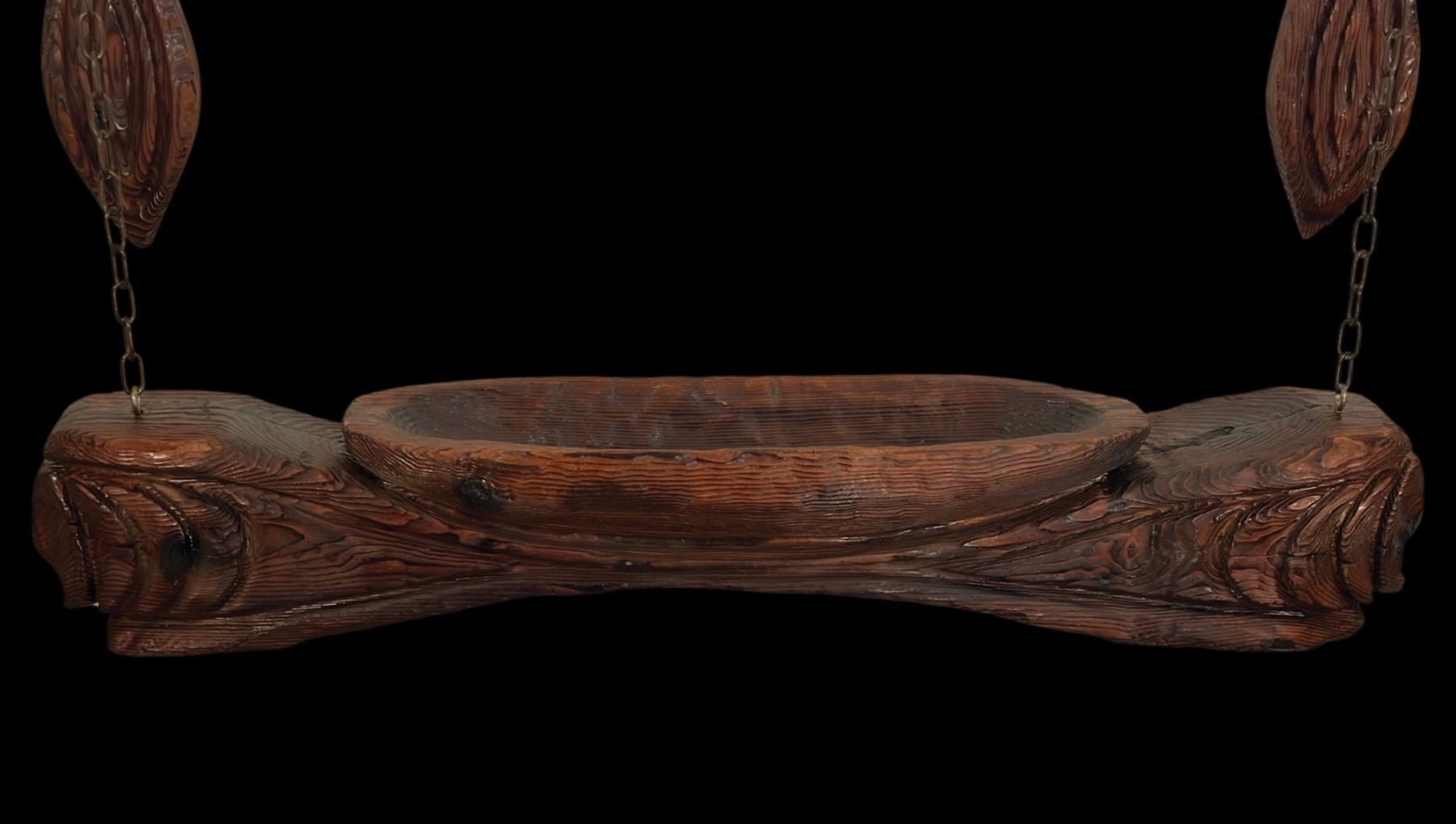 (1960s) A rare and impressive piece from the 1960s Witco catalog. Two figural Tikis support a long ceremonial bowl carving hung from suspension chains. VG+. 48"x8"x43".
