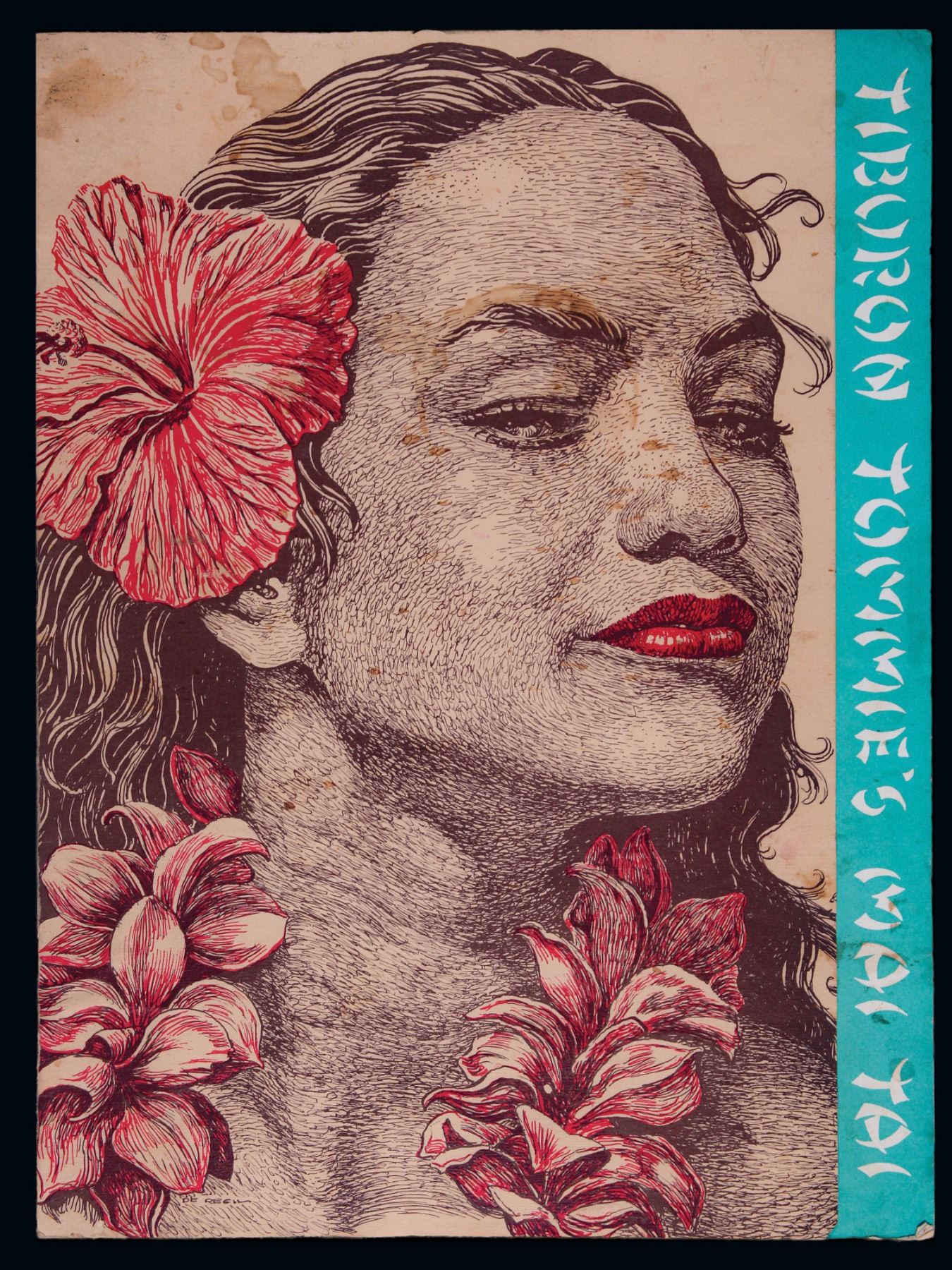(1950s) Rare full restaurant menu featuring a stunning rendering of a lovely wahini. Tiburon Tommie's was a vibrant Polynesian restaurant and bar in Tiburon, outside of San Francisco, CA. VG+ with light food staining on cover. See image. 10.5"x14.25" closed.