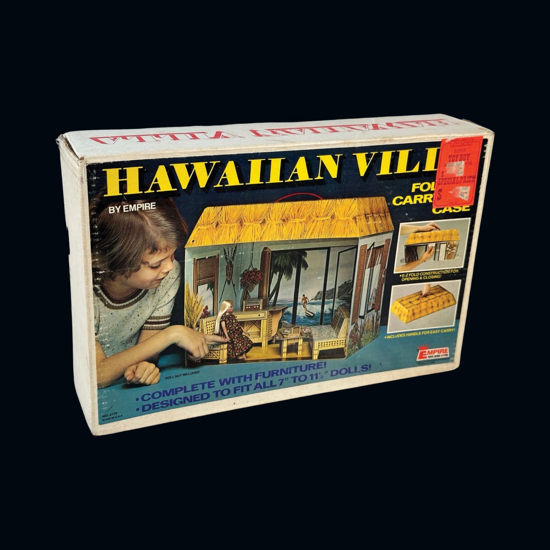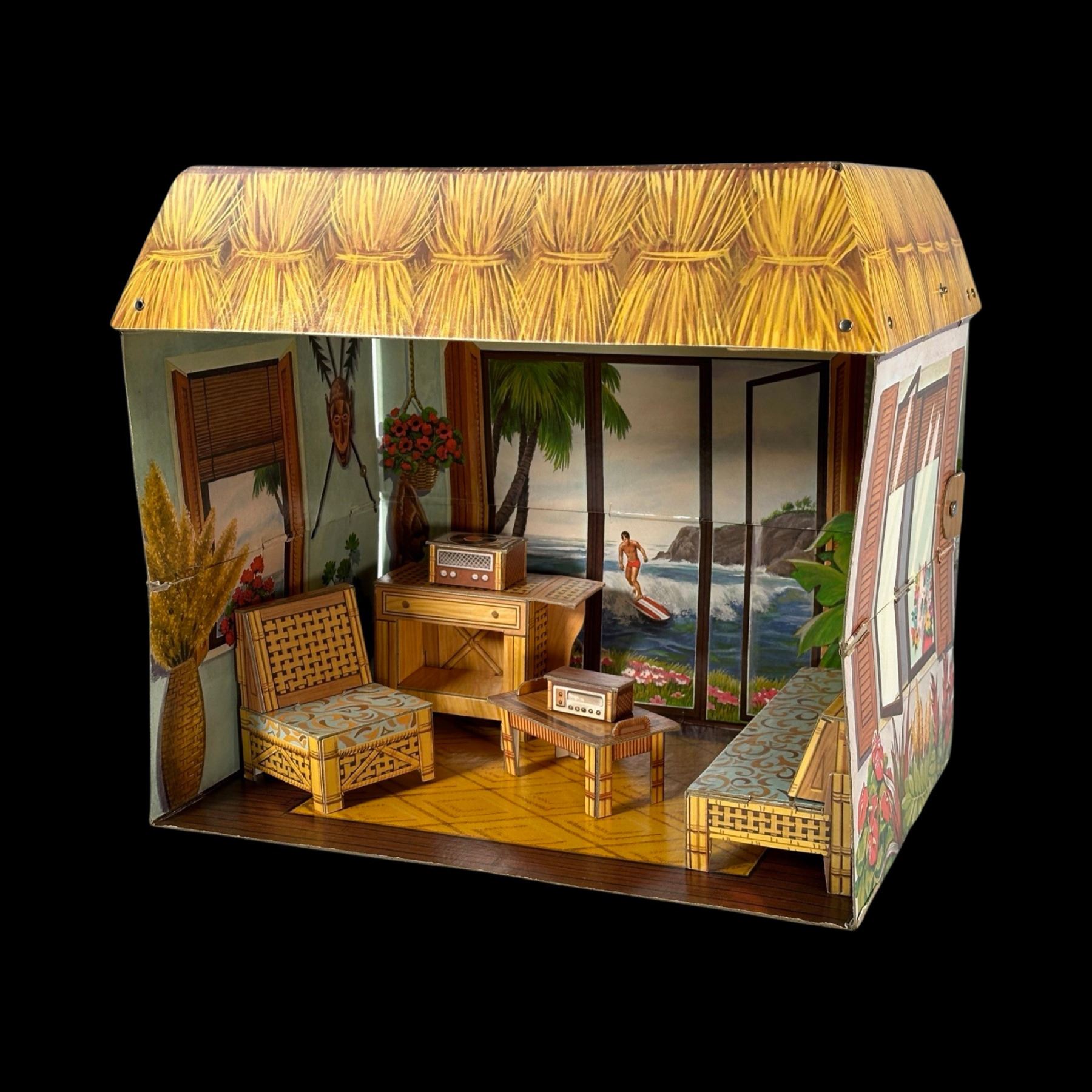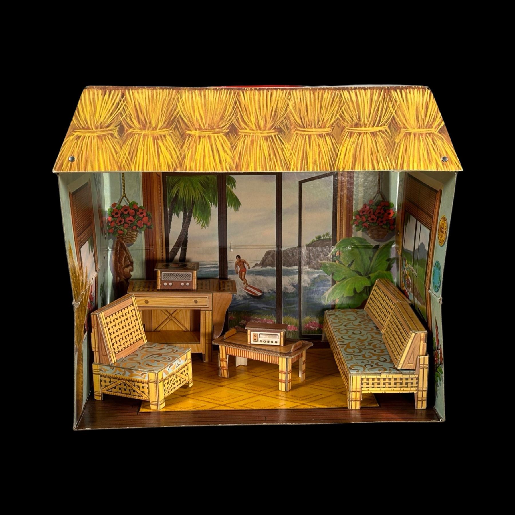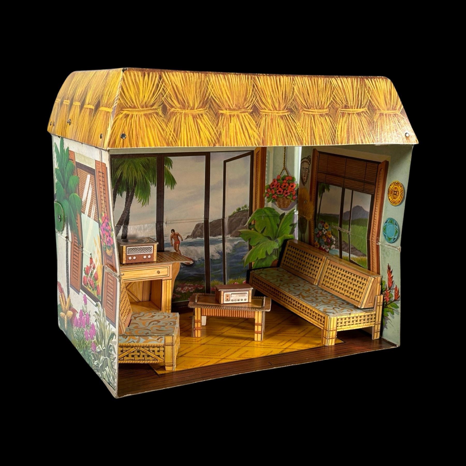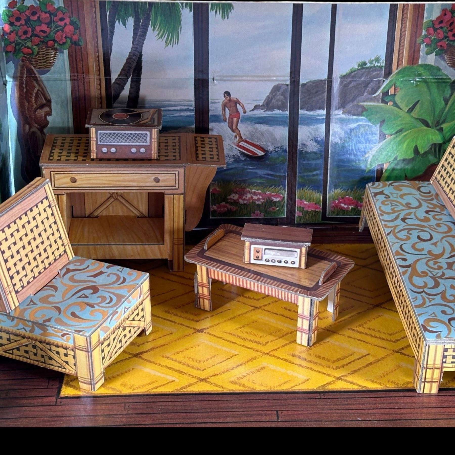 (1976) One of the Holy Grails of Tiki-Kitsch! This knock off "Barbie-Centric" toy was made as an off brand accessory to your authorized Mattel toy. It screams 1970s Hawaii featuring the type of villa room one would encounter in mod-Waikiki. In original box. Displays beautifully. VG+. 17"x11.5"x4".