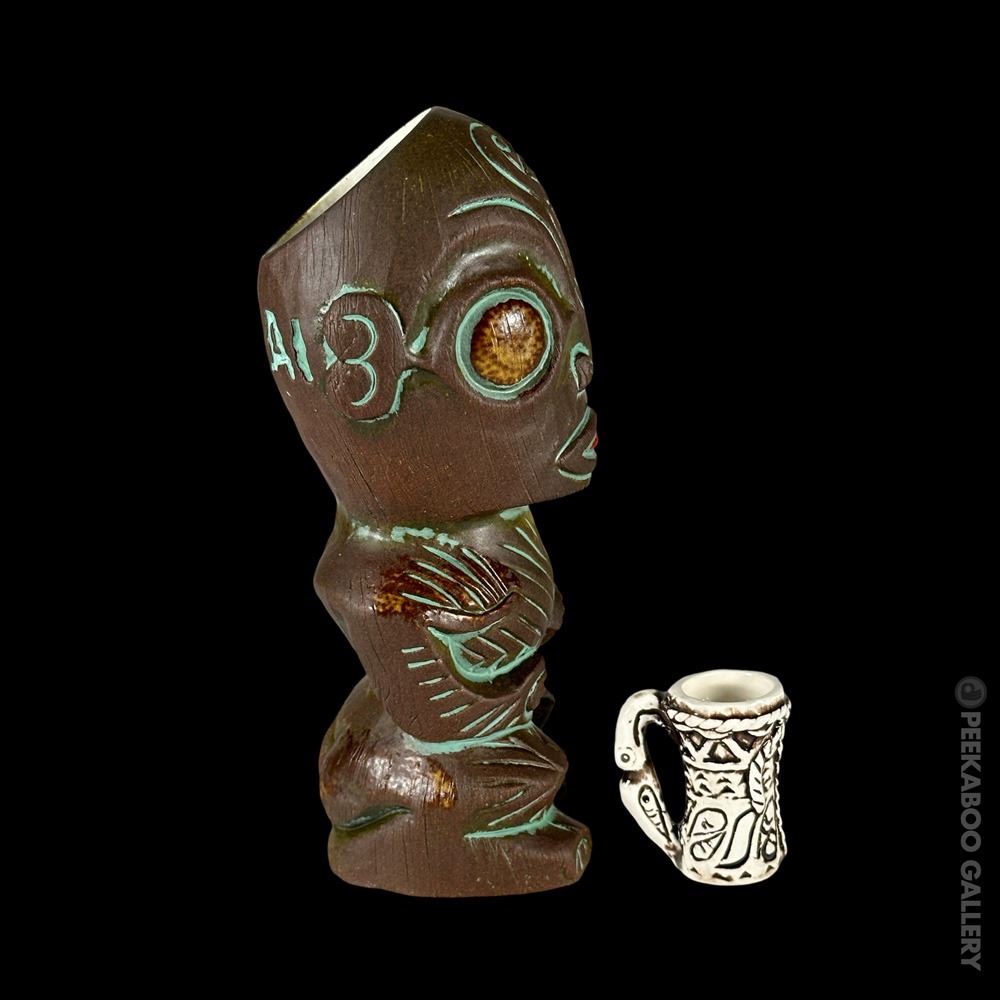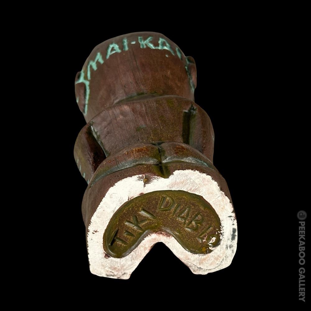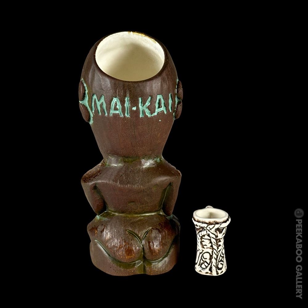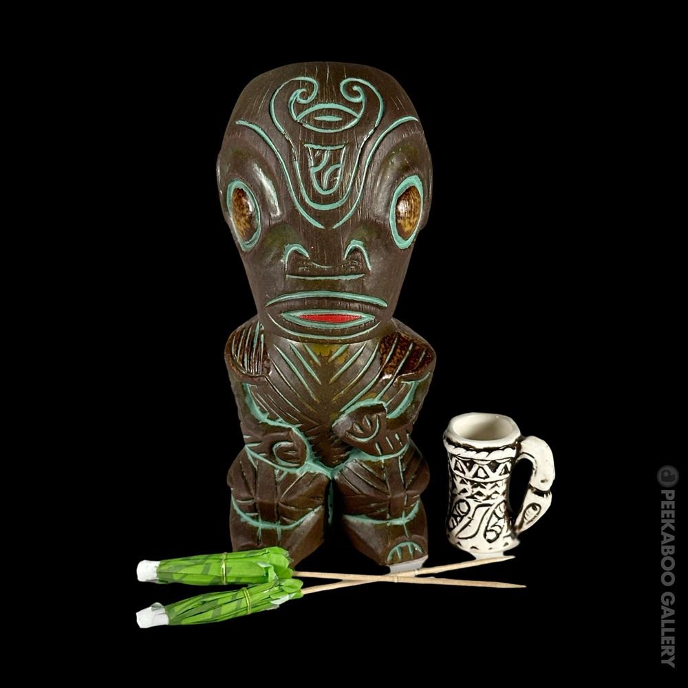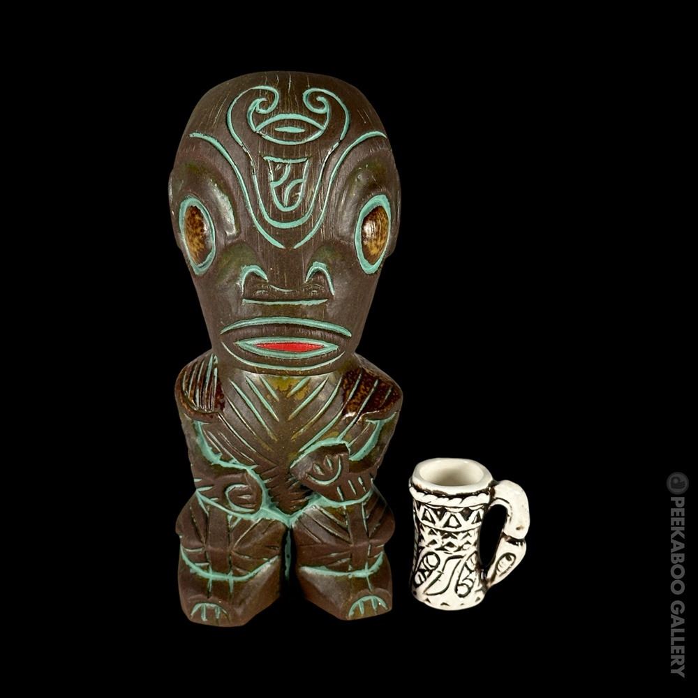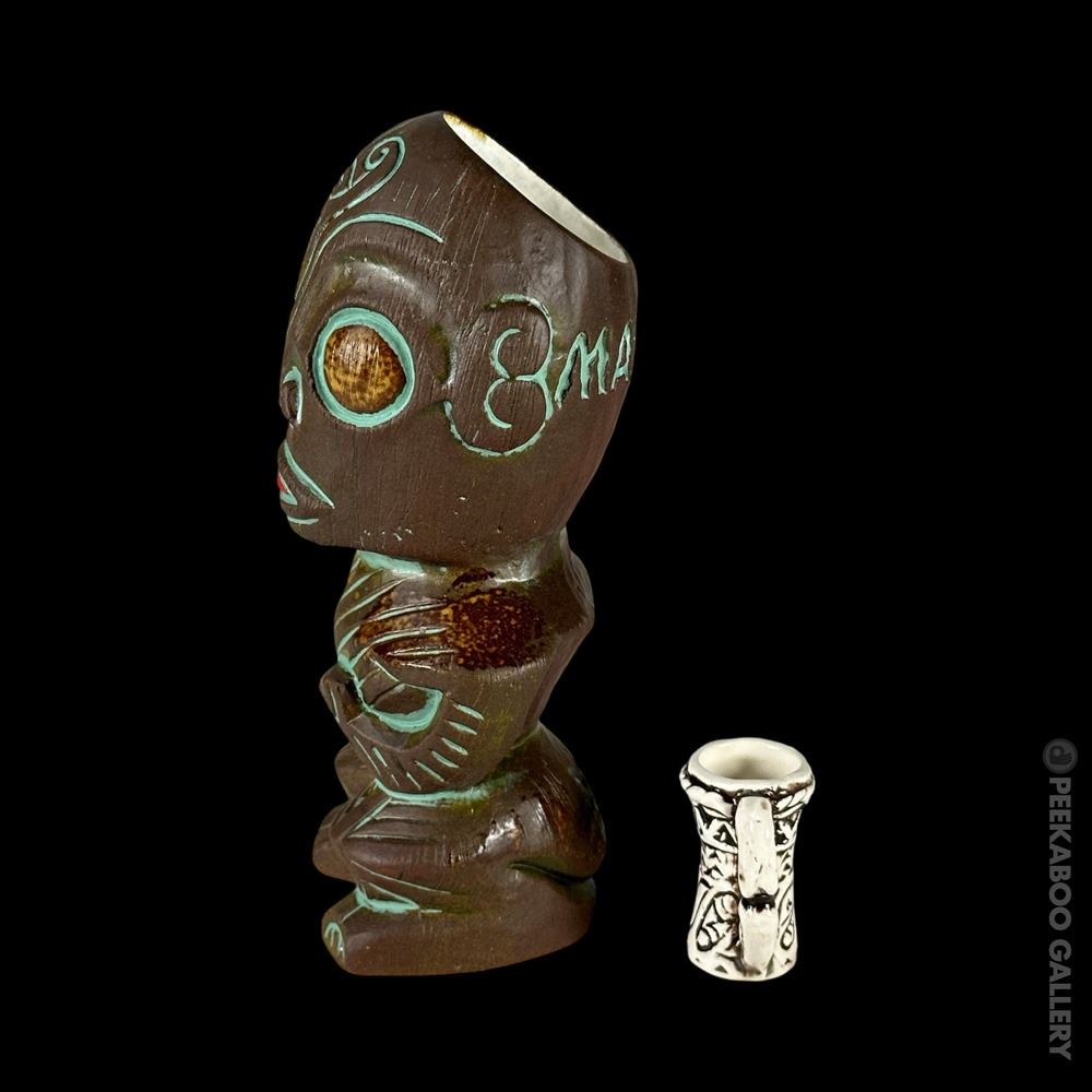 (2019) Sold out edition for the 2019 Hukilau of a Tiki found at the MAI-KAI in Fort Lauderdale, Florida. Comes with mini PNG Drum mug, three lights & two paper umbrellas. Limited to 300 pieces. VG+ 8"x3.5"dia.