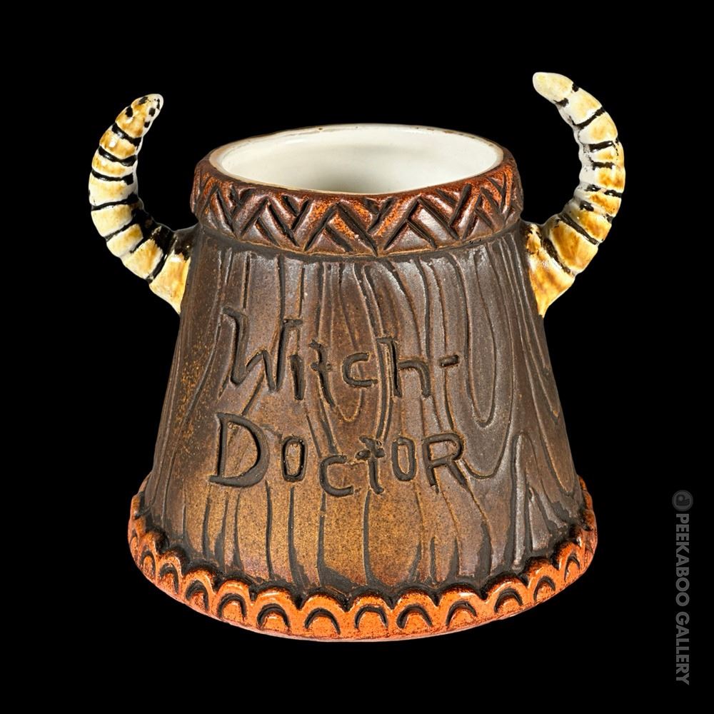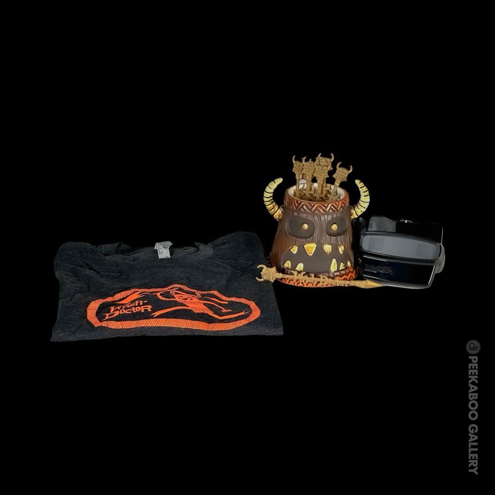 (2015) Ultra rare Kickstarter top-tier doner gift set for the support of the stop motion work-in-progress film, "The Witch Doctor". This came with the exclusive figural mug of the Witch Doctor character by Tiki Diablo and several other items. They include a T-shirt, swizzle sticks and a Viewmaster-style viewer with a 3-D reel featuring stereoscopic photos from frames of the short film. Numbered #158. Rare. VG+ in boxes. Mug-5.5"dia x 5.5", Tshirt-XXL, VIEW MASTER-3.75"x4.5"x3", Swizzles-7" each.