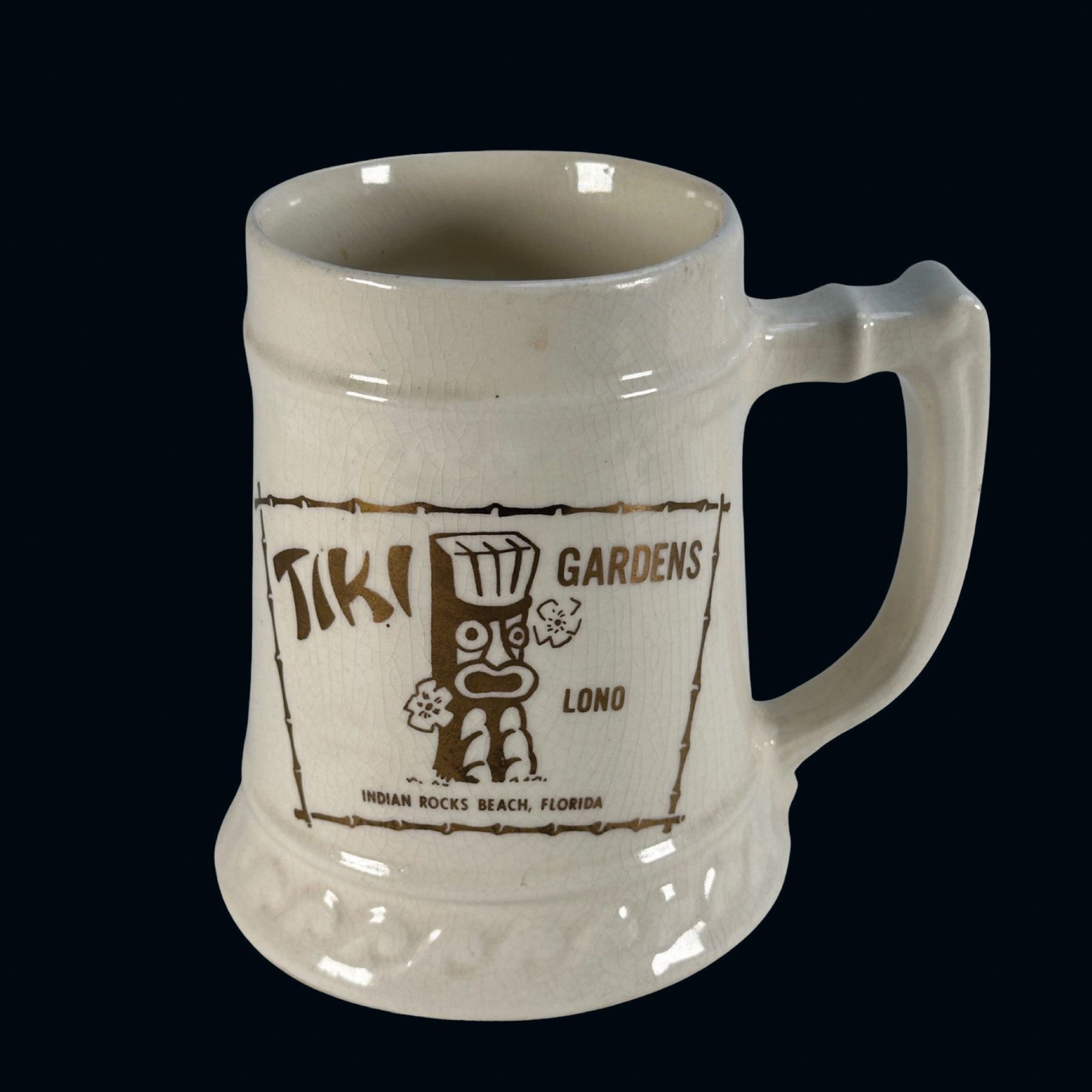 (1960s)* A great beer stein mug straight from the gift shop at Tiki Gardens in Florida. VG+. 7"x6.25"x5.25".