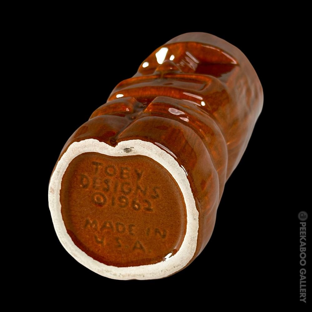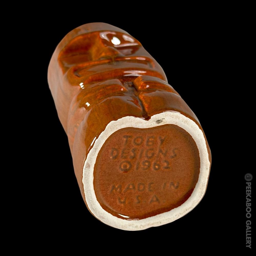 (1962) A very overlooked mug produced by Southern California designer and Polyneisan Pop retailer, Toby Tobecksen under his TOBY DESIGNS studio. This is the less common lighter brown version of this mug. VG+. 5.25"X2.5"dia.