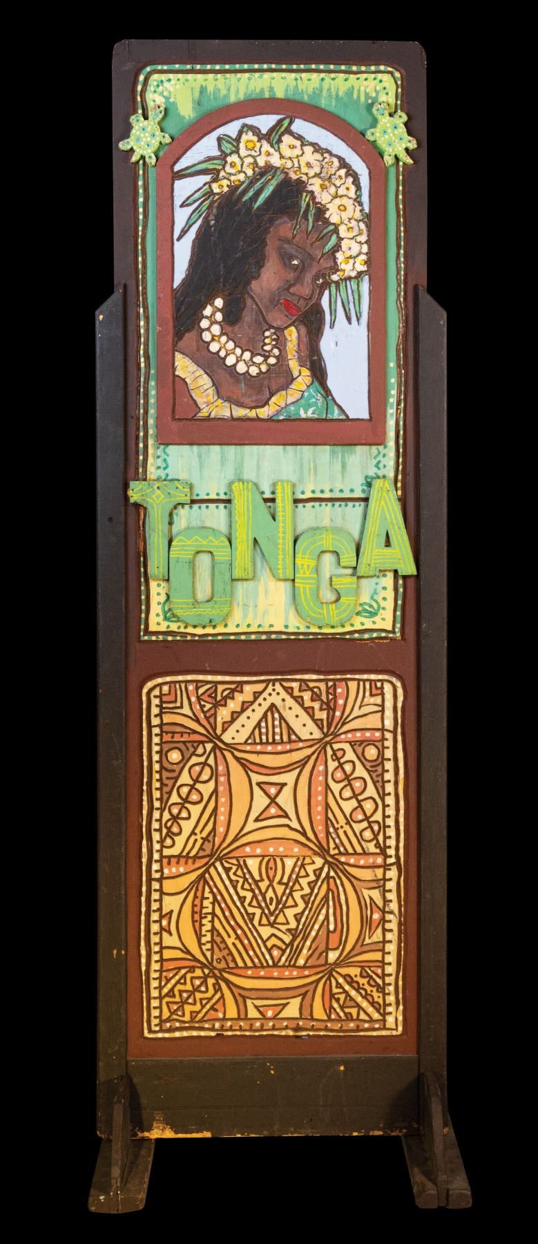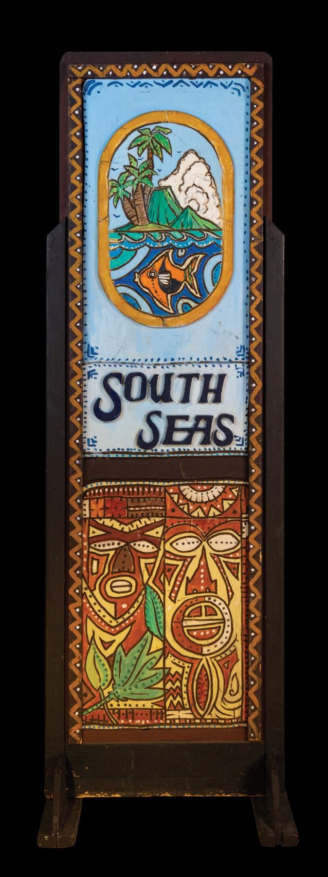(1970s) A gorgeous example of LeRoy Schmaltz's "carved paintings." The next three lots are of these decorative themed panels with one or two different national, tribal or thematic subjects on each side. Each one comes with a custom wedge stand. 77"x24.5". VG+ with typical wear.