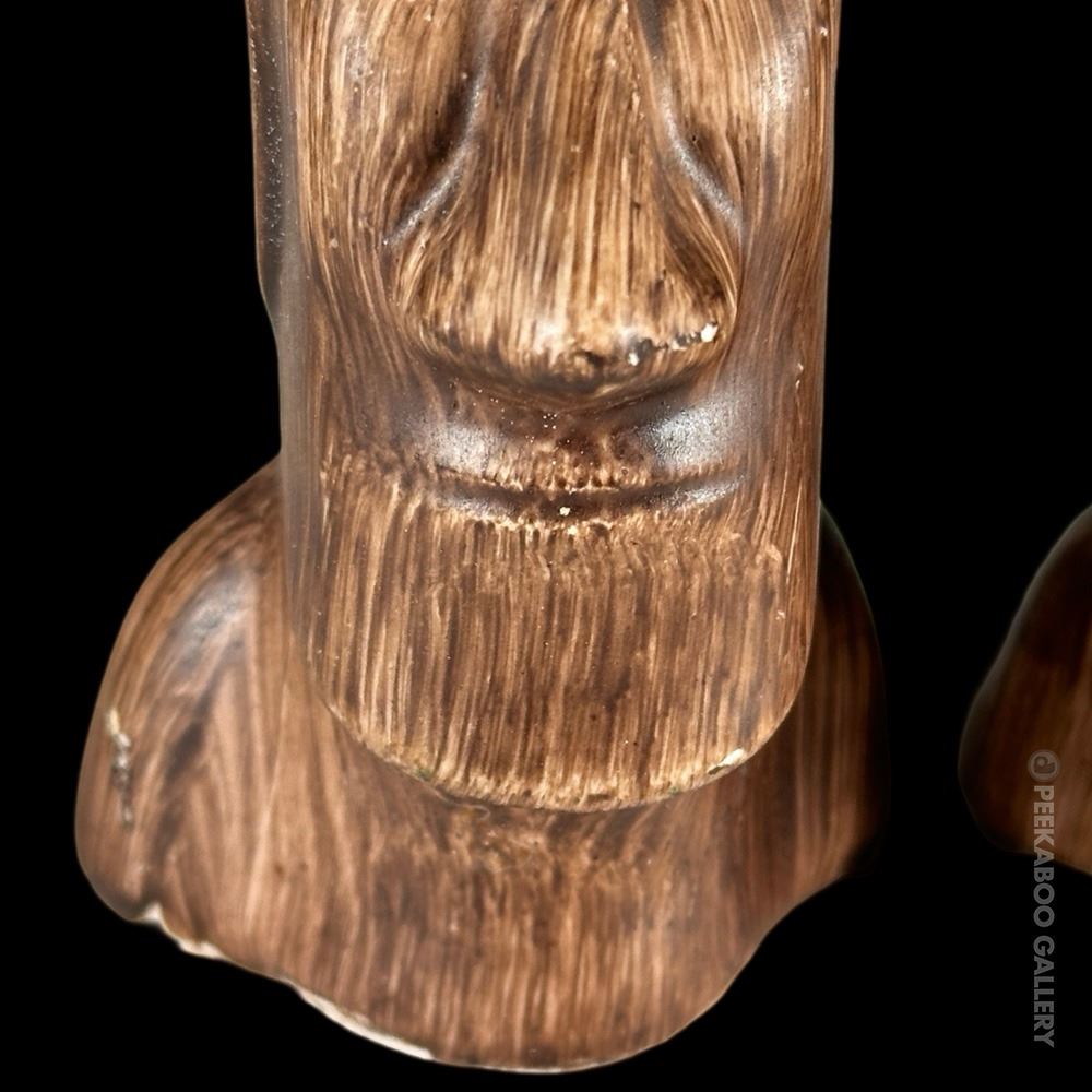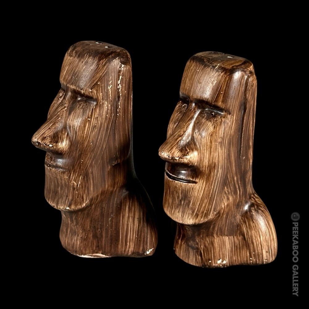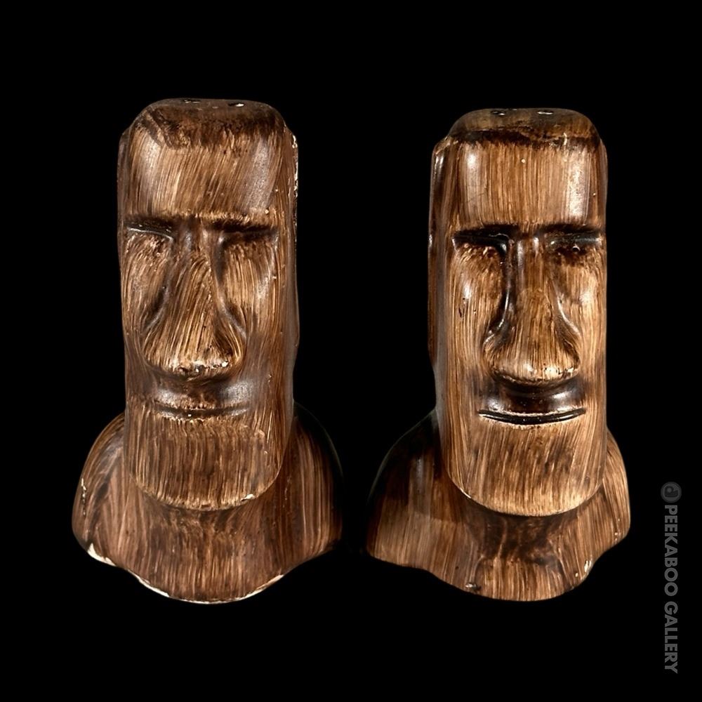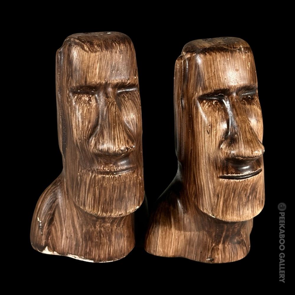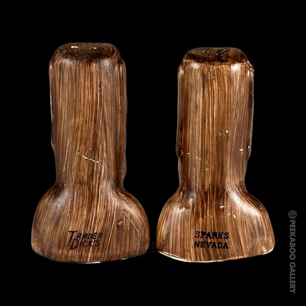 (1950s) Rare "shoulder" version salt & pepper shakers of the Aku Aku-inspired logo for Trader Dick's. Marked with the logo on the verso. Retains both original OMC stickers. VG+ with common cold paint wear to finish. 2.25"dia x 3.5" each.