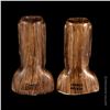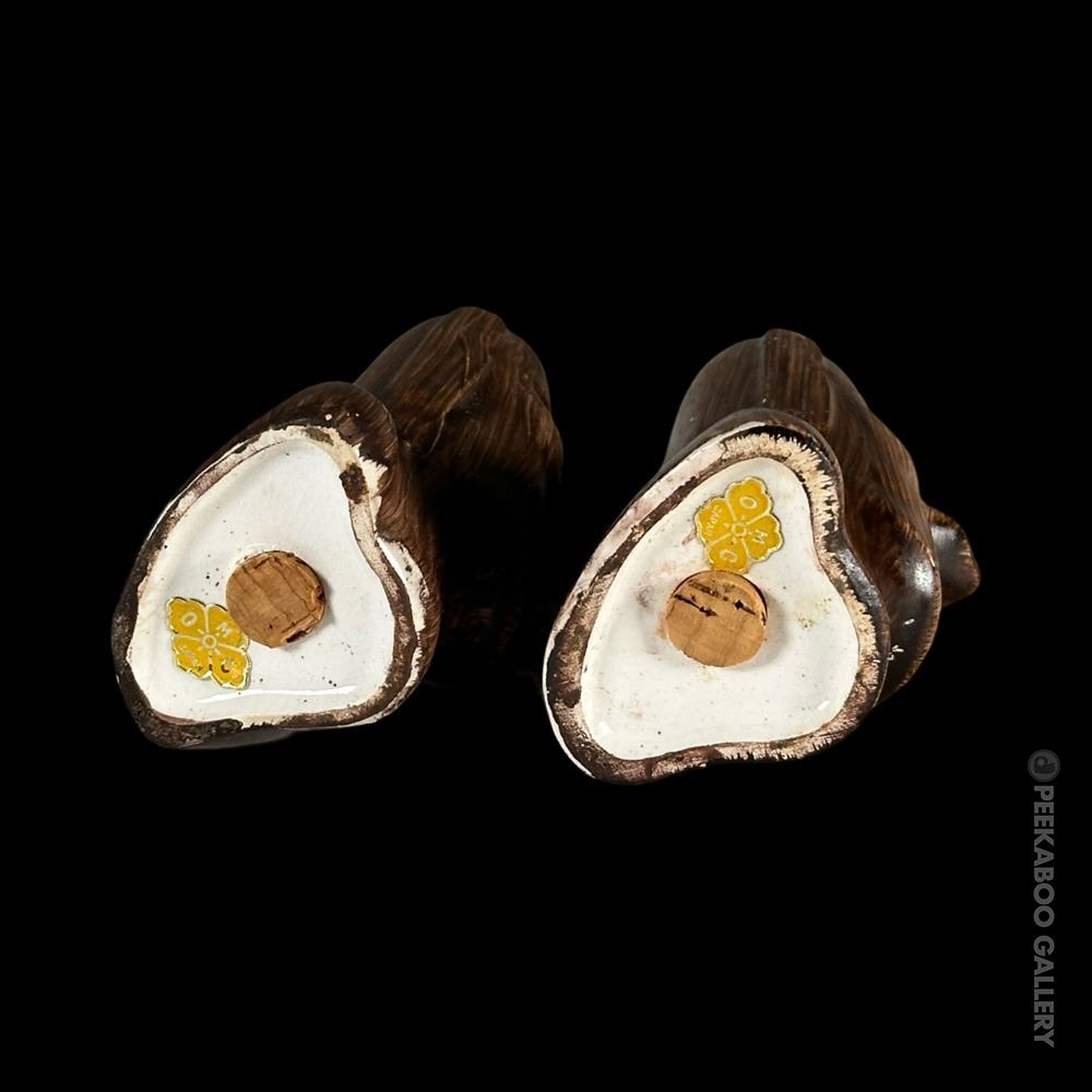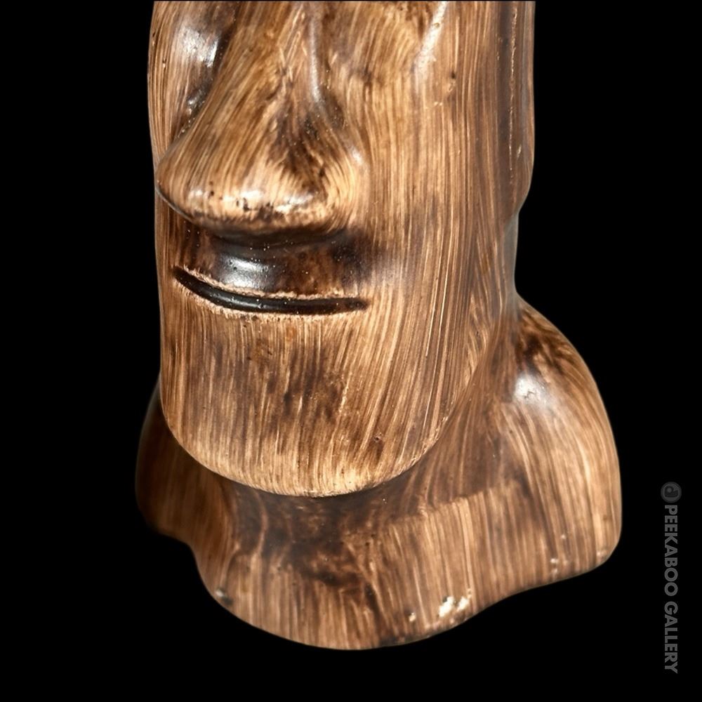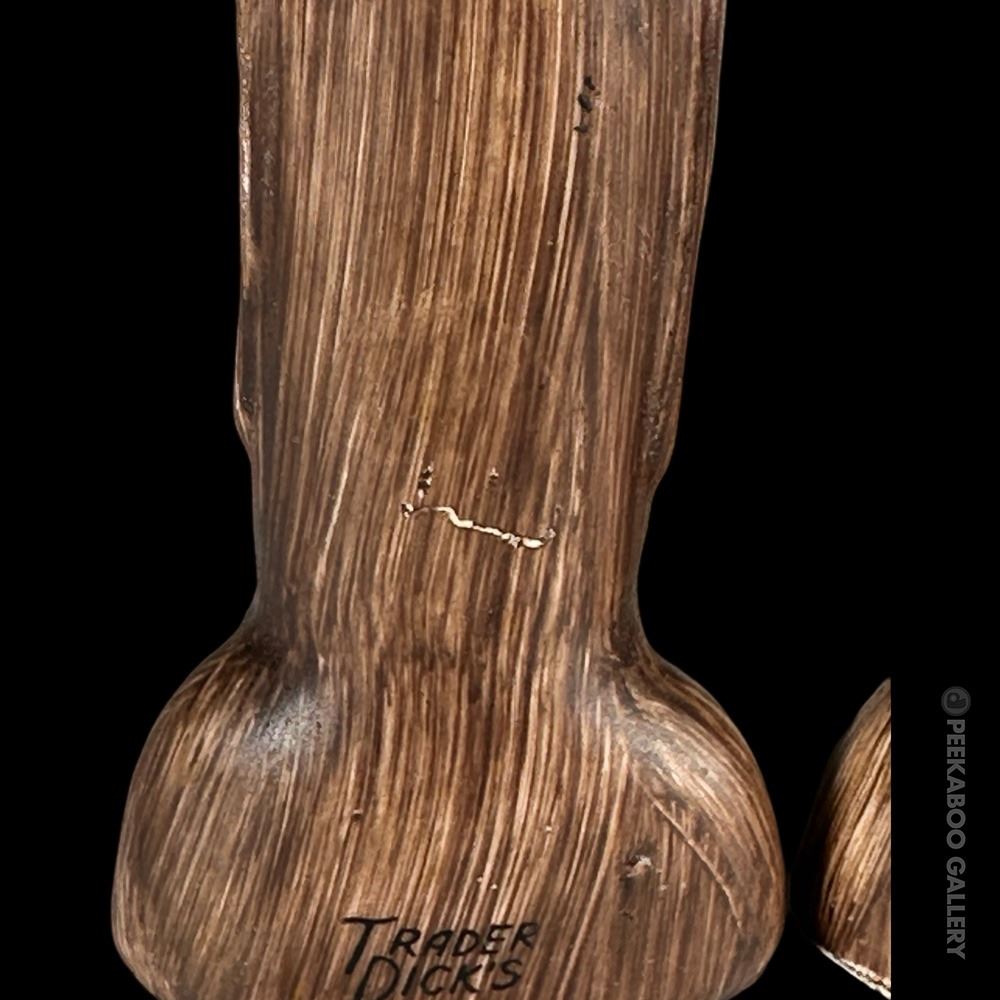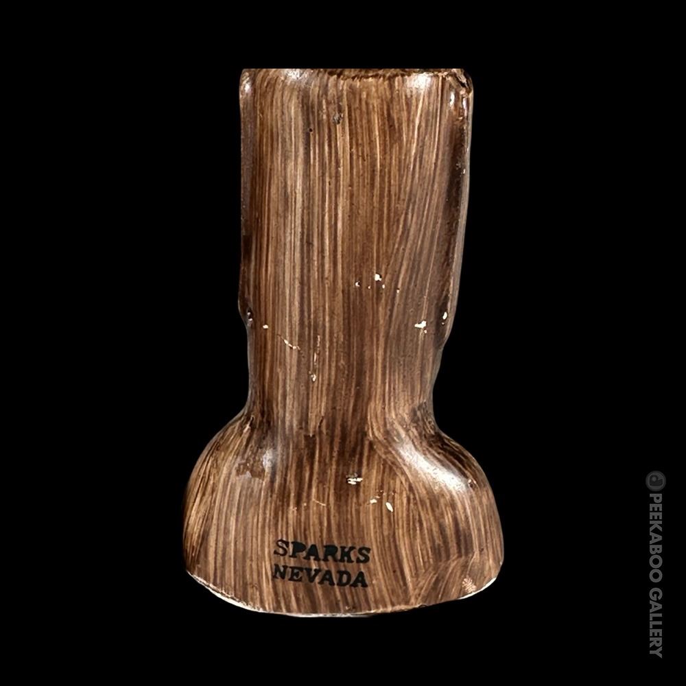 (1950s) Rare "shoulder" version salt & pepper shakers of the Aku Aku-inspired logo for Trader Dick's. Marked with the logo on the verso. Retains both original OMC stickers. VG+ with common cold paint wear to finish. 2.25"dia x 3.5" each.