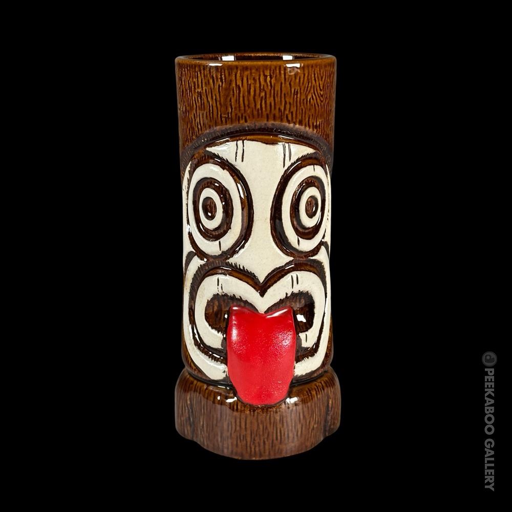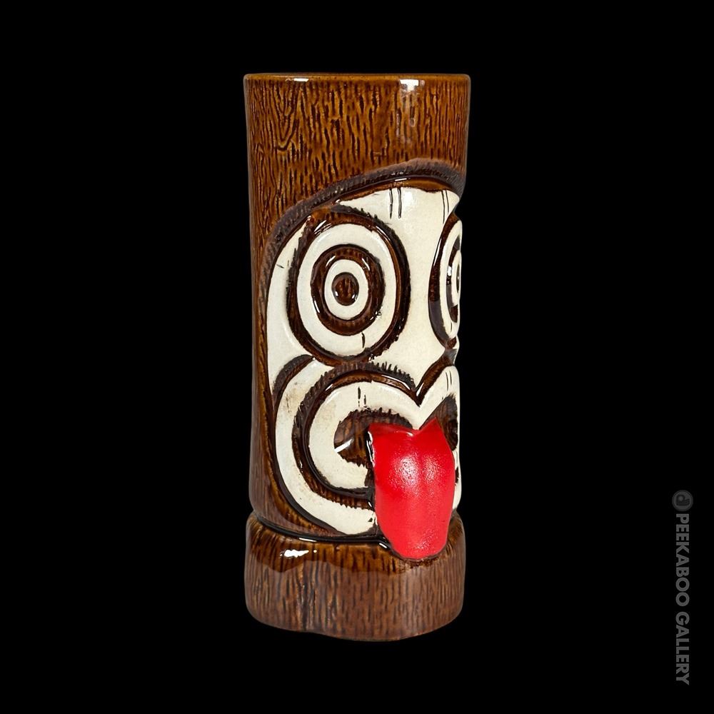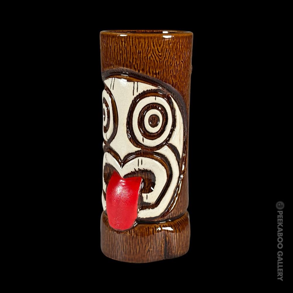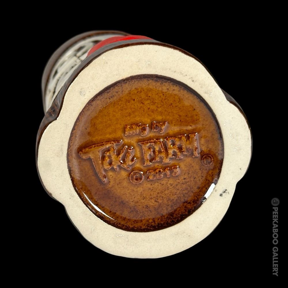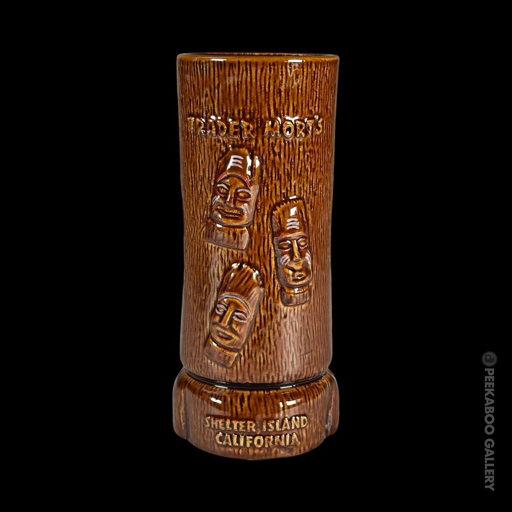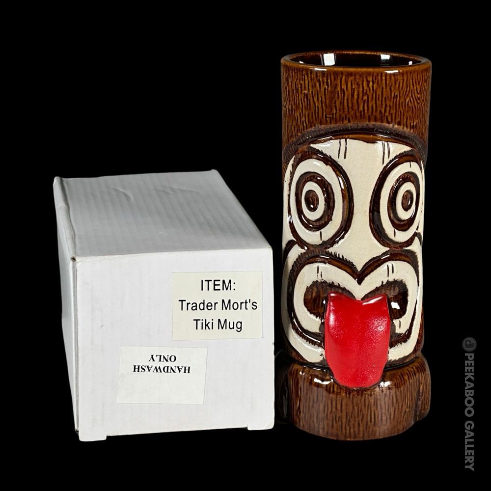 (2015) This version of the Trader Mort's mug was manufactured by Tiki Farm in 2015 and was a limited edition of 250. The mug features the face of the Maori style Tiki which still stands in front of Trader Mort's Liquor in Shelter Island, carved by Eli Hedley. VG+. 6.5"x2.75"dia.
