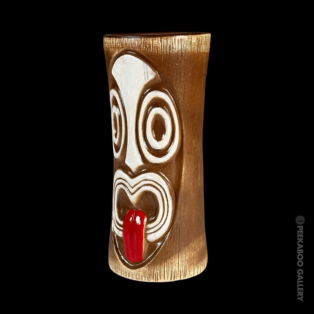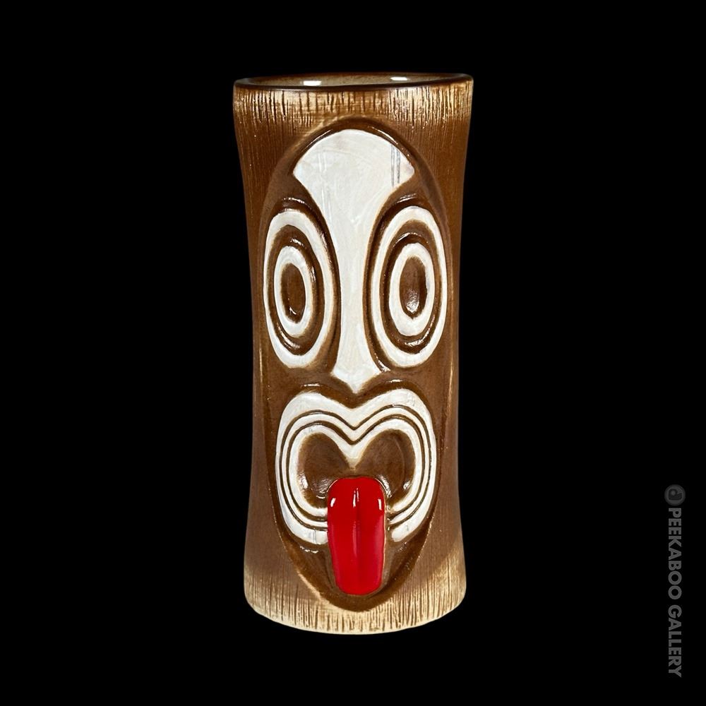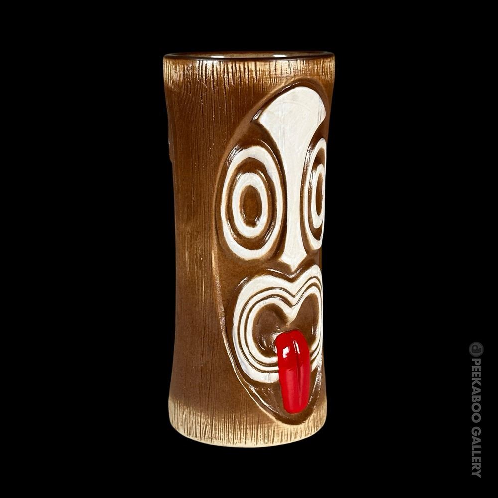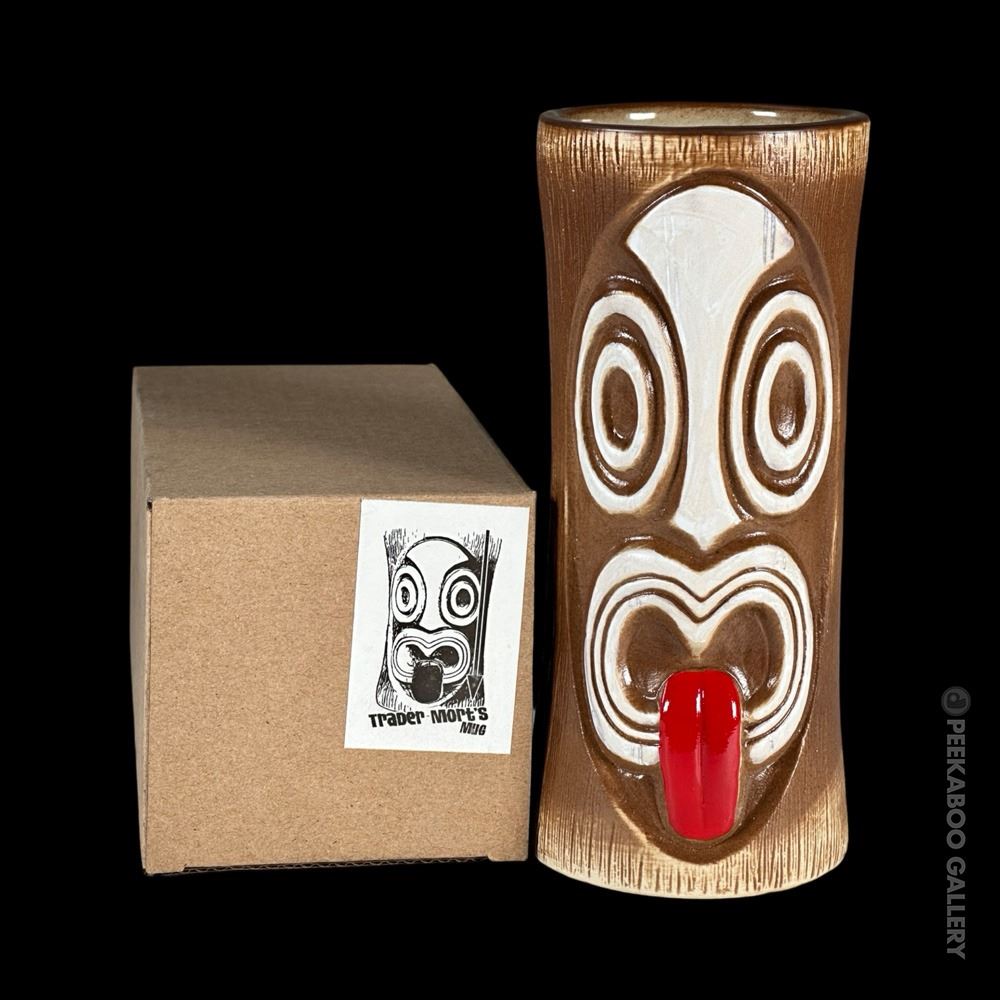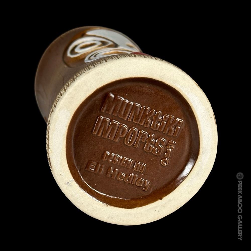 (2018) This second edition design was reissued in a different shade of brown glaze by Munktiki Imports for 2018. The face takes up more of the front of the mug and the eyes and face are a bit more elongated and oval. VG+. 7"x3"dia.