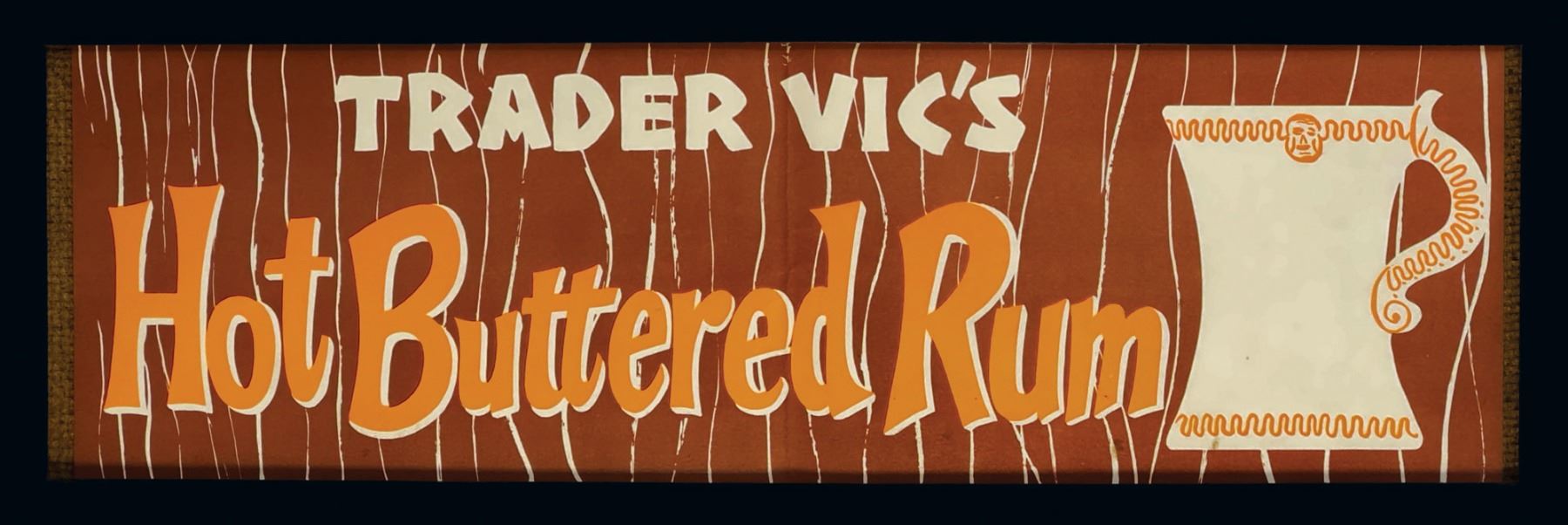 (1960s)* Vintage promotional banner for Trader Vic's. This piece was a staple of decor in Sven's Silverlake compound kitchen for many years! Framed. VG+.16.25"x5" sign, 17.75"x6" frame.