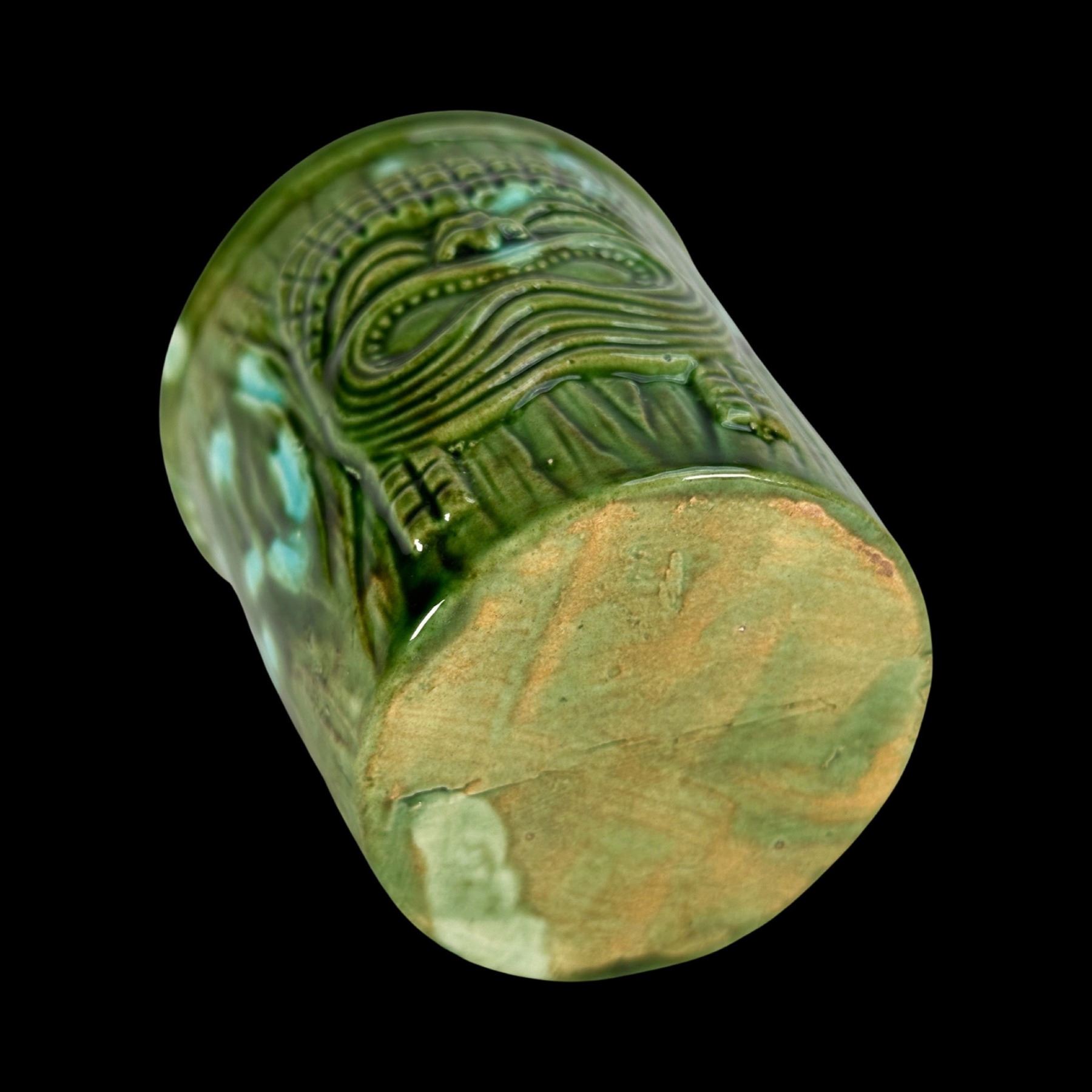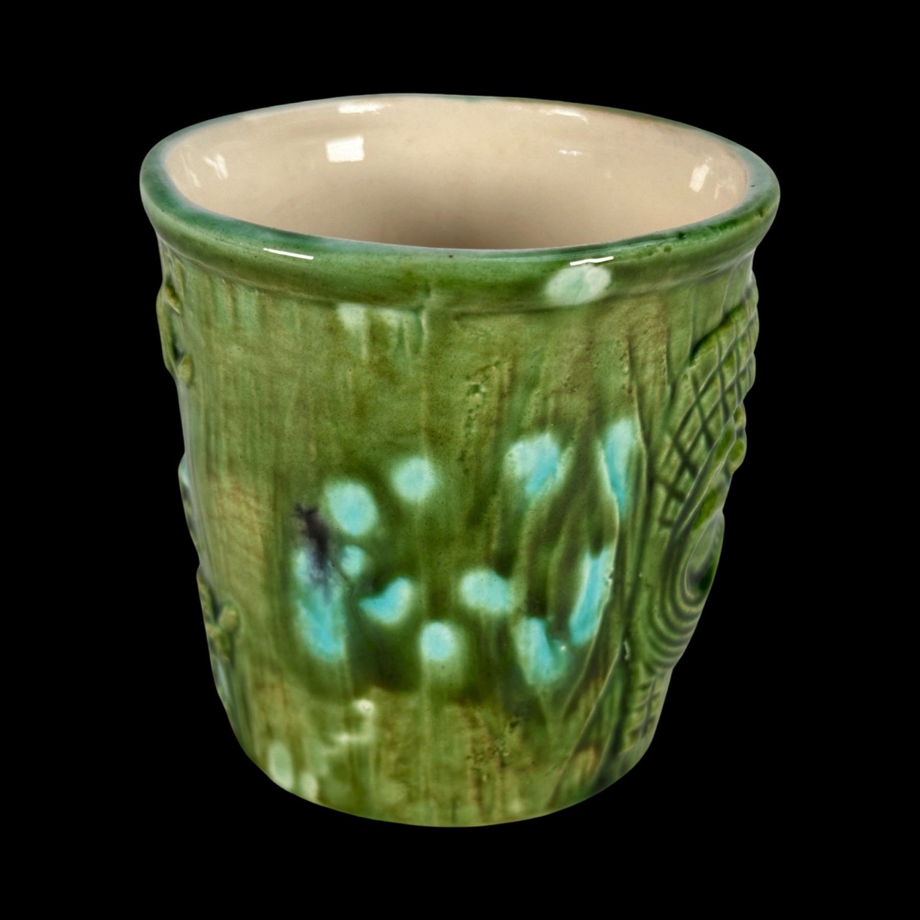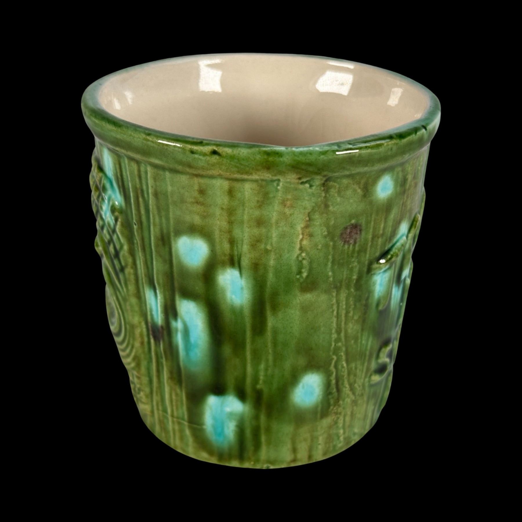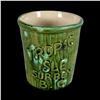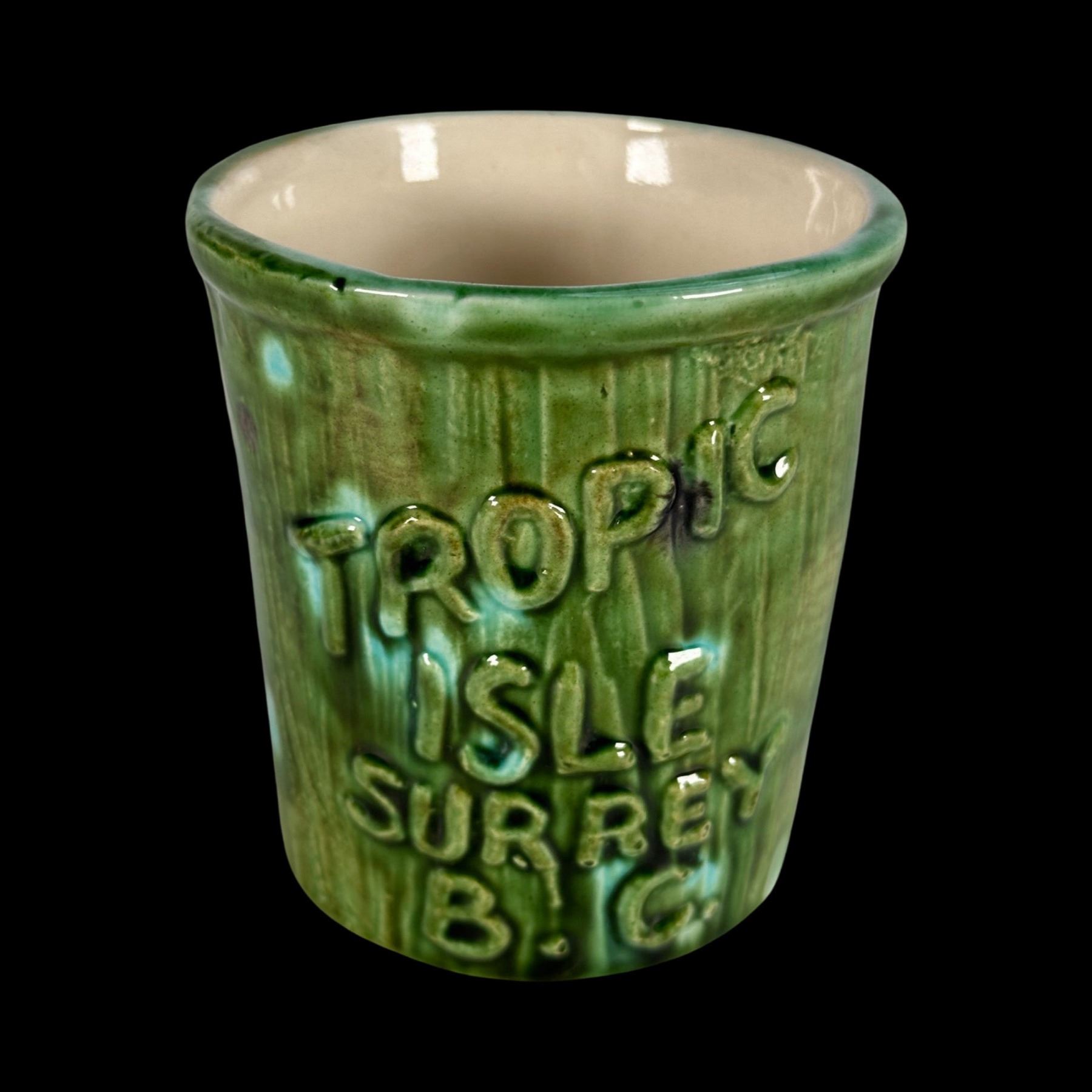 (1960s)* An odd mug which was molded off an Orchids of Hawaii barrel mug for the "Tropic Isle" in Surrey, British Columbia, Canada. VG+ with typical wear. 3.25"dia x 3.25".