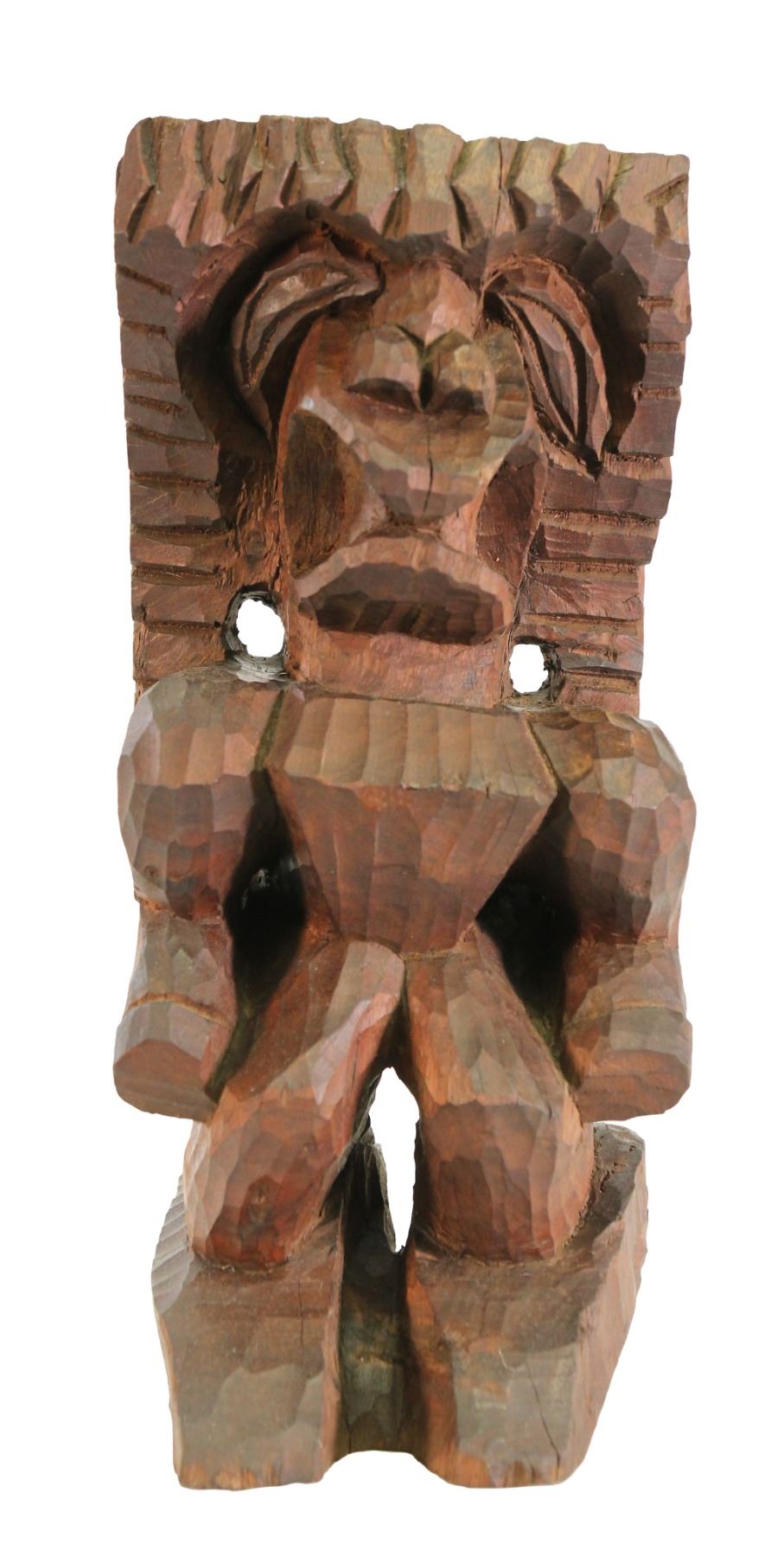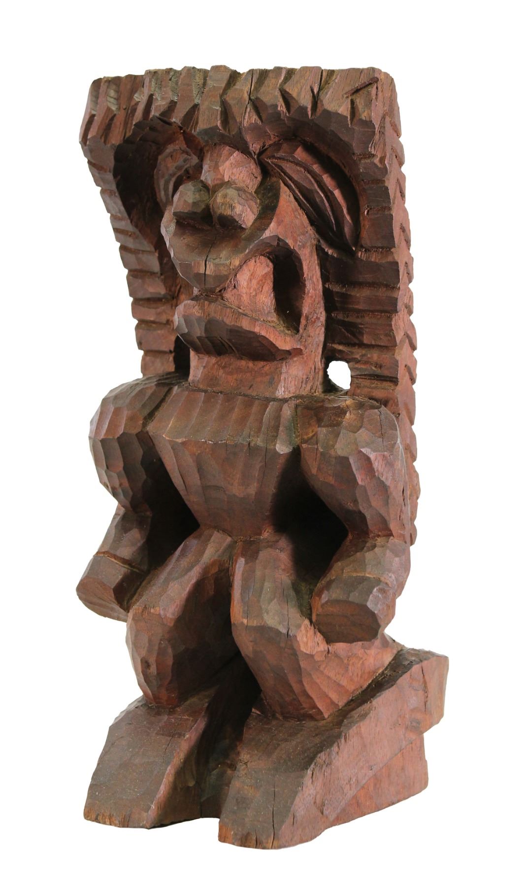 (1960s) The use of dark, natural wood enhances the depth of this hand carved depiction of Hawaiian Warrior God, KU. Wonderful design with large, overhanging feet on base. Solid wood. 14.5"x6.25"x6". VG+ with typical wear and small mount holes on back.