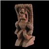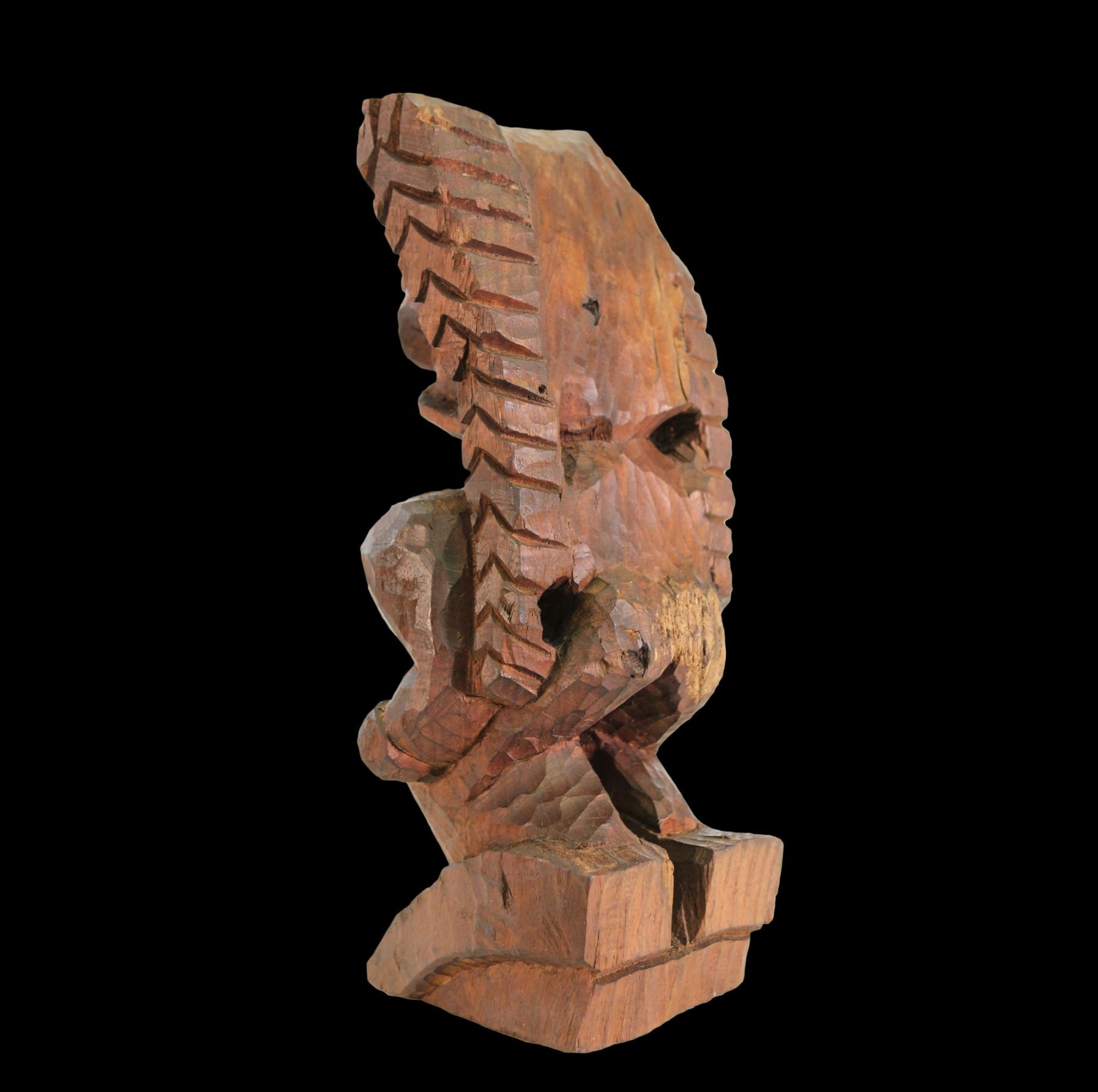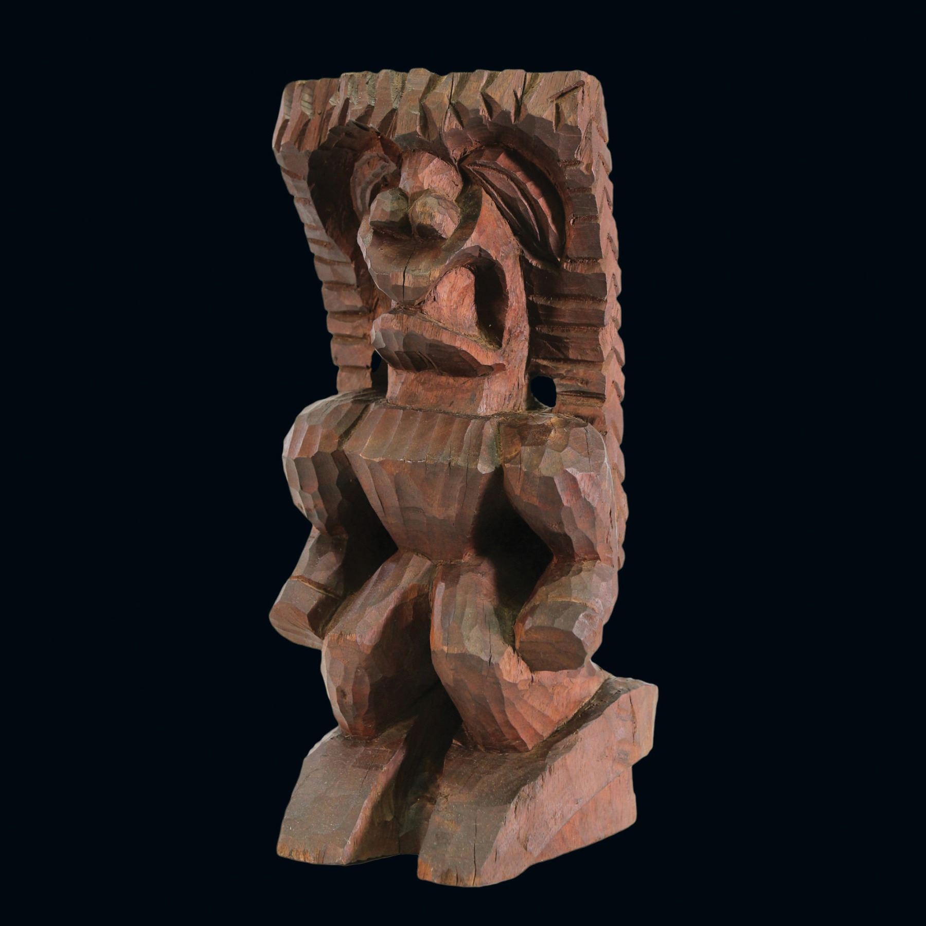 (1960s) The use of dark, natural wood enhances the depth of this hand carved depiction of Hawaiian Warrior God, KU. Wonderful design with large, overhanging feet on base. Solid wood. VG+ with typical wear and small mount holes on back. 14.5"x6.25"x6".