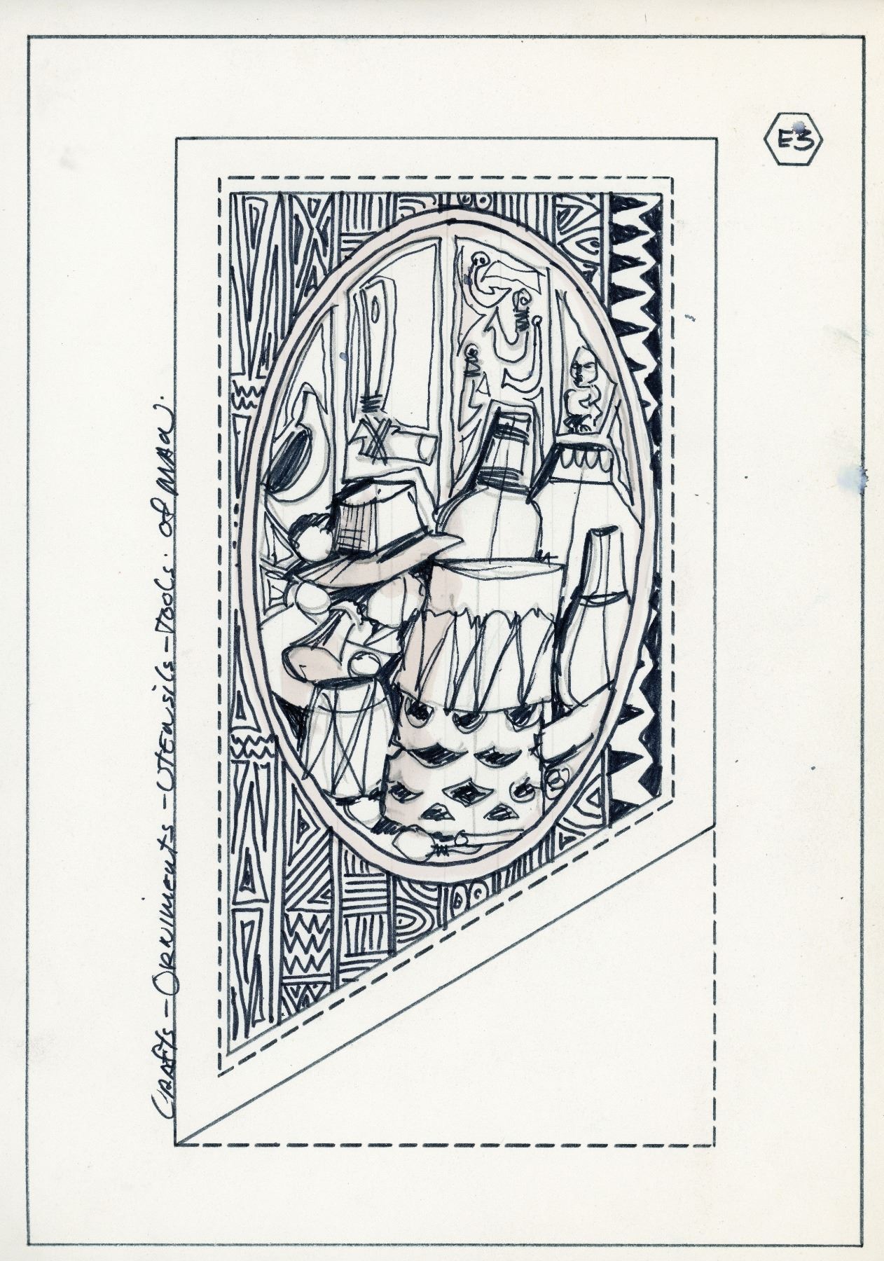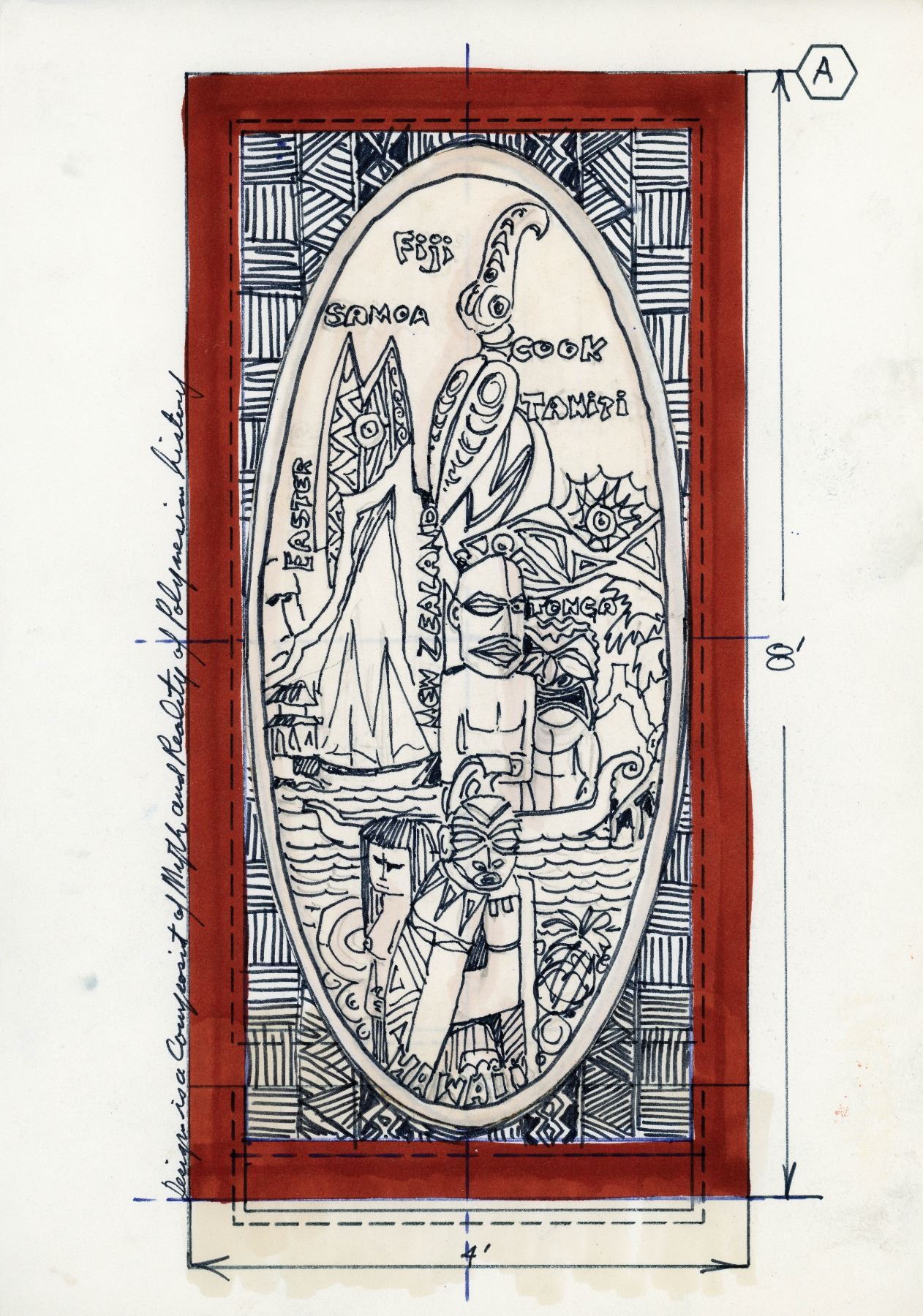 (1970s) At the tail end of the mid-century Tiki boom, perhaps the last truly epic development was the Marriott hotel chain's KONA KAI location at Chicago's O'Hare Airport. This restaurant and bar was as lavish as any Poly-Pop temple of the Golden Era in the late 50s-early 60s. A frivolously glorious amount of custom work was commissioned to Oceanic Arts in an attempt to keep the Tiki fires rolling. This Kona Kai location attempted to bring back the glory of their flagship location in Philadelphia, PA. OA created tikis, panels, lighting and all manner of signage for Chicago. These drawings in the next few lots represent a creative suggestion by LeRoy Schmaltz to add some 'South Seas panache' to the building's escalator stairway entrance leading to the main dining room. Using these drawings, LeRoy created massive 8-foot tall carved storyboard panels. The designs feature an elaborate series depicting "a composite of myth and reality of Polynesian history." Every one of these large panels were both designed and single-handedly carved by LeRoy Schmaltz. Here are his original ink design drawings. Absolutely a testament to both Kona Kai's commitment to Tiki and LeRoy's sheer creative audacity. 12"x8.5" each. VG+ with minimal wear.