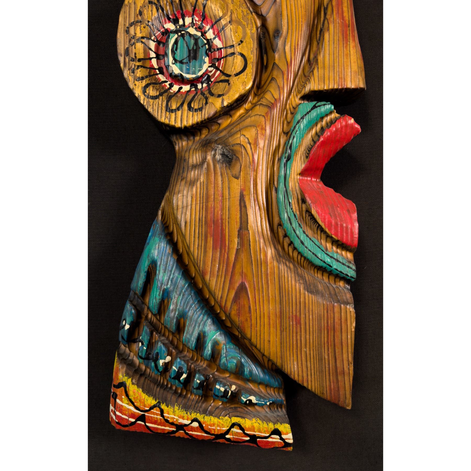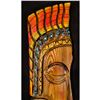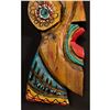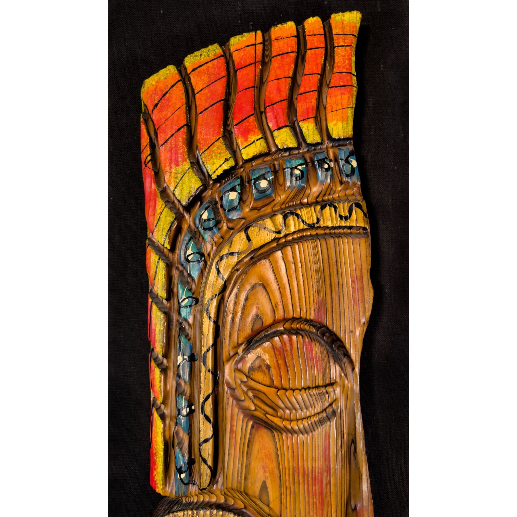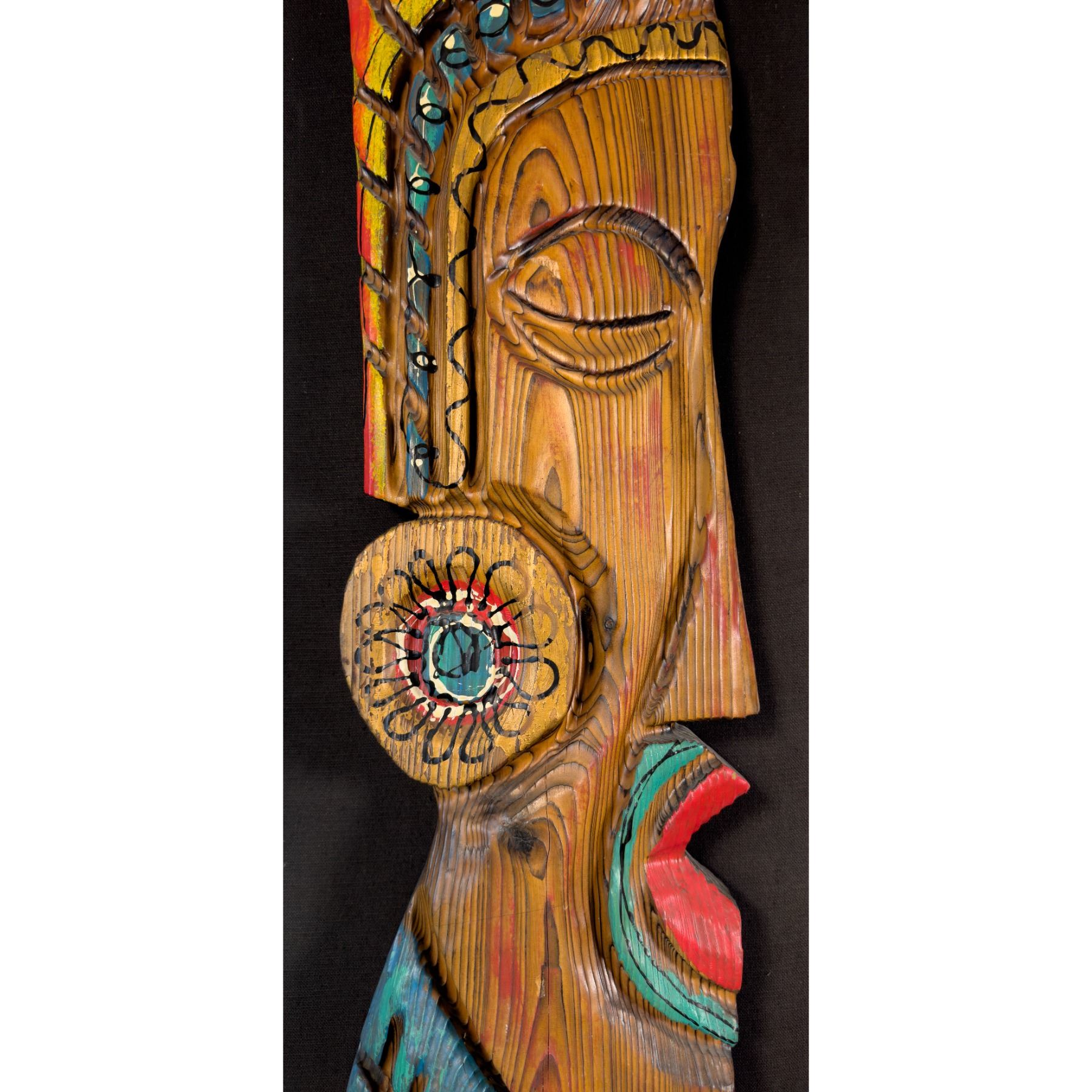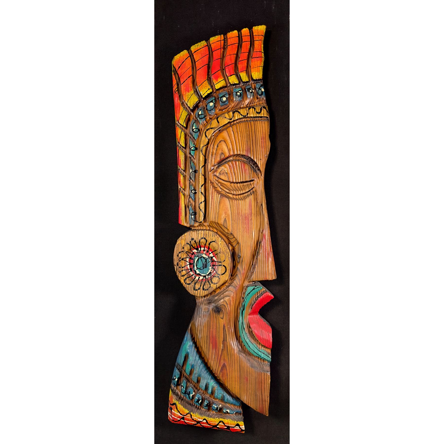 (1960s) Another super scarce WITCO piece. This South American styled Tiki type on profile is beautifully painted with gold accents. The figure is mounted on a black linen background on board for wall display. The headdress and decoration is one of the most colorful WITCO designs we have encountered. 15"x47.75". VG+ with typical wear.