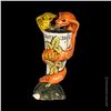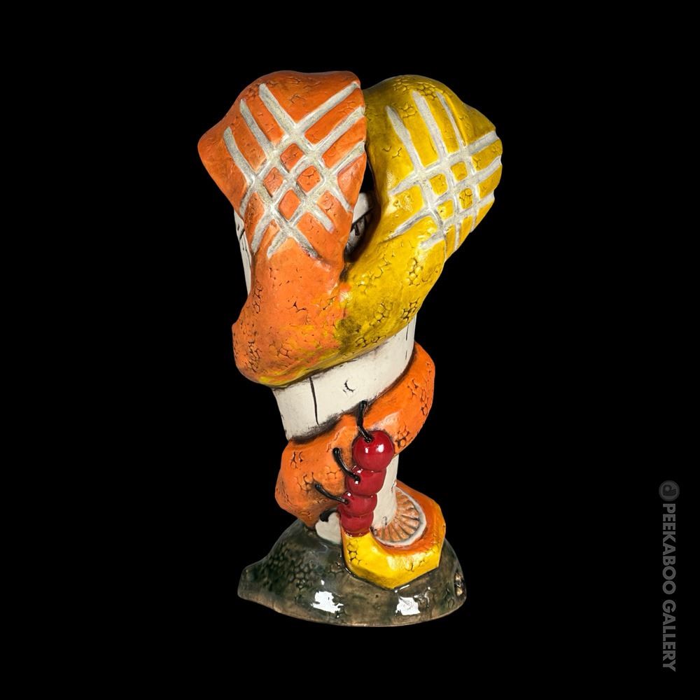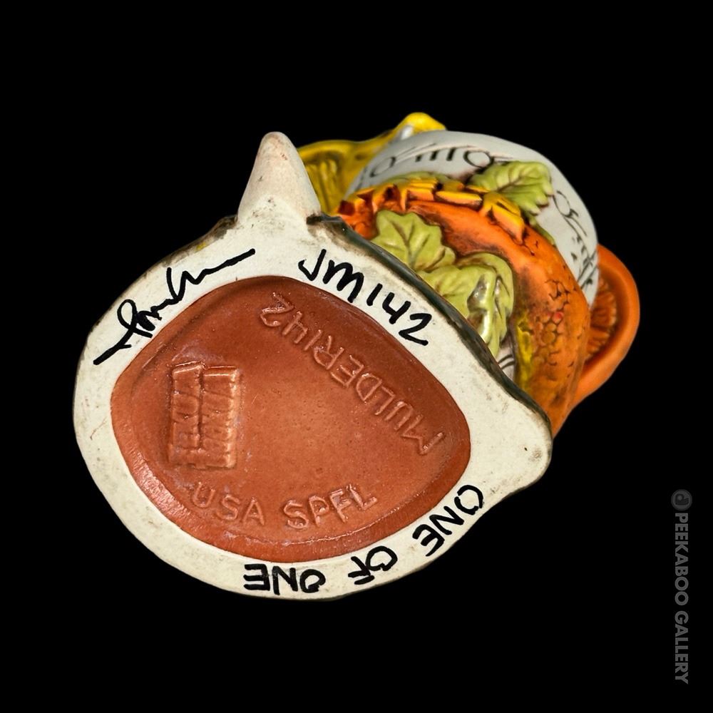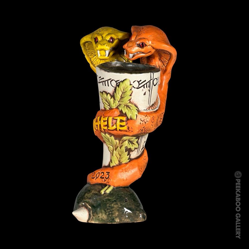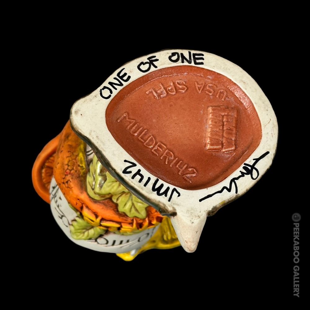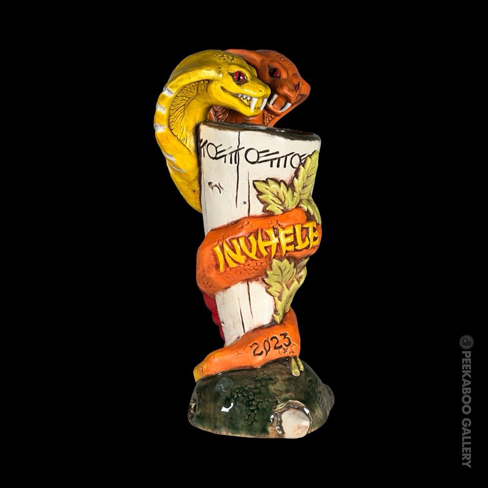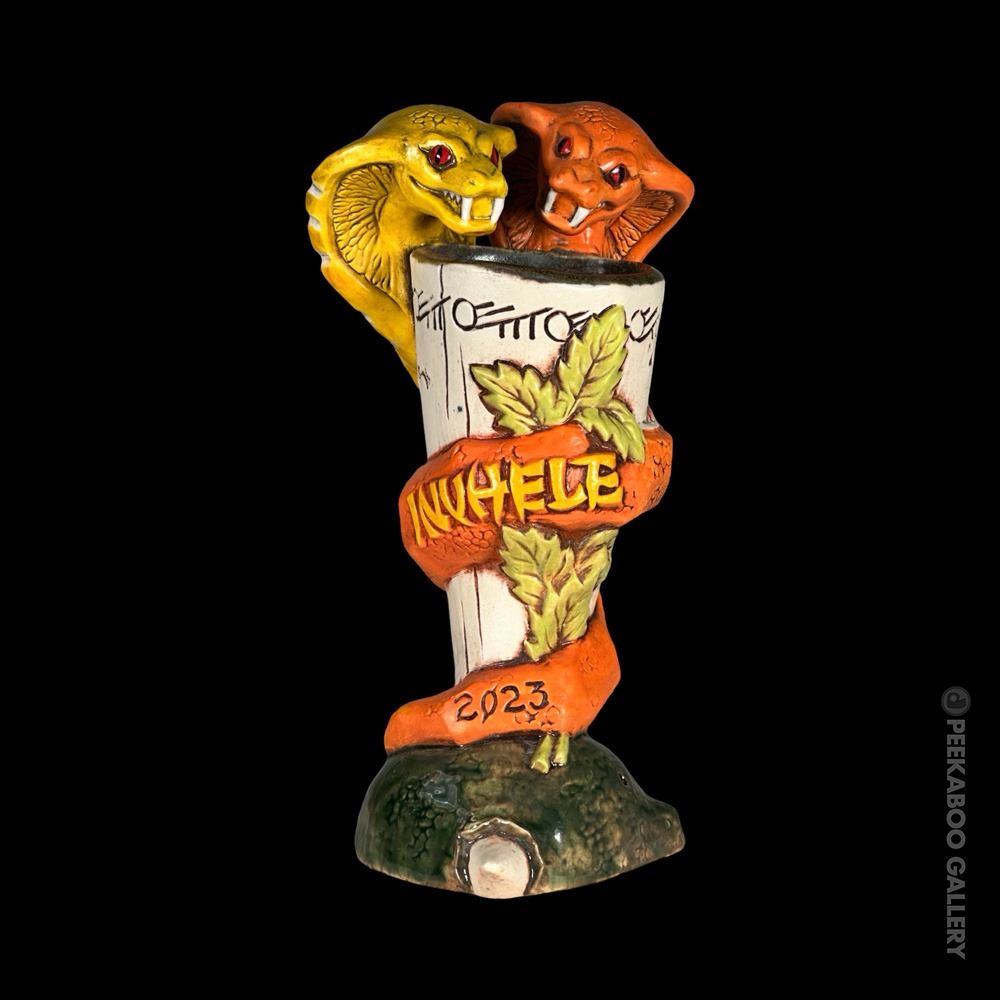 (2023) A one-of-a-kind custom mug by master sculptor, John Mulder This massive mug was based on the design for Inuhele 2023 event mug. It had two separate color options for the single cobra on each mug. This beauty combines the two original colorways (orange cobra with yellow lemon half on bottom and a yellow cobra with green lime half on bottom) into a two-headed cobra. Signed and numbered on bottom 1 of 1 by John Mulder. VG+. 9.5"x6"dia.
