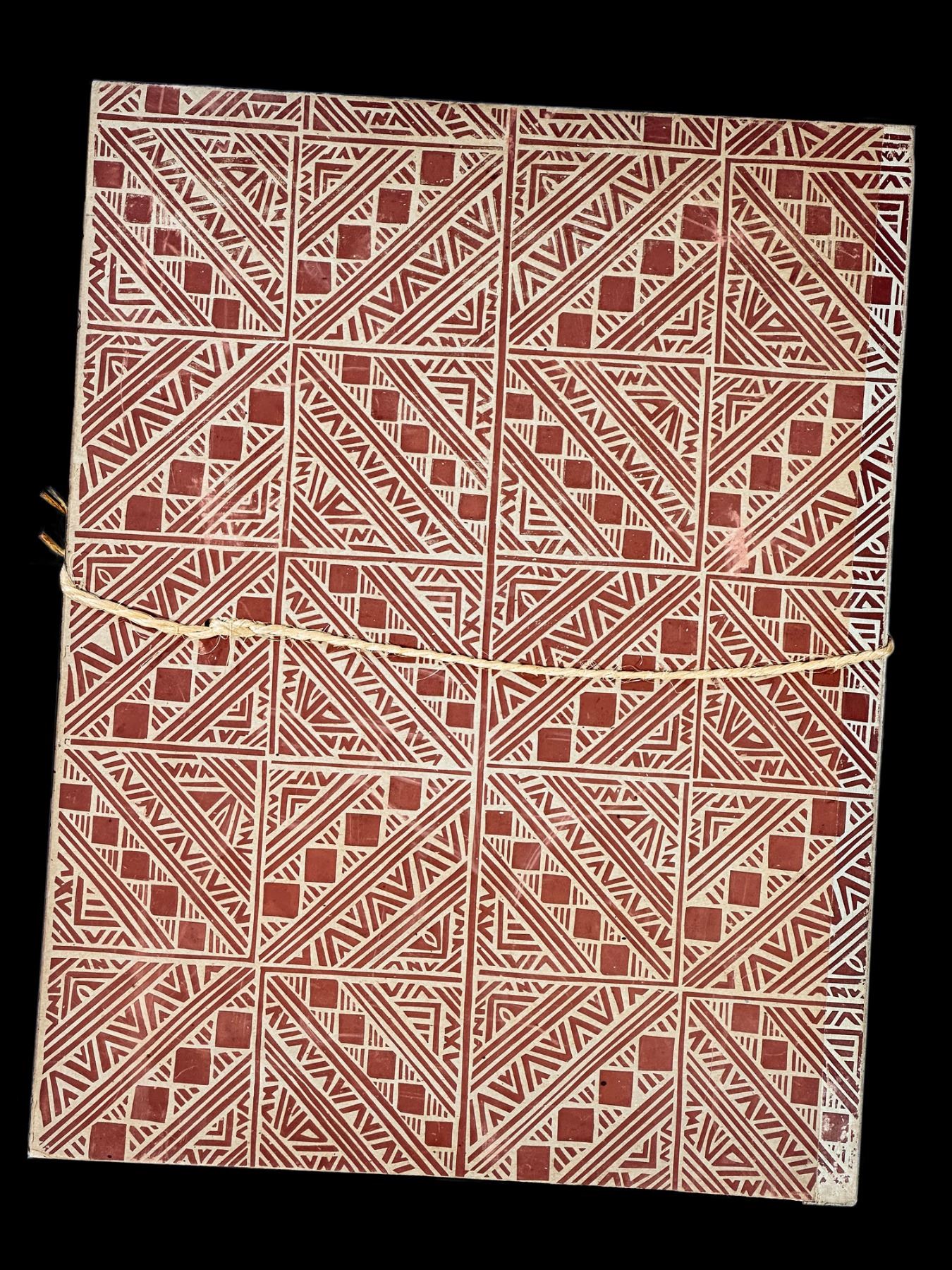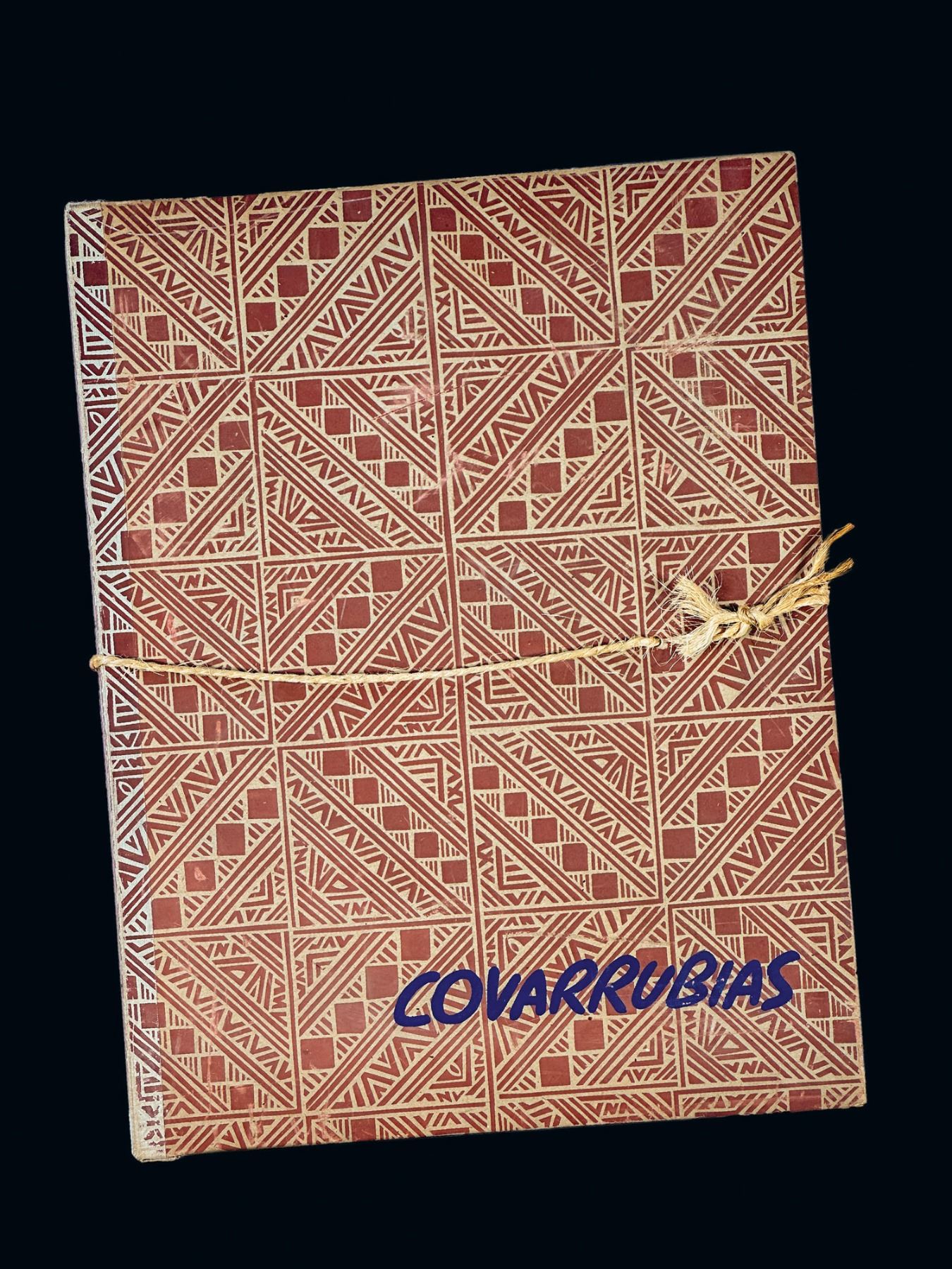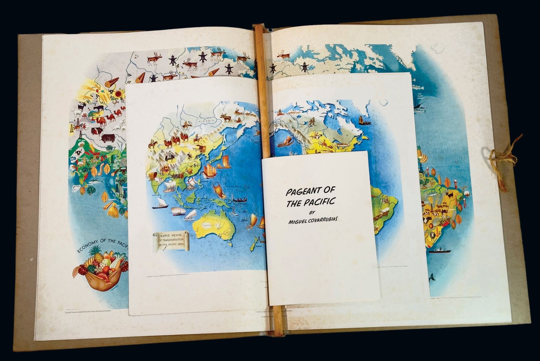 (1940) As noted in the previous lot, here is one of the most sought after items in Covarrubias, World's Fair and Pacifica collecting: The full "Pageant of the Pacific" portfolio is exceedingly rare. In 1940 dollars, this was an expensive item reserved for high-end fine art clientele. The only way to get one of these prints was when someone broke up their set of the six lithographs that came with the set. Maps included: plate 1. Peoples of the Pacific; plate 2. The fauna and flora of the Pacific; plate 3. Art forms of the Pacific area; plate 4. Economy of the Pacific; plate 5. Native dwellings of the Pacific area; plate 6. Native means of transportation in the Pacific area. The large portfolio boards are silk screened with a brown tapa pattern and Covarrubias' name in blue ink. The prints are held in by a wood spine dowel. Also present is the 10-page Pacific House Pageant of the Pacific booklet. OVERALL VG+ with some areas of discoloration around the dowel fold and light foxing. Apparently unissued. Portfolio:40.5"x26" open. Plates 1-1V measure approximately 38" x 25" ; plates V-VI measure 25" x 19".