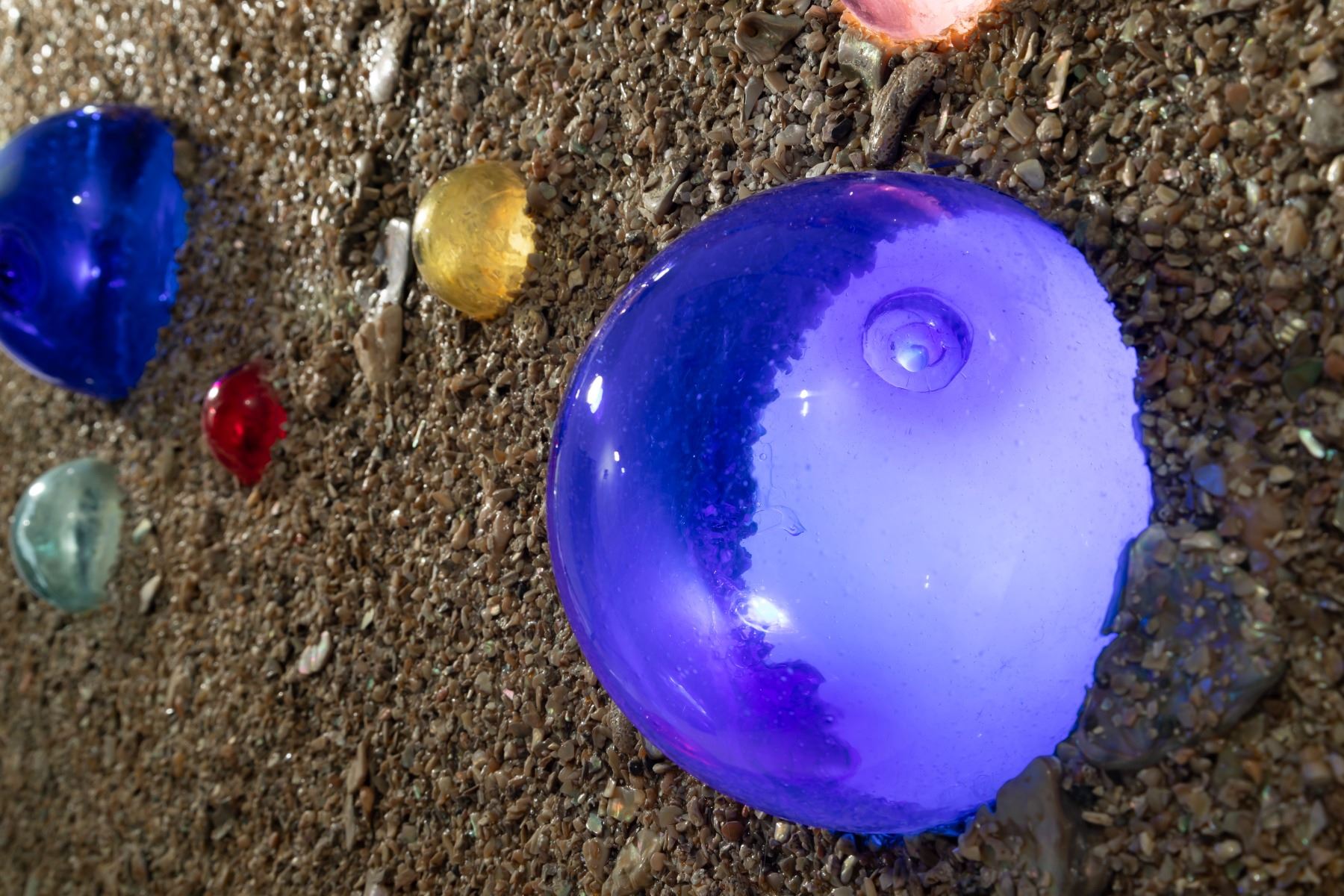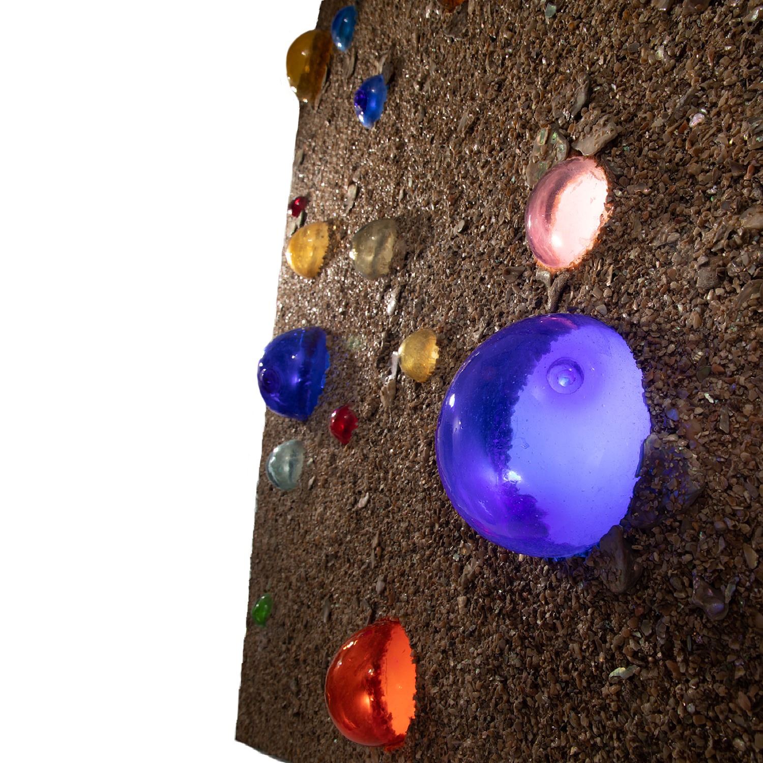(1959) An incredible piece of Poly-Pop history! This is one of the famed Abalone Screens made by Schmaltz & Van Oosting (Oceanic Arts) for The Coco Palms Resort on Kauai. However, before that, this larger style was used at the seaside venue of TIKI-JO at the Hotel Miramar in Santa Monica, California. The place was ahead of its time and featured incredible decor by Eli Hedley, Cargoes by Carter and Schmaltz & Van Oosting. See the reference photo of a similar abalone screen in situ with the Tiki-Jo signature Tiki by Hedley. This large piece was made to be suspended allowing light to shine through the embedded Japanese glass fishing floats. Crushed abalone covers the surface on both side. Absolutely stunning! 40"x60". VG+ with typical wear and minor chipping throughout.