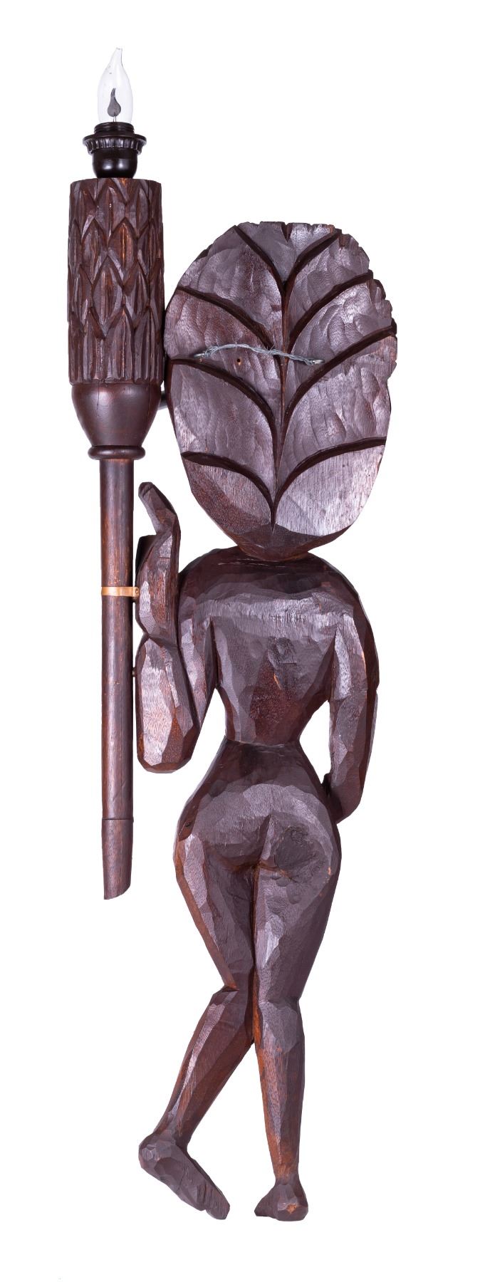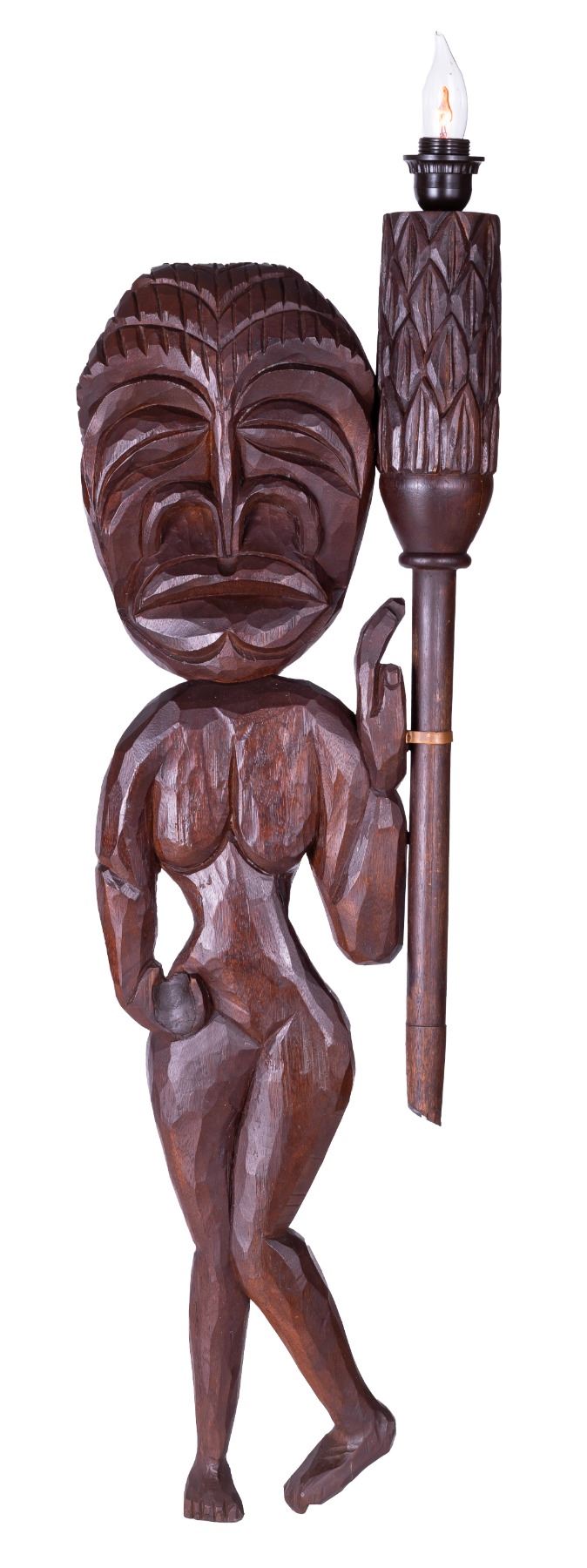 (1950s) The female companion to the previous lot from Don the Beachcomber - Waikiki, Hawaii. Electrically rewired and restored by Oceanic Arts, Whittier, CA. Acquired in the famous Don the Beachcomber liquidation sale. Solid wood with electric fixture and cord. 36.5"x11.5". VG+ with typical wear from commercial use.