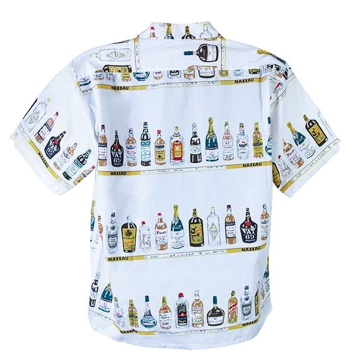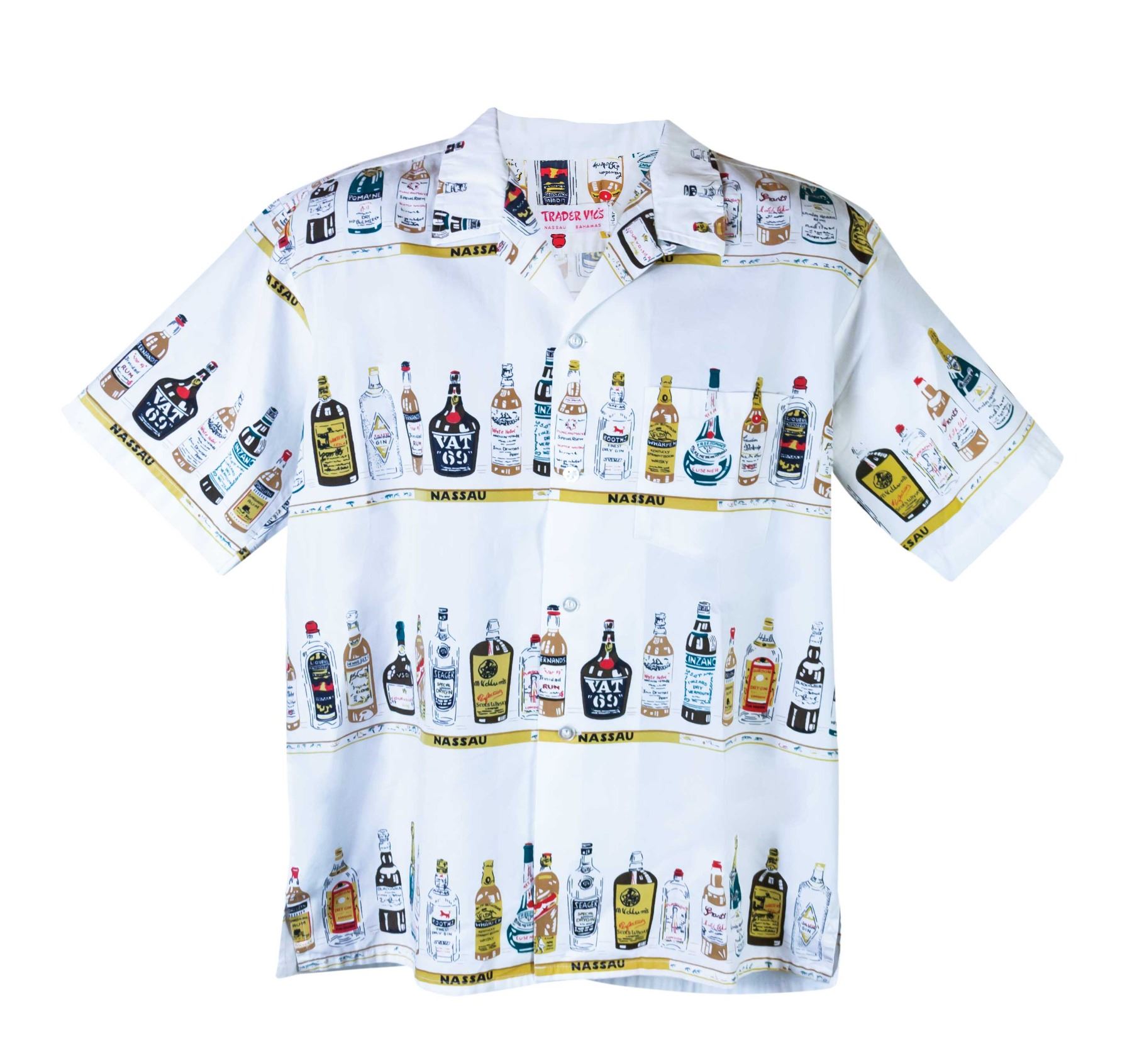 (1950s) A very rare employee men's shirt from Trader Vic's Nassau location in the Bahamas. It features various liquor bottle illustrations throughout the shirt. Very rare. Cotton. Mens Shirt. Chest 24" across, Length 25". VG+ with minor wear.