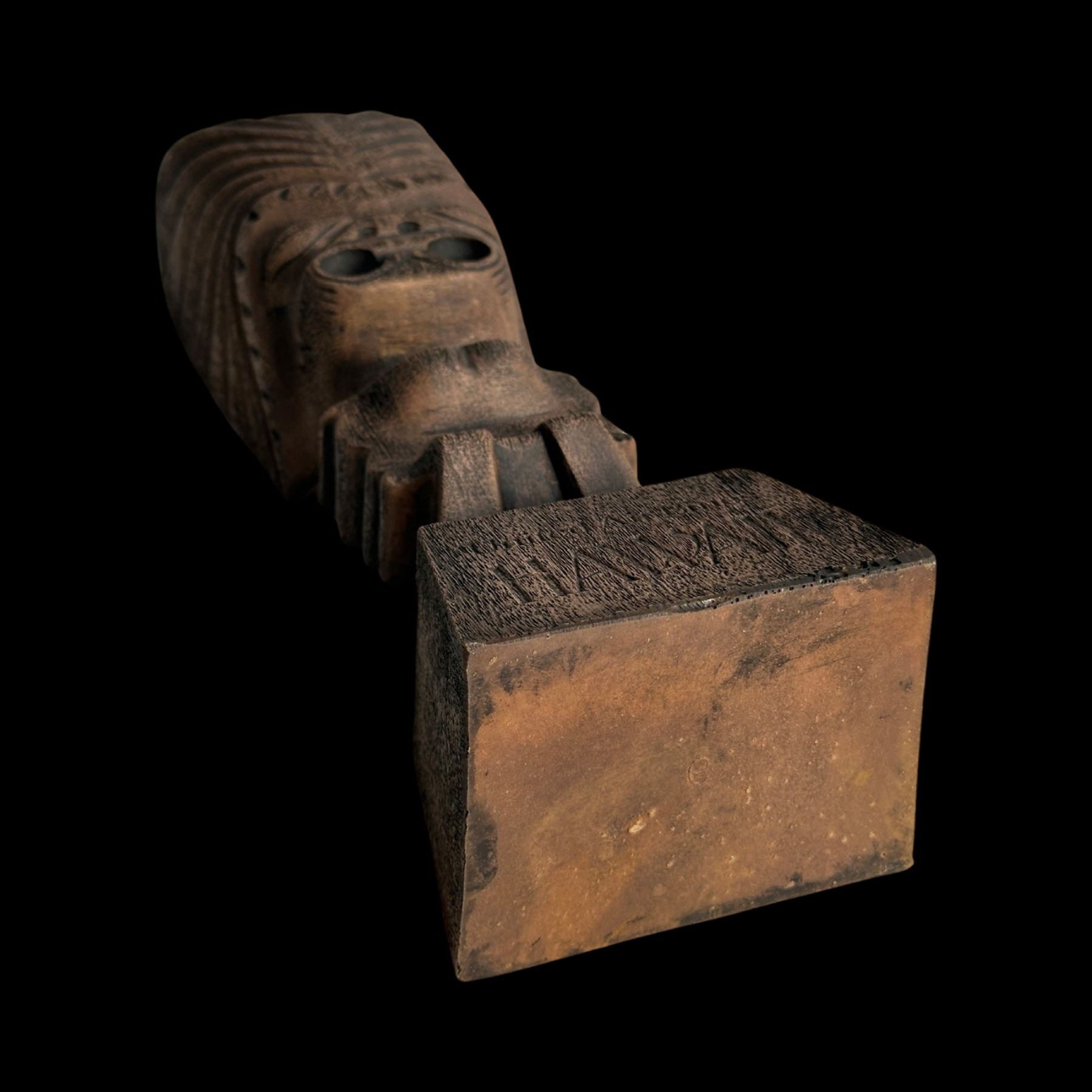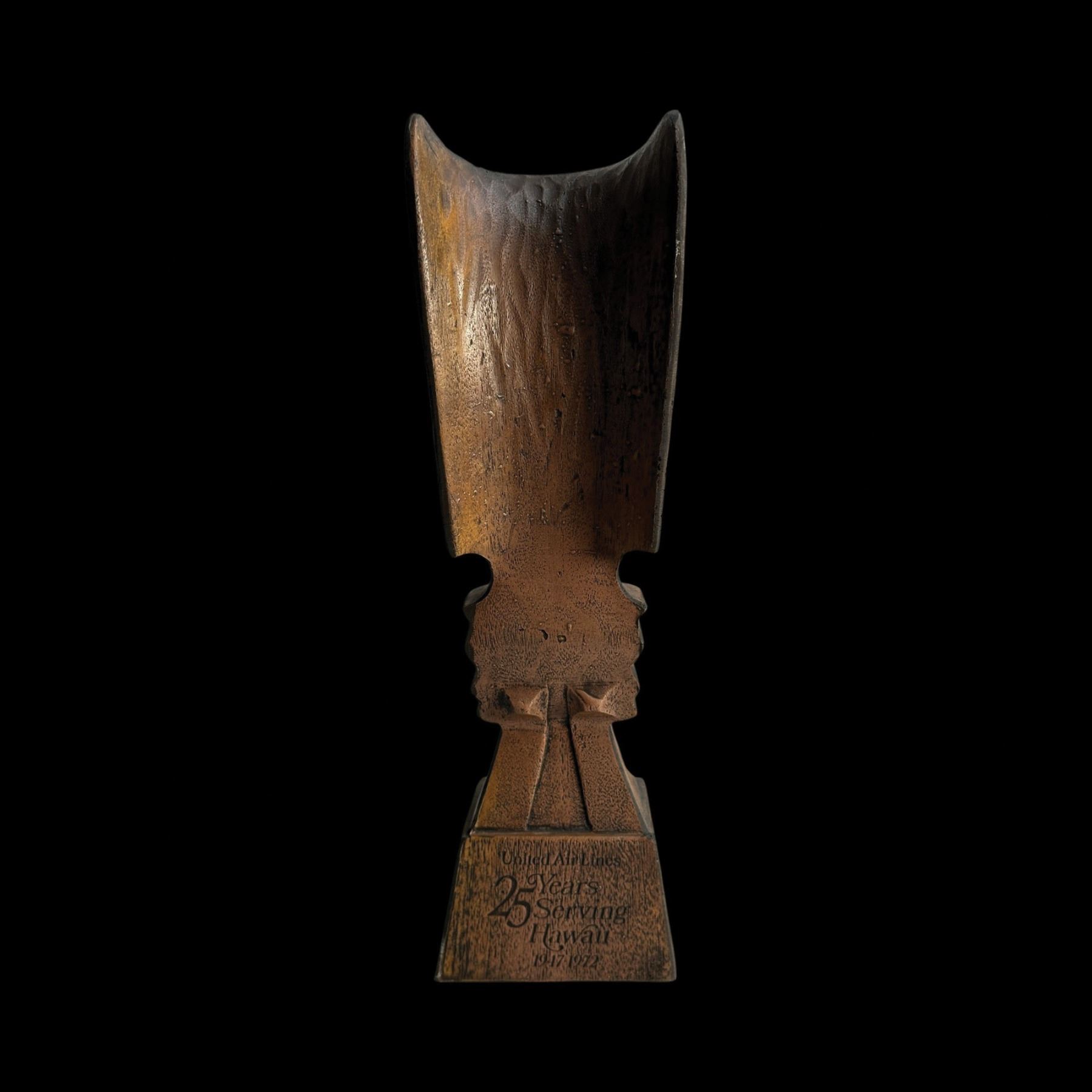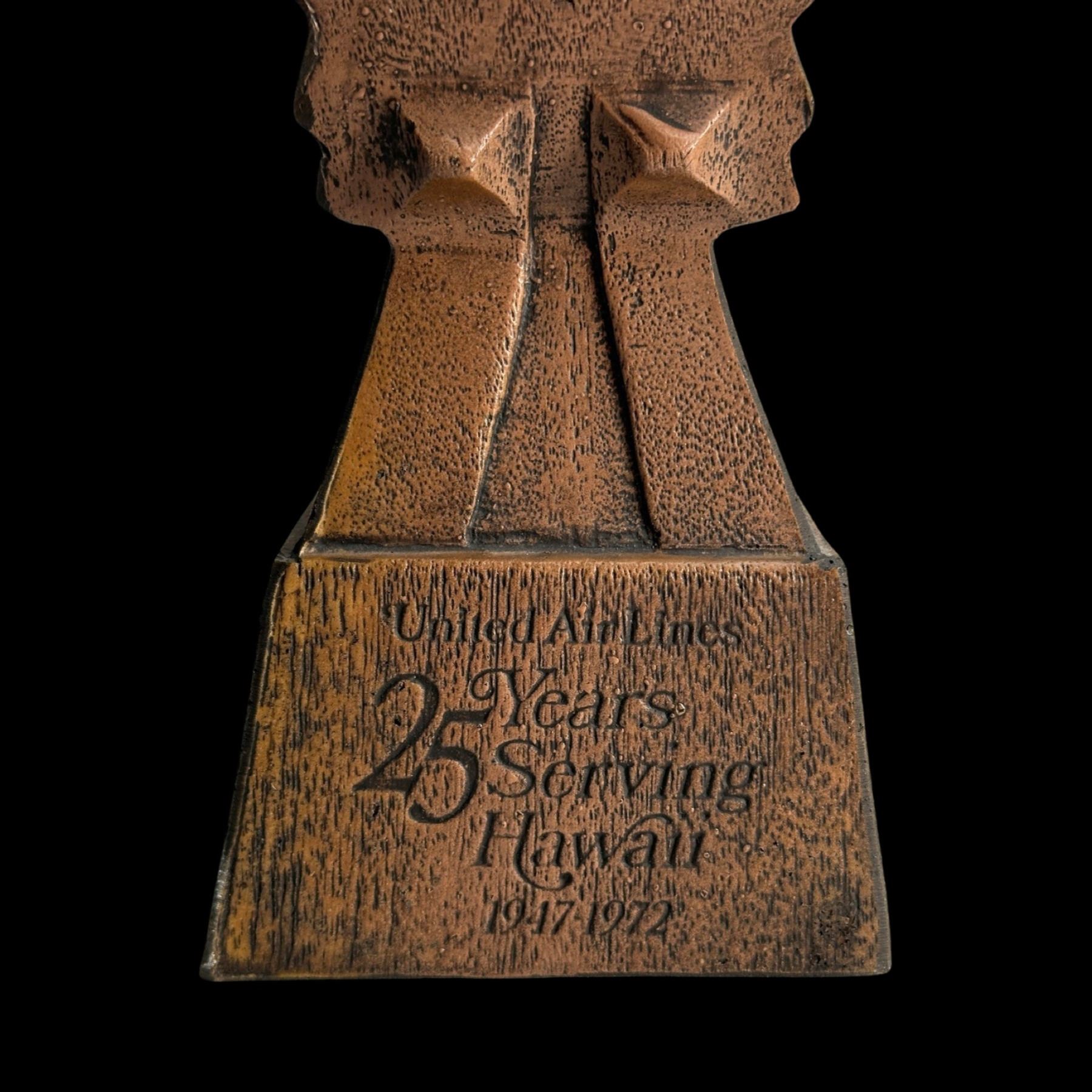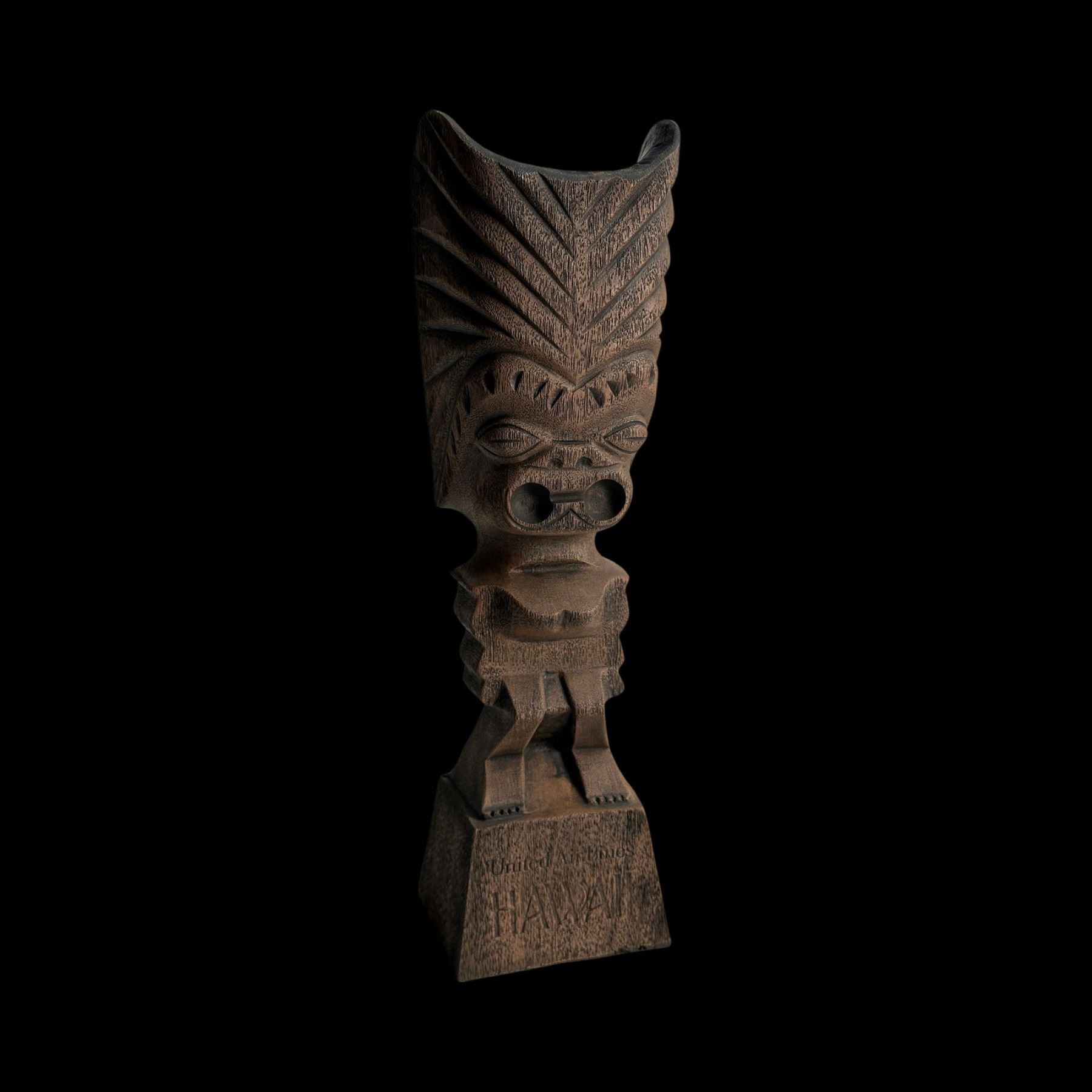 (1970s) The 70s marketing of United Airline was spot on. A figural composite Tiki on base. VG+. 4.25"x15"x3.5".
