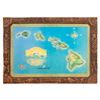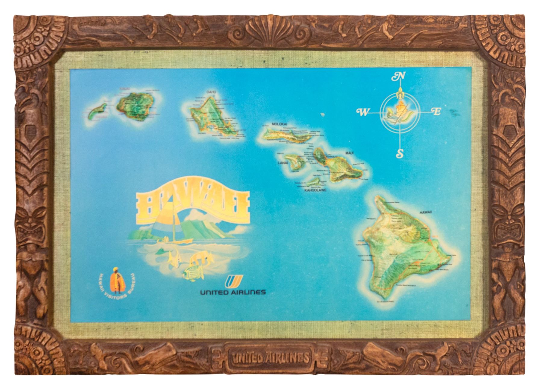 (1960s) United Airlines sponsored detailed 3D map of the Hawaiian island features raised plastic individual islands with names of cites. Awesome carved frame featuring native Hawaiian islanders, Tikis, florals, and symbols. 36"x25.25". VG+ with minor wear and light fading.