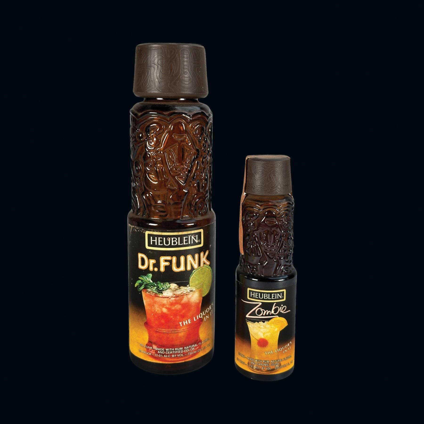 (1970s)* Zombie retains liquid, Dr. Funk is empty. Features a Sven address tag. VG+. 2"dia x 7" Zombie, 3"dia x 10.5" Dr. Funk.